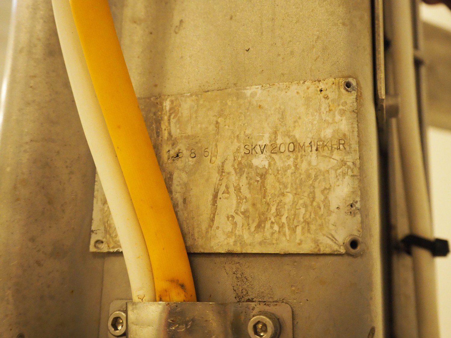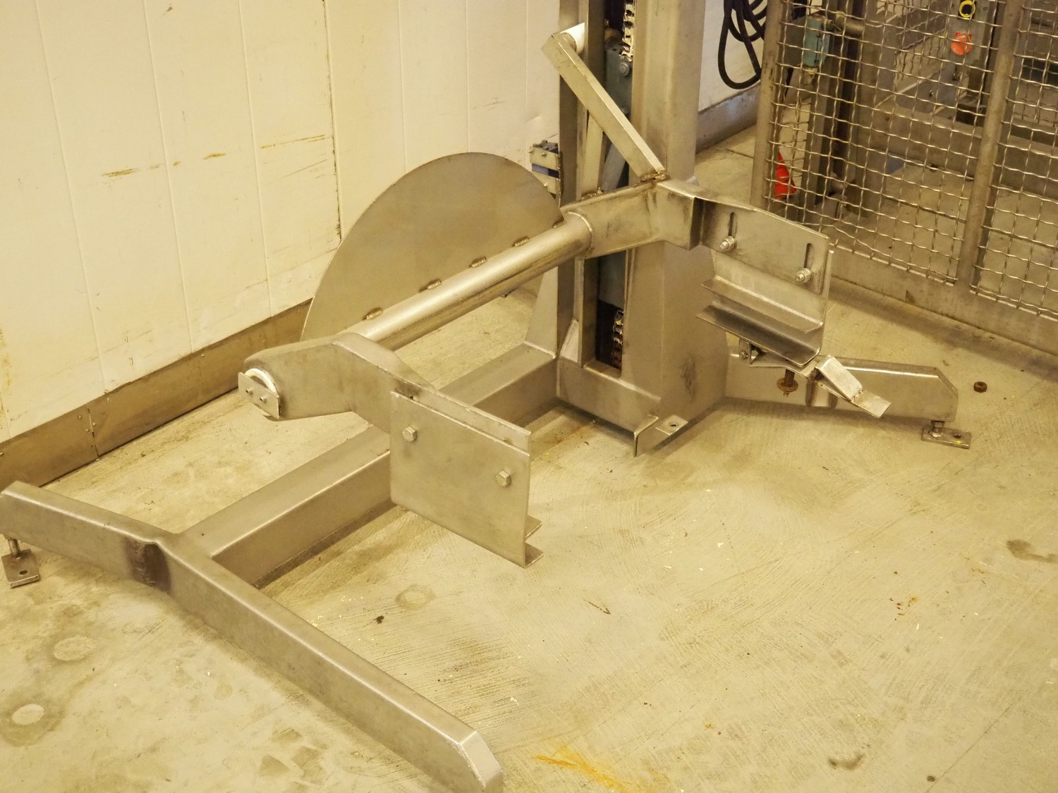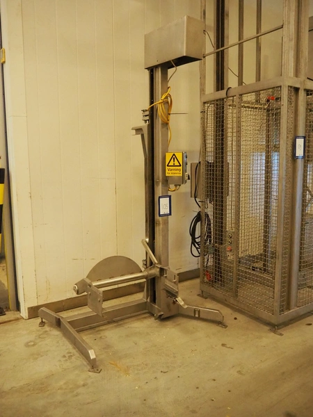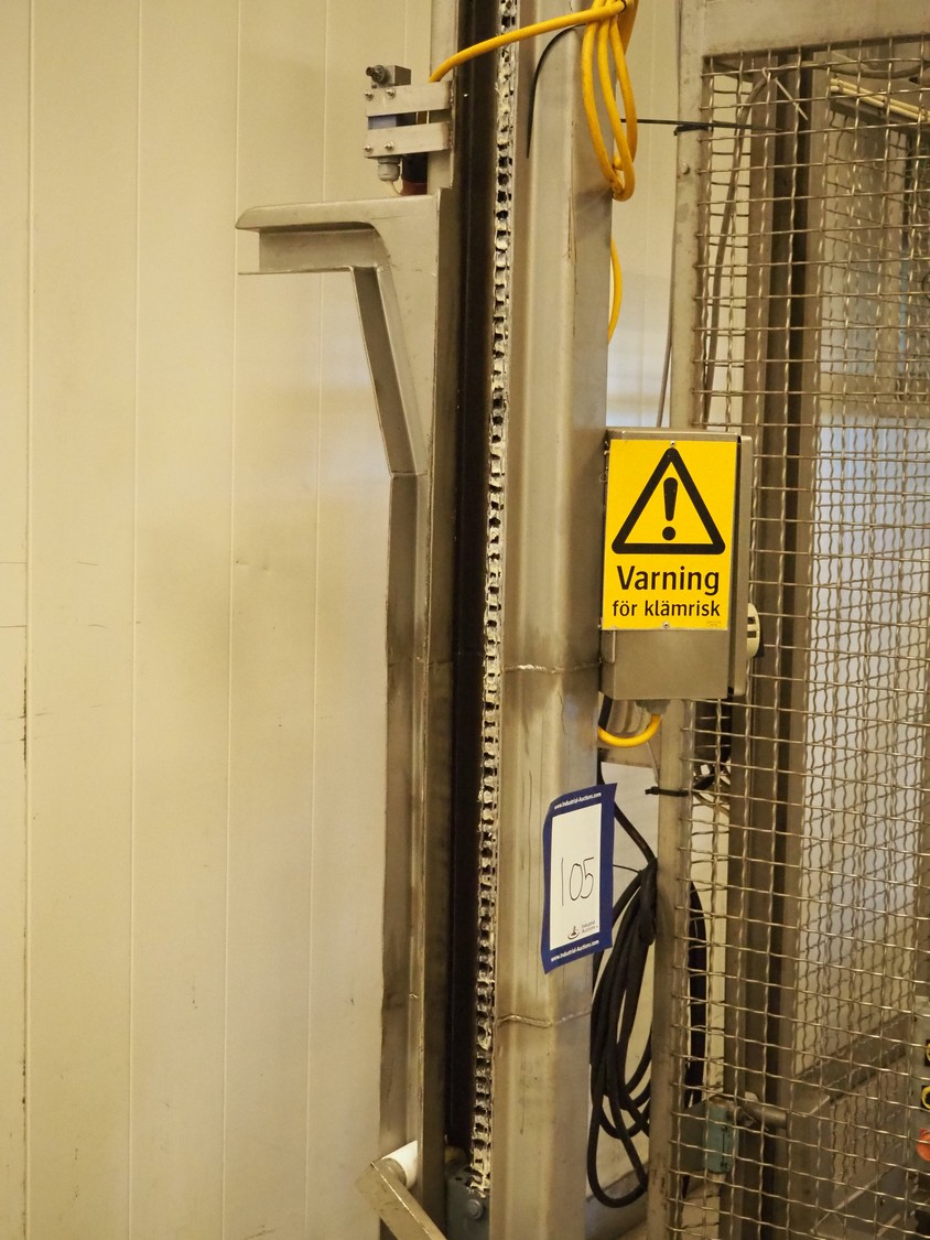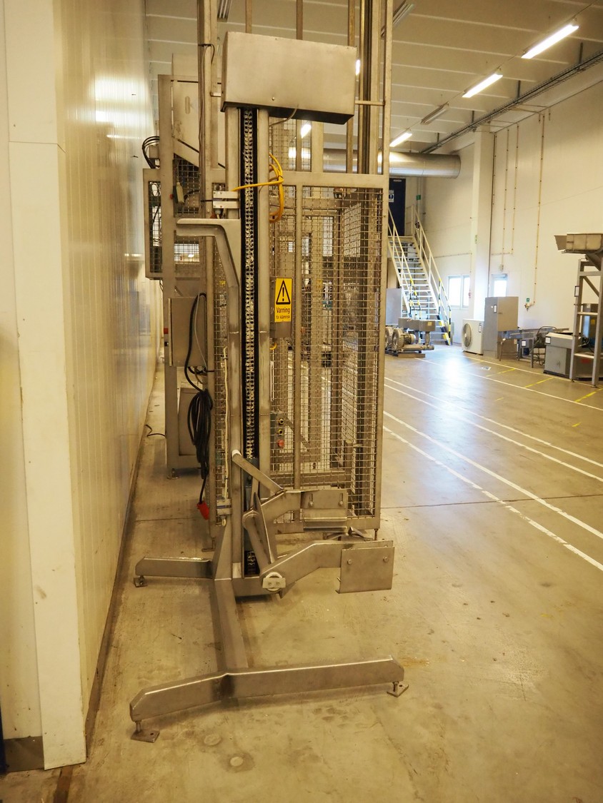 Lifter for 200 liter meat bins, type: SKV200M-1-PKHR, serial number: 1686, lifting height: 1810 mm, total dimensions: 1400 mm x 1100 mm x 2700 mm.