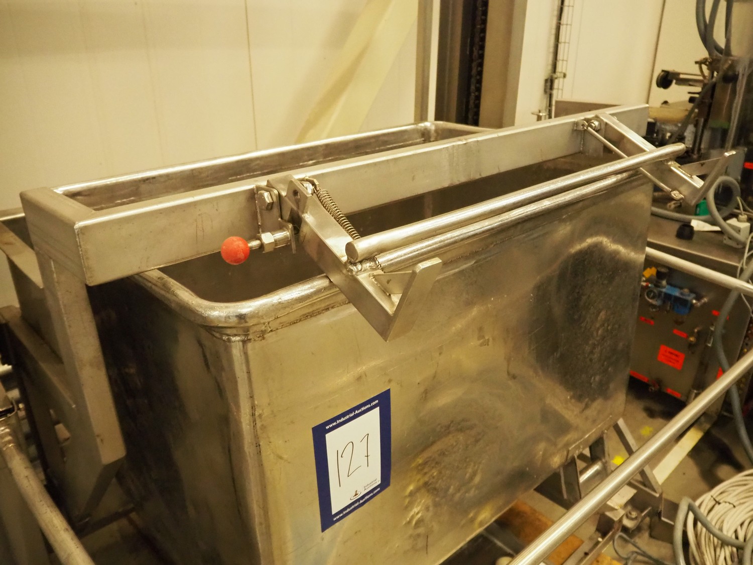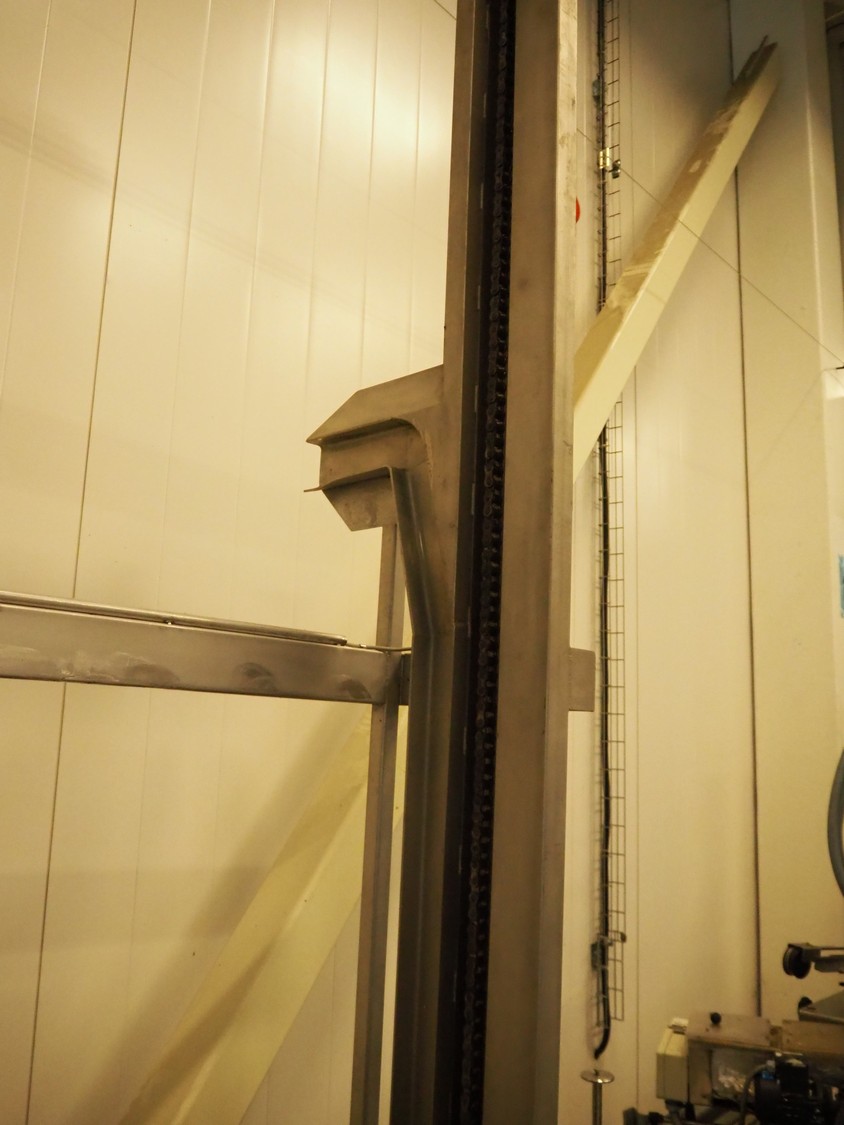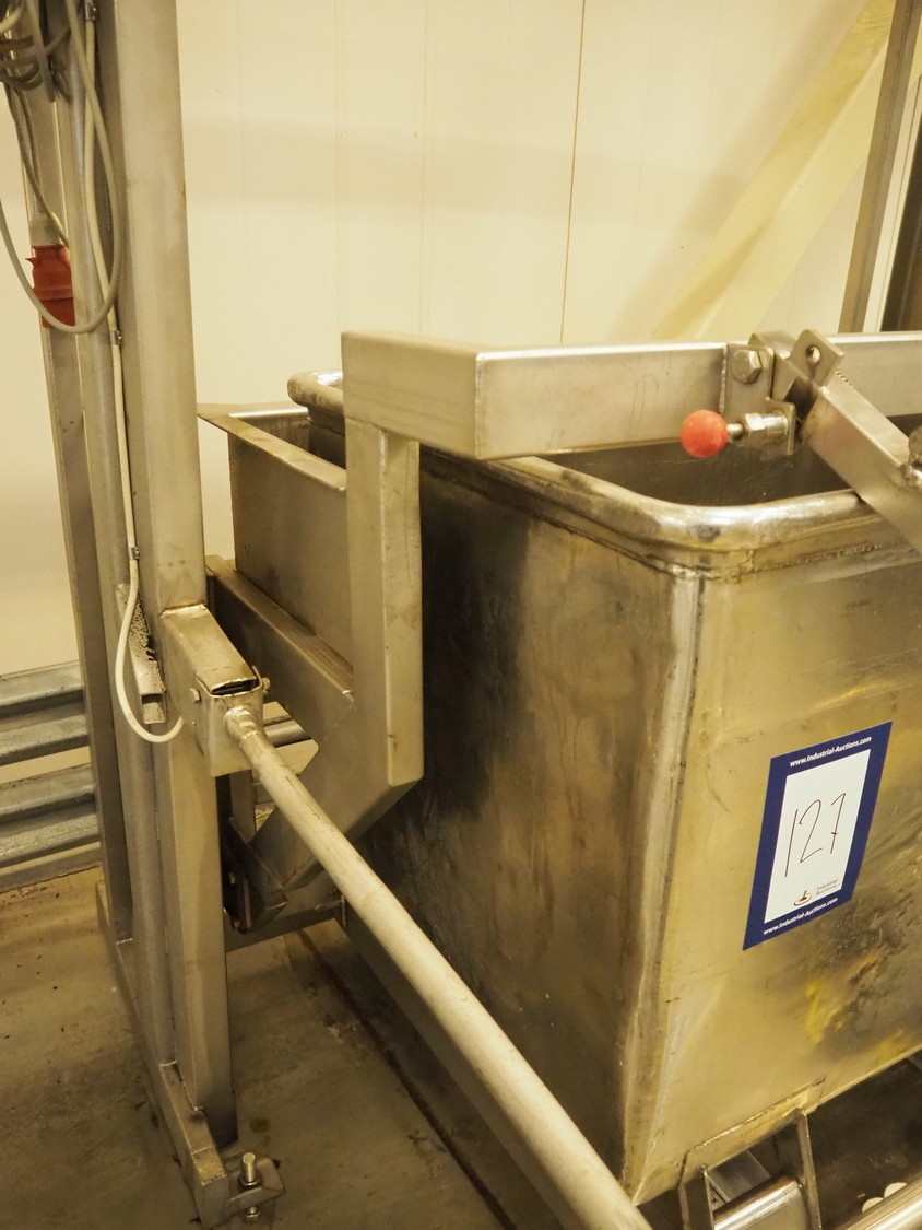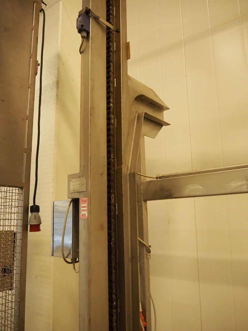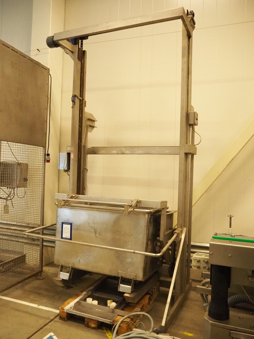 Nimo KG s/s lifter for pallet boxes and tubs, type: SK800 MKR, number: 5131, lifting height: 2330 mm, maximum dimensions boxes: 1250 mm x 900 mm x 850 mm, total dimensions: 1700 mm x 1550 mm x 3600 mm.