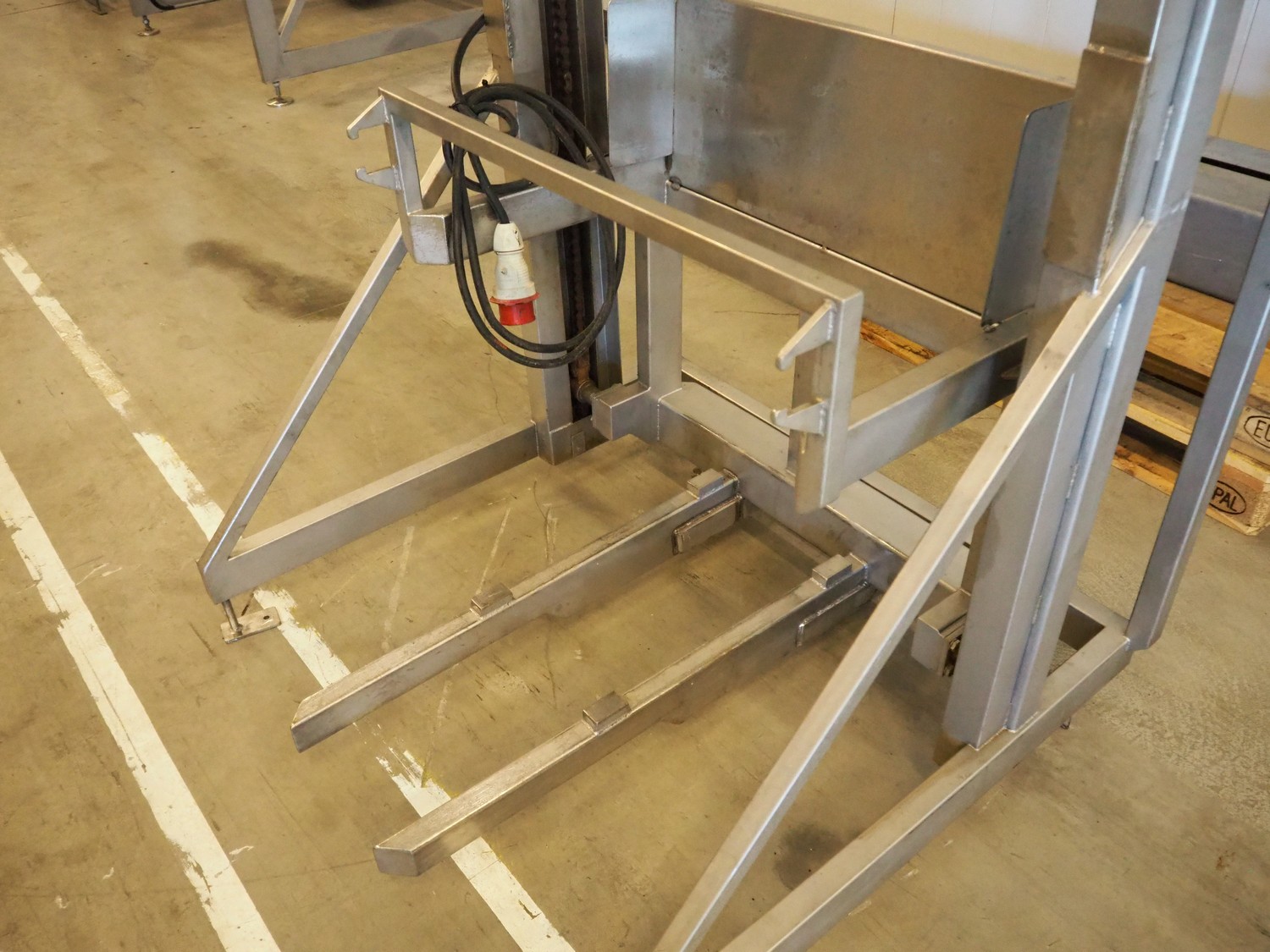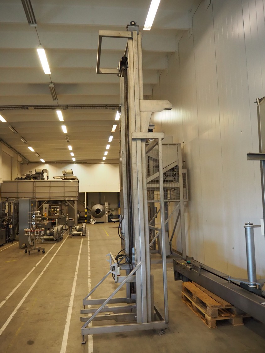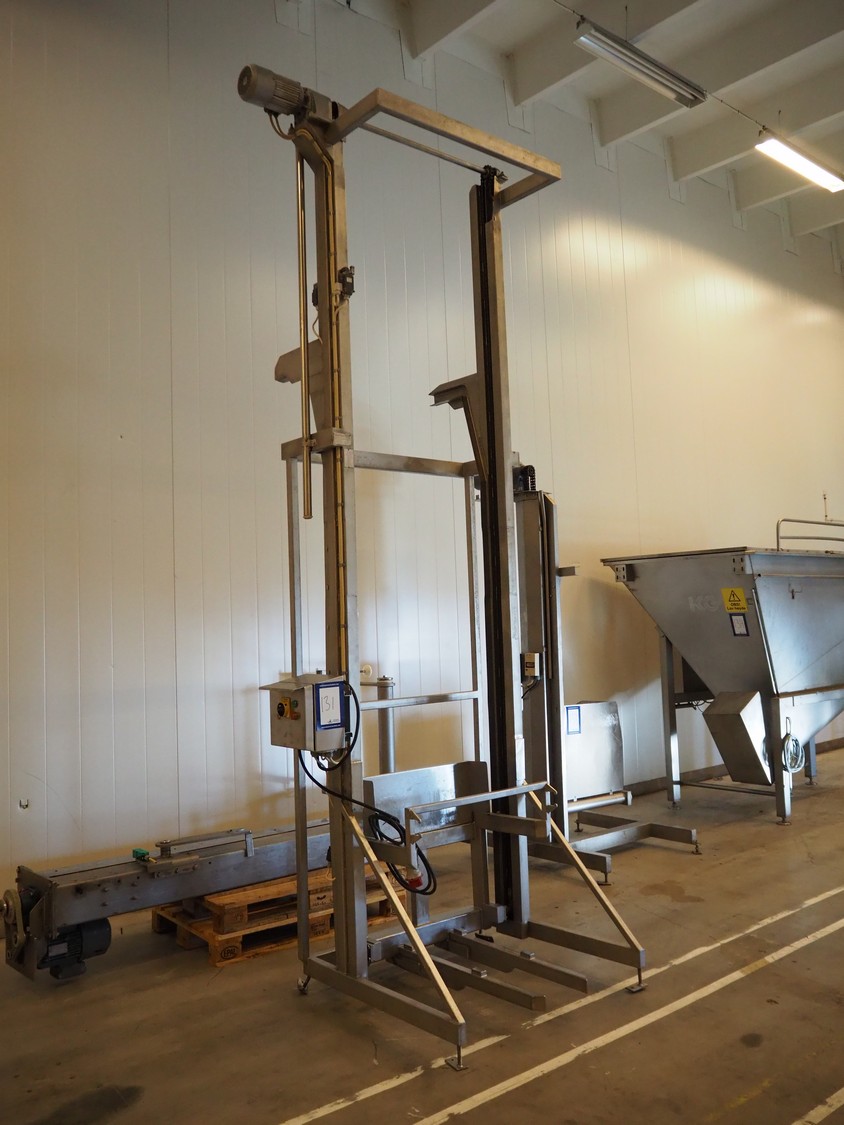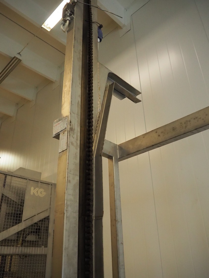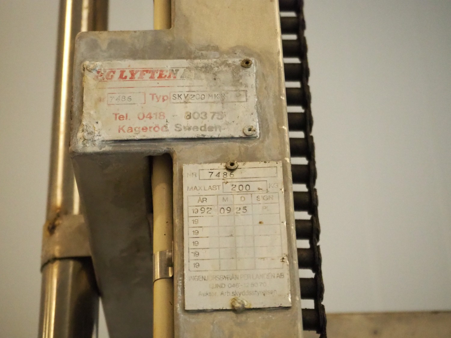KG Lyften AG lifter for pallet boxes, type: SKV 200 MKR, number: 7486, year of construction: 1992, maximum capacity: 200 kg, lifting height: 2980 mm, total dimensions: 1150 mm x 1200 mm x 4070 mm.