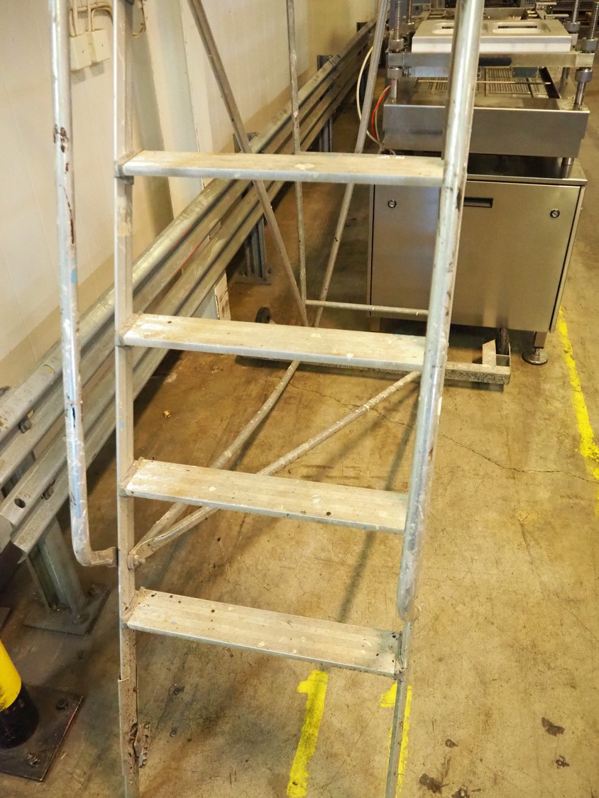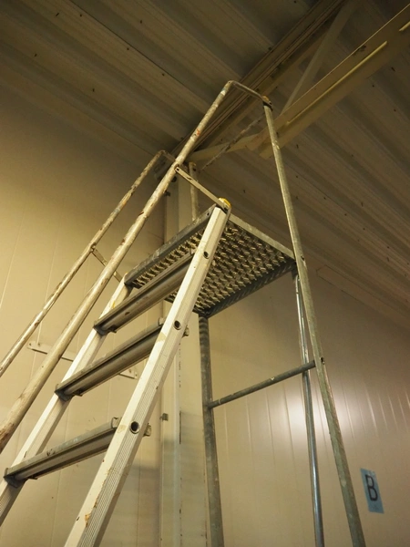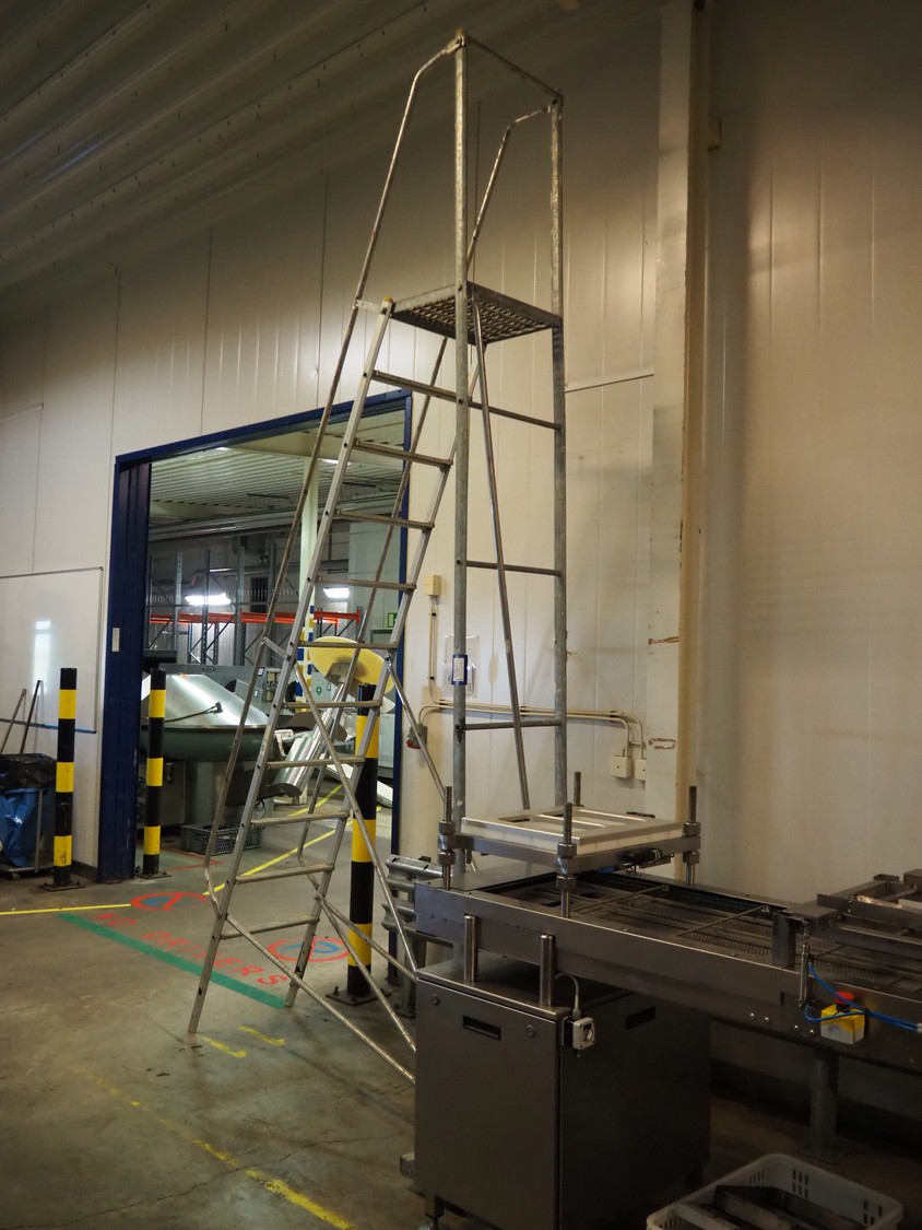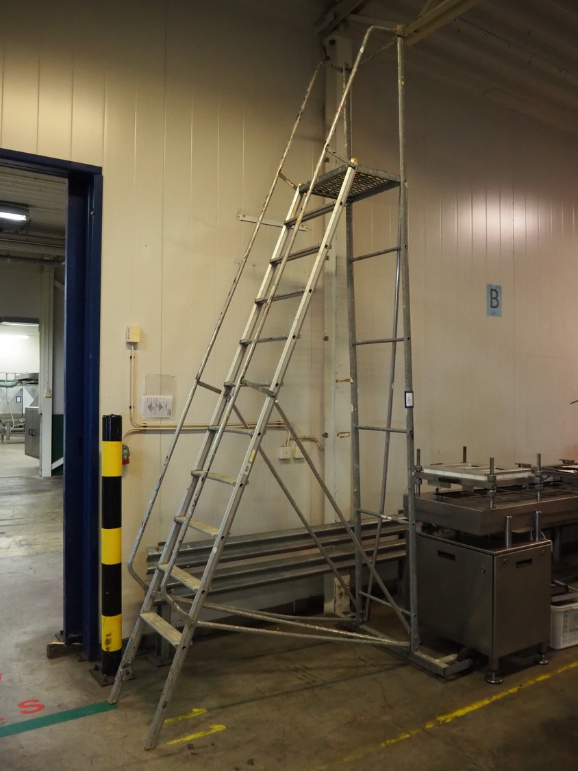Mobile stairs/platform, 10 steps, working height: 2950 mm, total dimensions: 2000 mm x 1050 mm x 3850 mm.