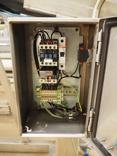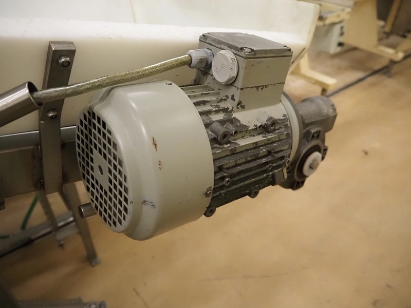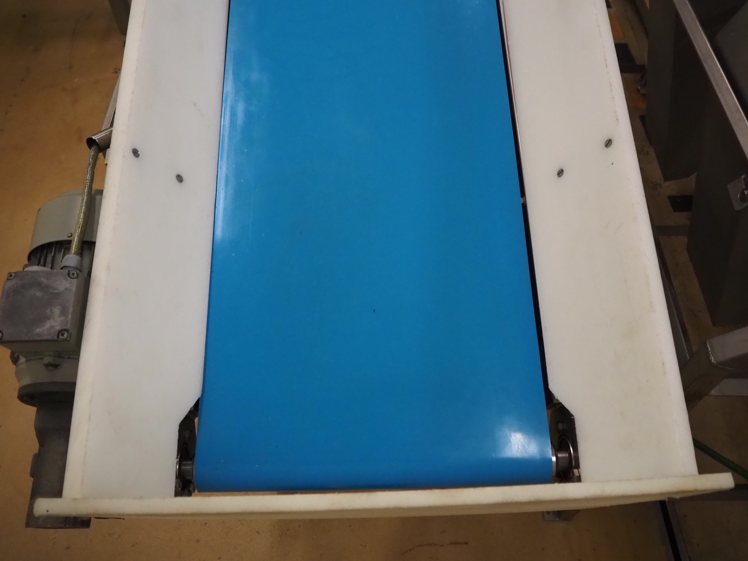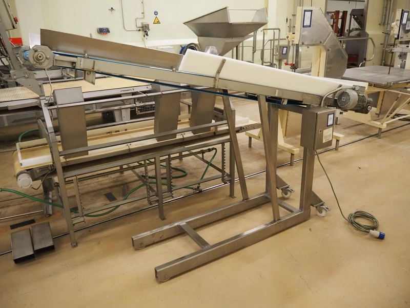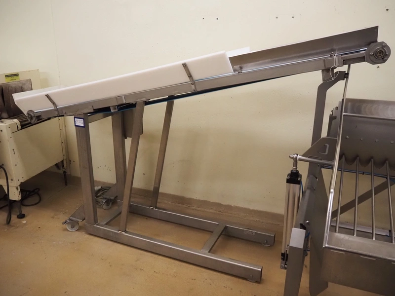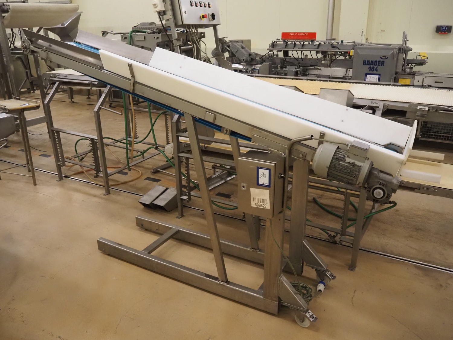 Mobile elevating belt, s/s frame, plastic belt, belt width: 400 mm, elevating height: 1580 mm, total dimensions: 2800 mm x 720 mm x 1700 mm.