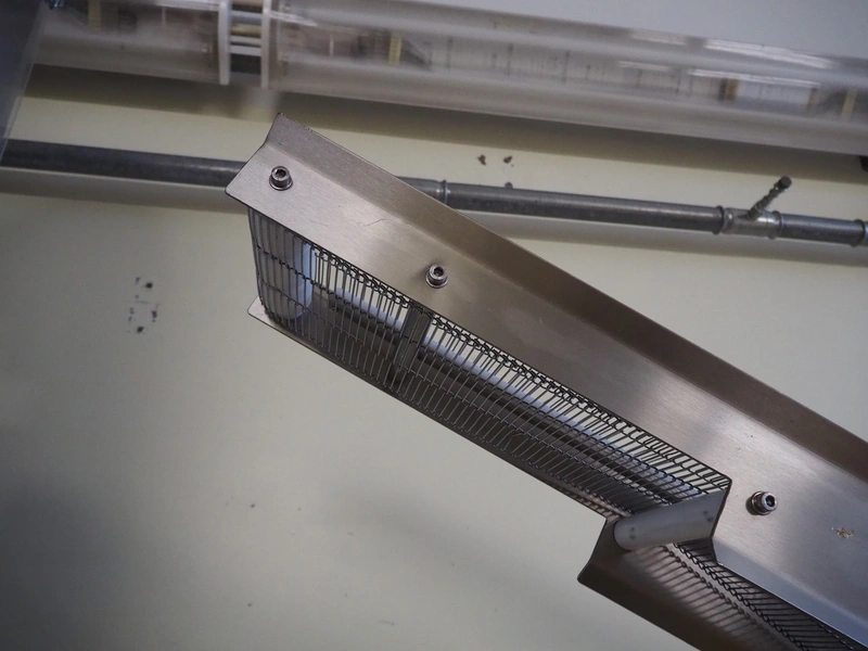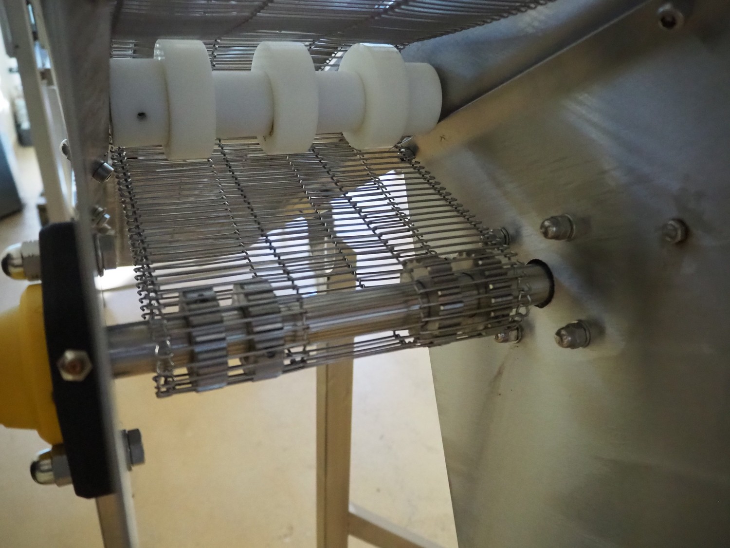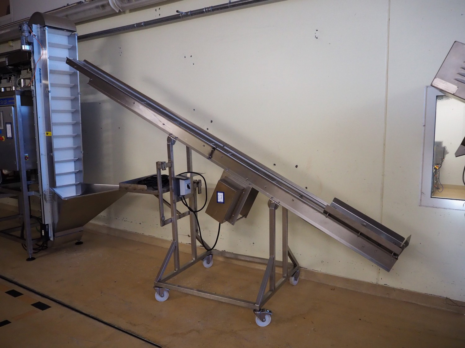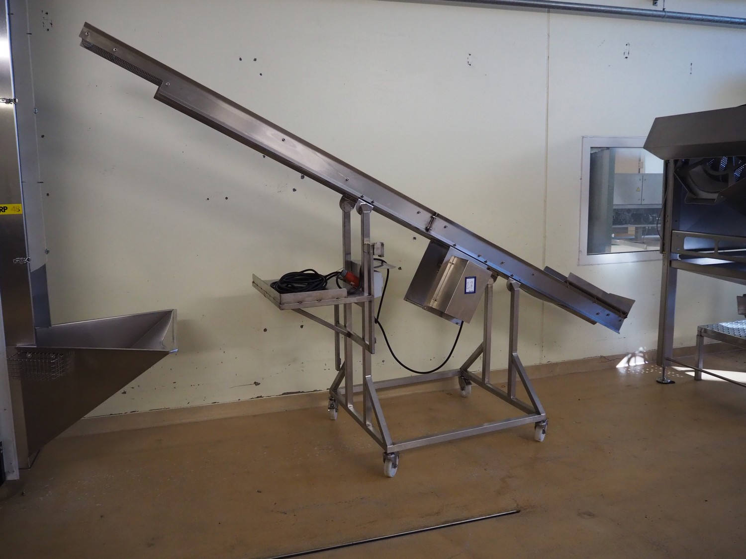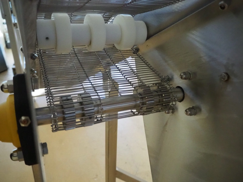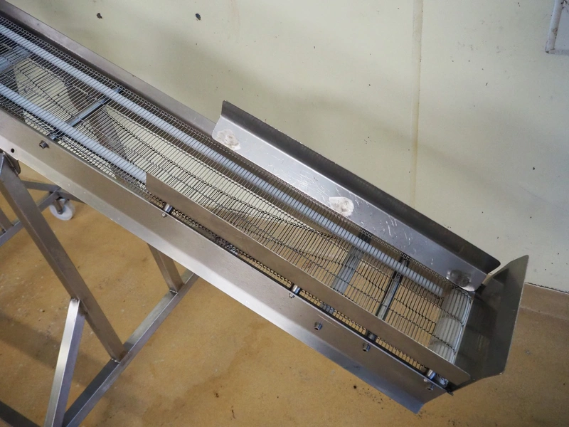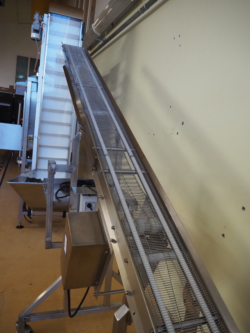 Mobile elevating belt, s/s frame and s/s mesh belt, belt width: 205 mm, elevating height: 2300 mm, total dimensions: 3650 mm x 950 mm x 2350 mm.