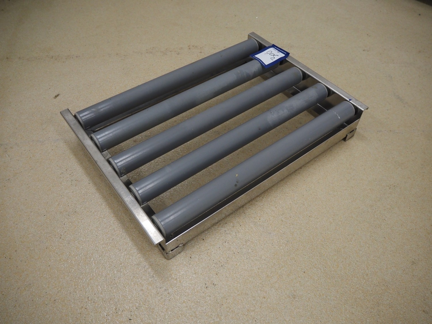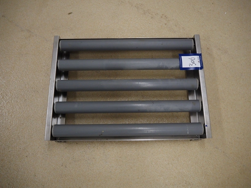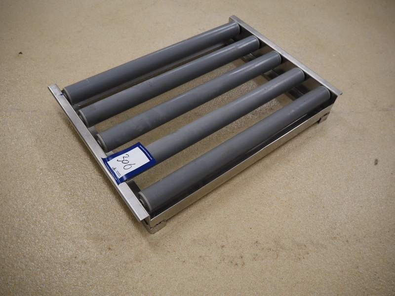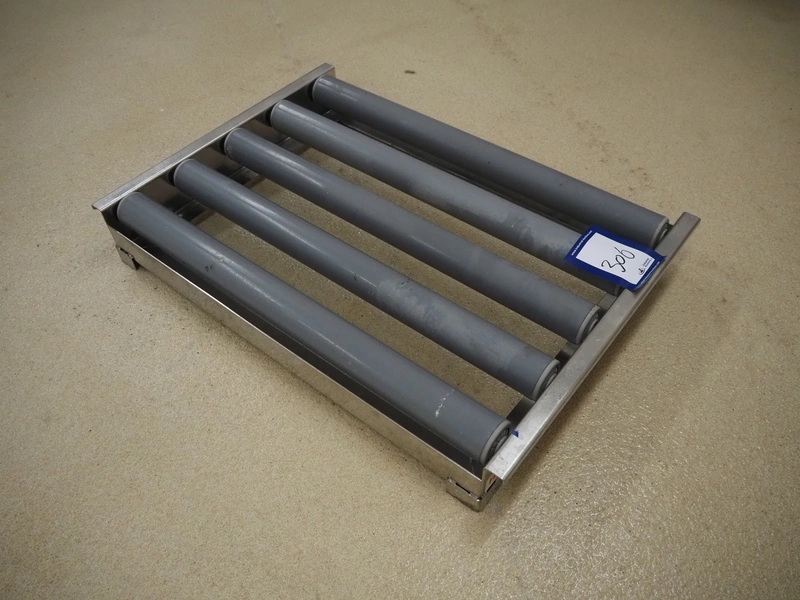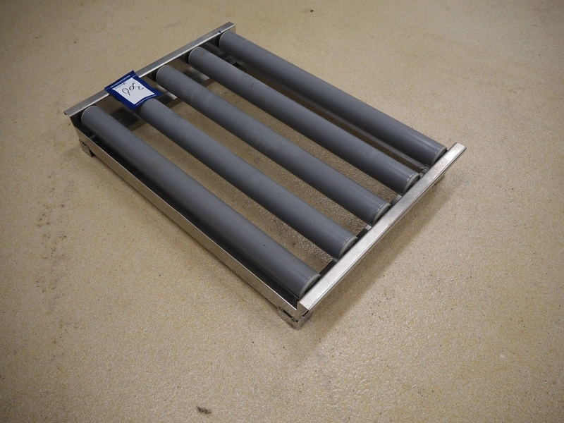 Roller conveyor, s/s frame, plastic rollers, roller width: 585 mm, total dimensions: 630 mm x 450 mm x 90 mm.