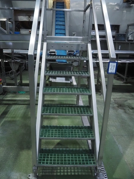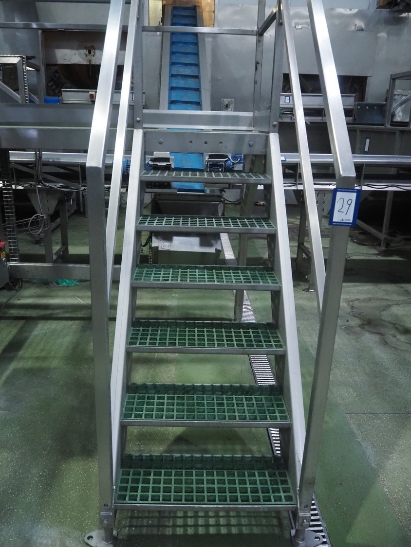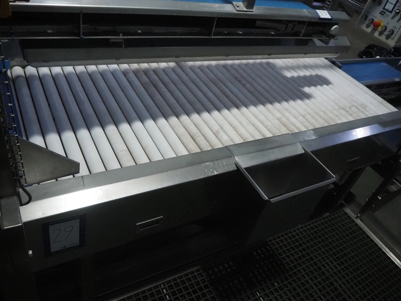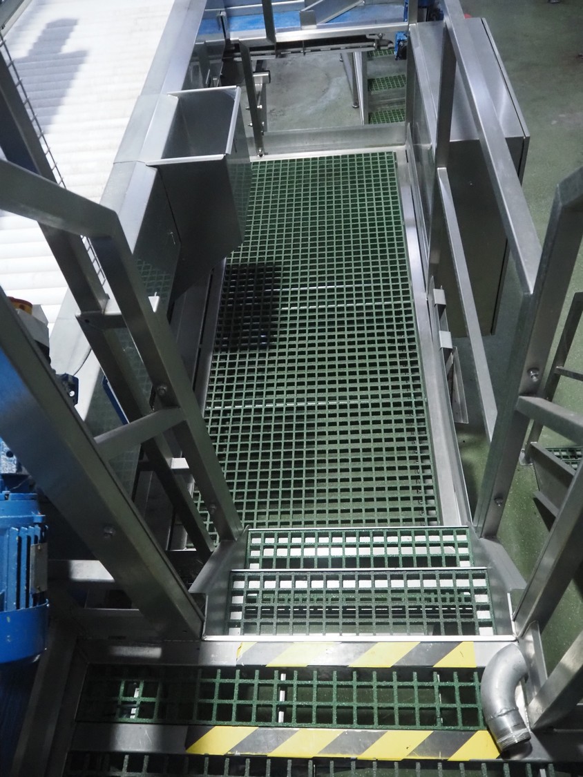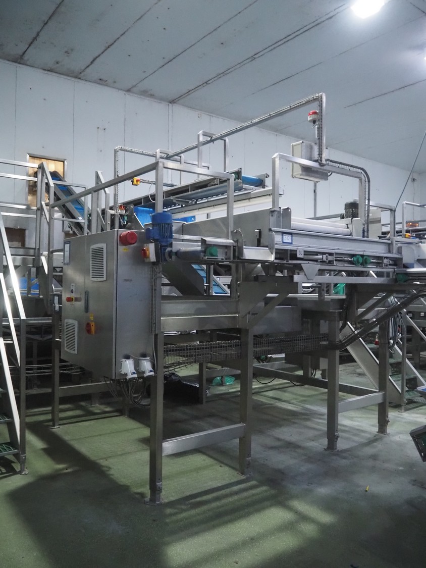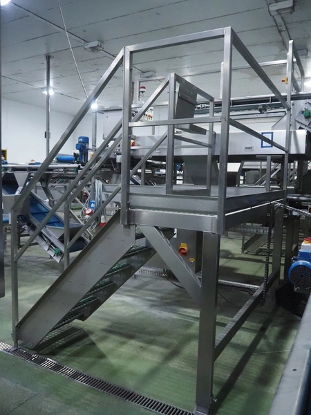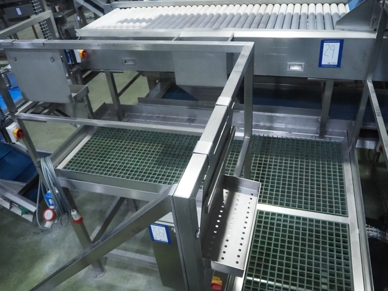Tong Engineering sorting table on s/s platformt, plastic rollers, roller width: 900 mm, plastic outfeed belt, belt width: 600 mm, working height platform: 1320 mm, total dimensions platform: 5150 mm x 3900 mm x 2650 mm.