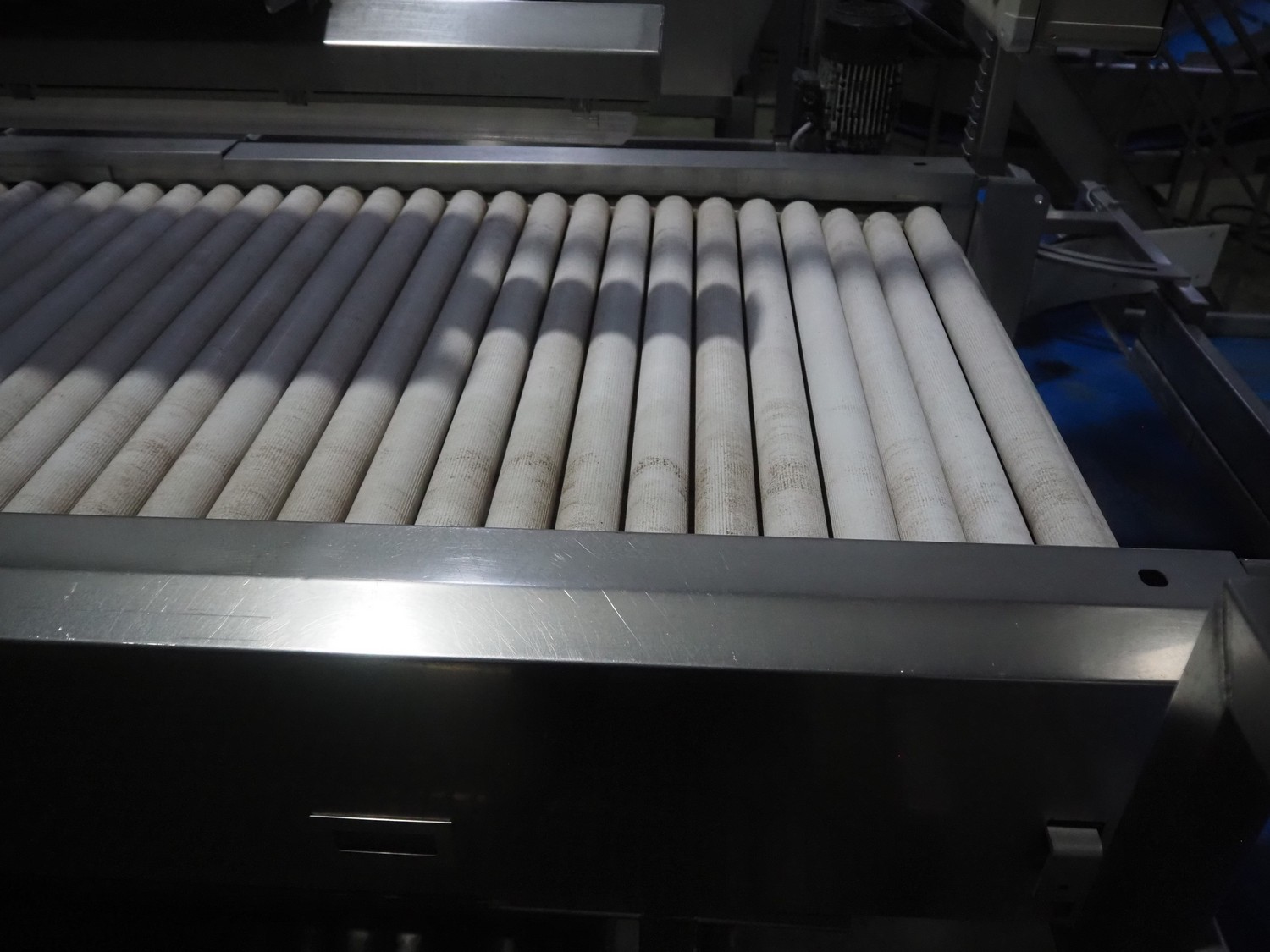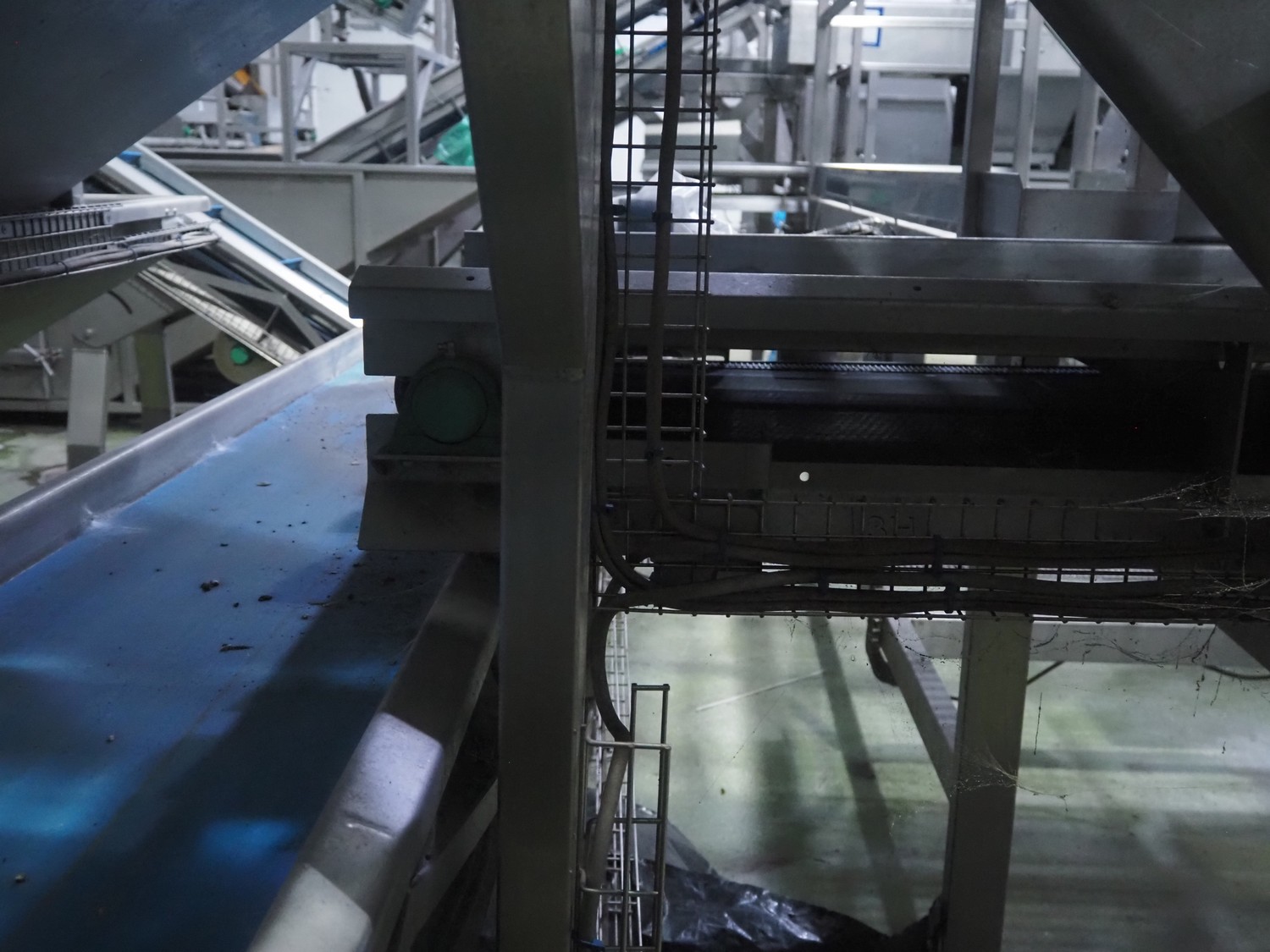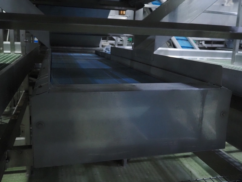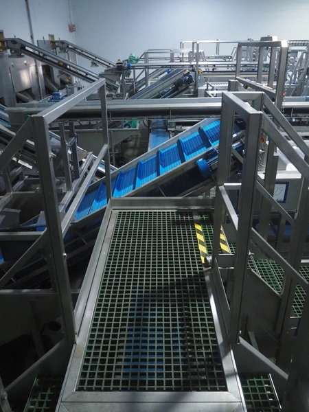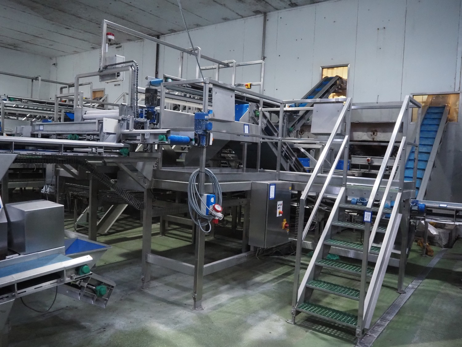 Tong Engineering sorting table on s/s platformt, plastic rollers, roller width: 900 mm, plastic outfeed belt, belt width: 600 mm, working height platform: 1320 mm, total dimensions platform: 5150 mm x 3900 mm x 2650 mm.