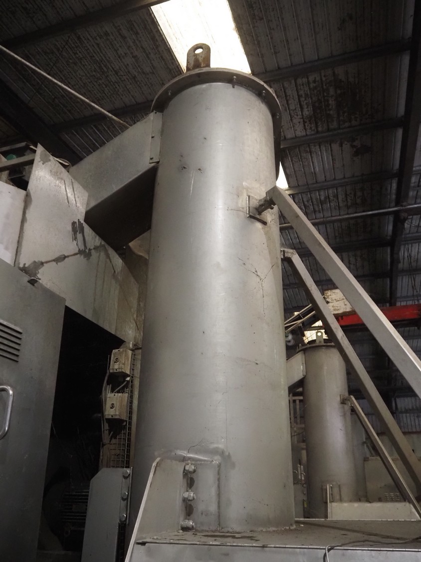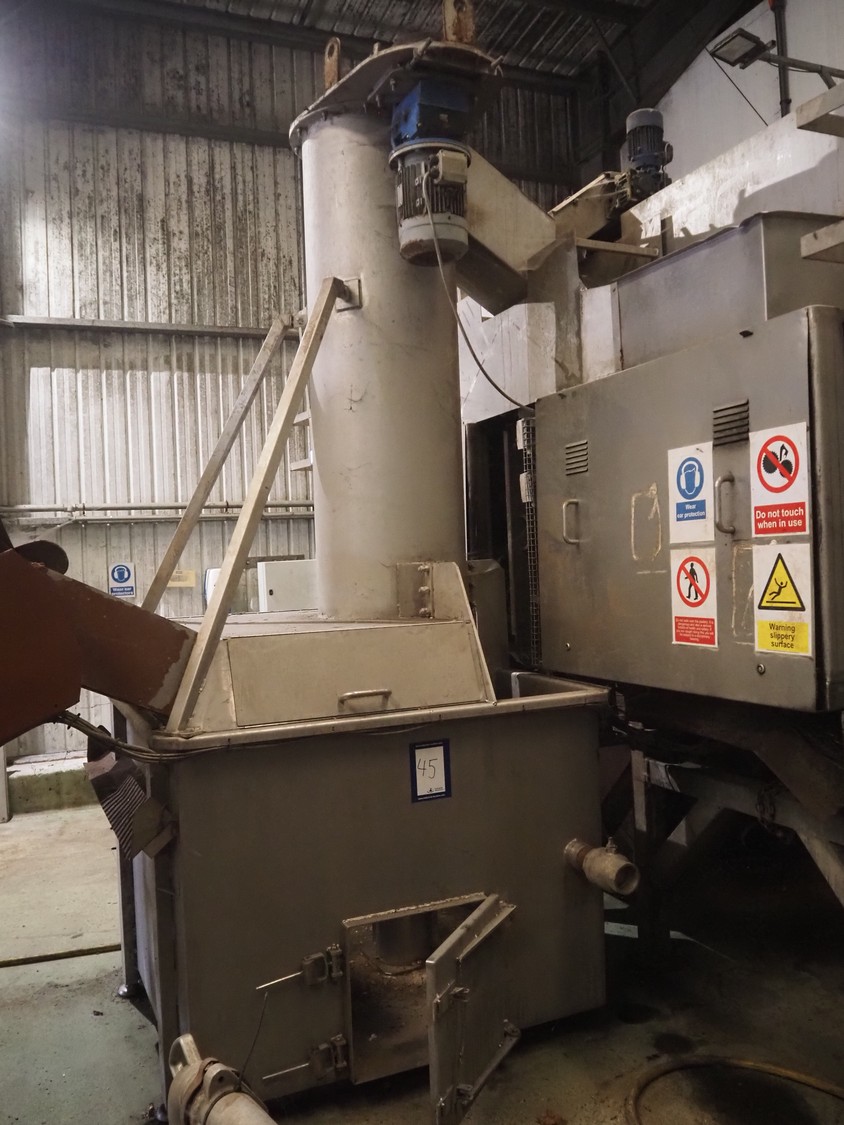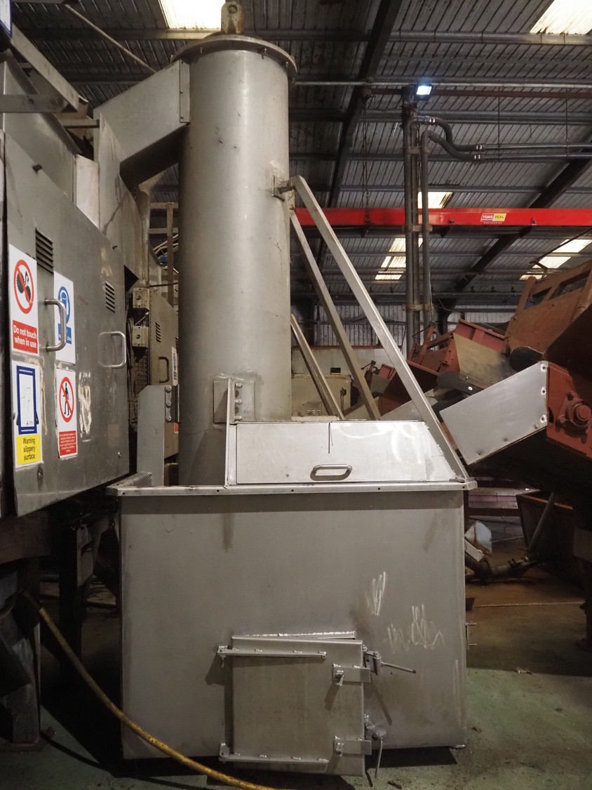 Screw destoner, infeed clearance: 1300 mm x 200 mm, screw diameter: approximately 550 mm, total dimensions: 1750 mm x 1800 mm x 3700 mm. Missing drive belt.