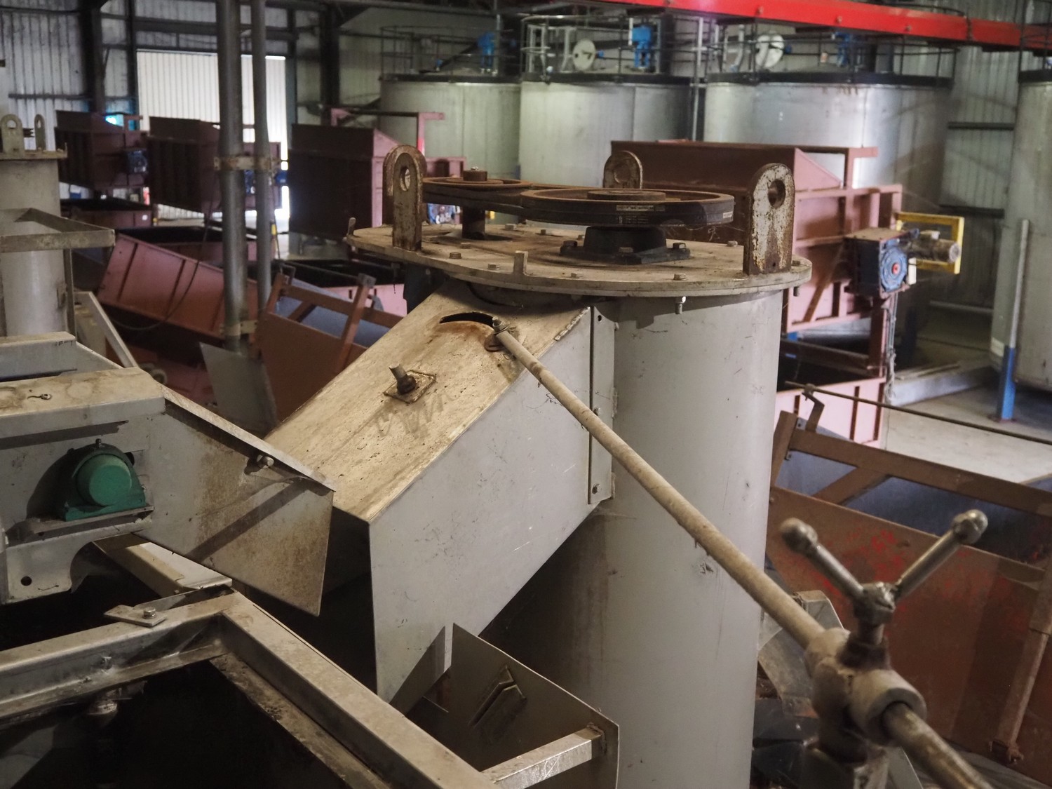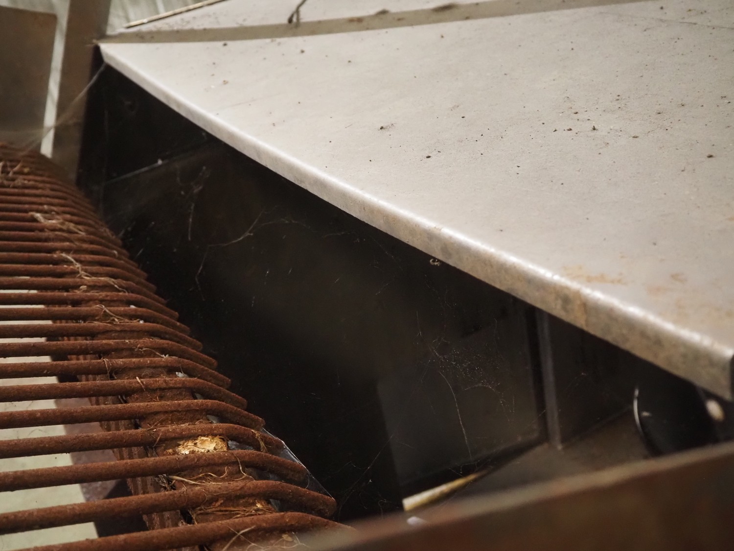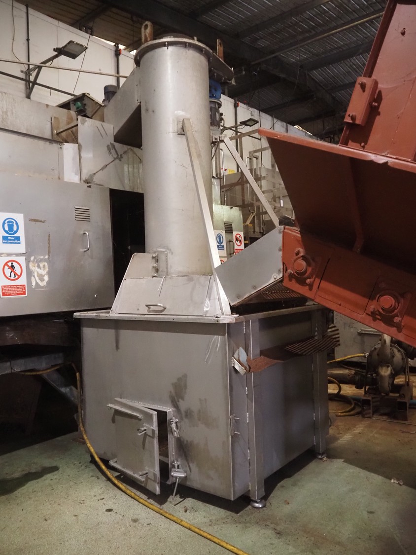 Screw destoner, infeed clearance: 1300 mm x 200 mm, screw diameter: approximately 550 mm, total dimensions: 1750 mm x 1800 mm x 3700 mm. Missing drive belt.