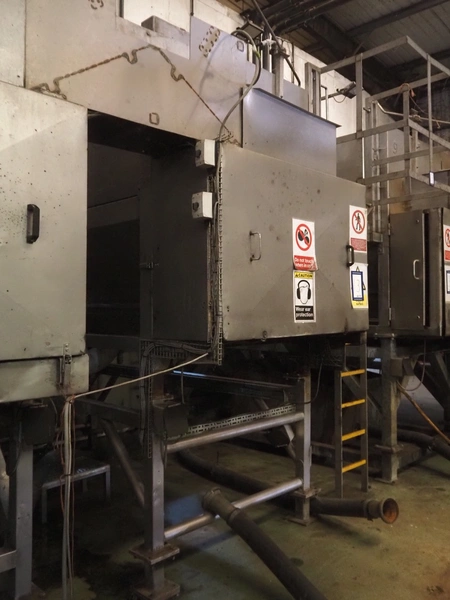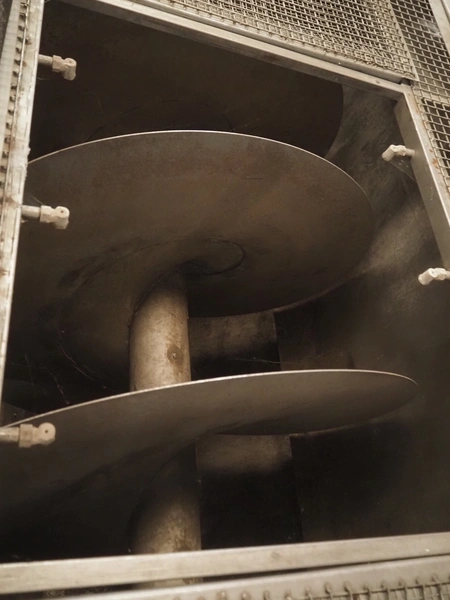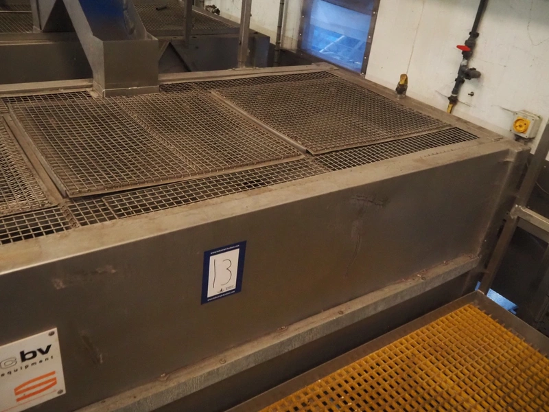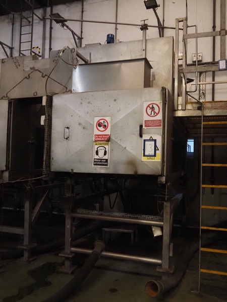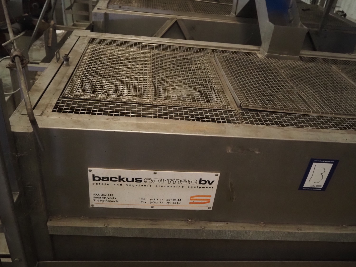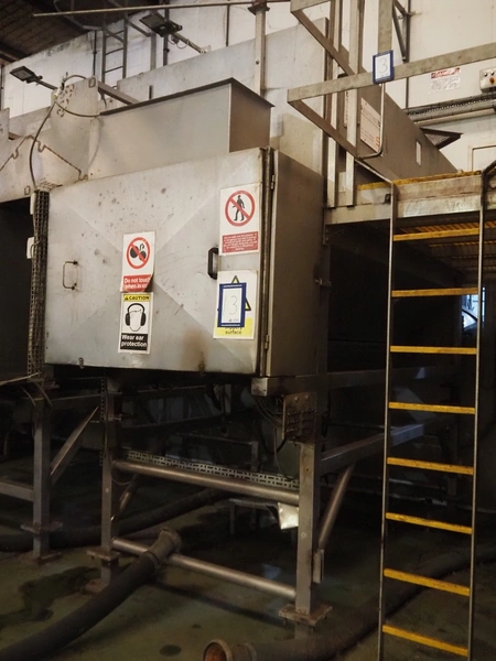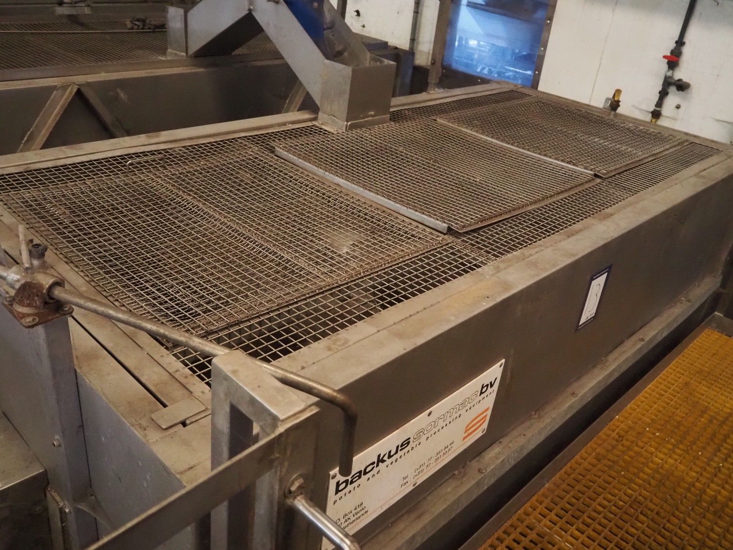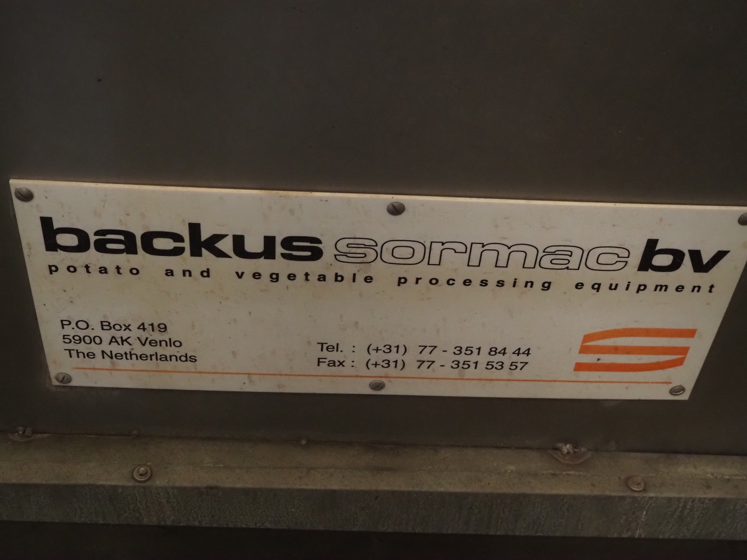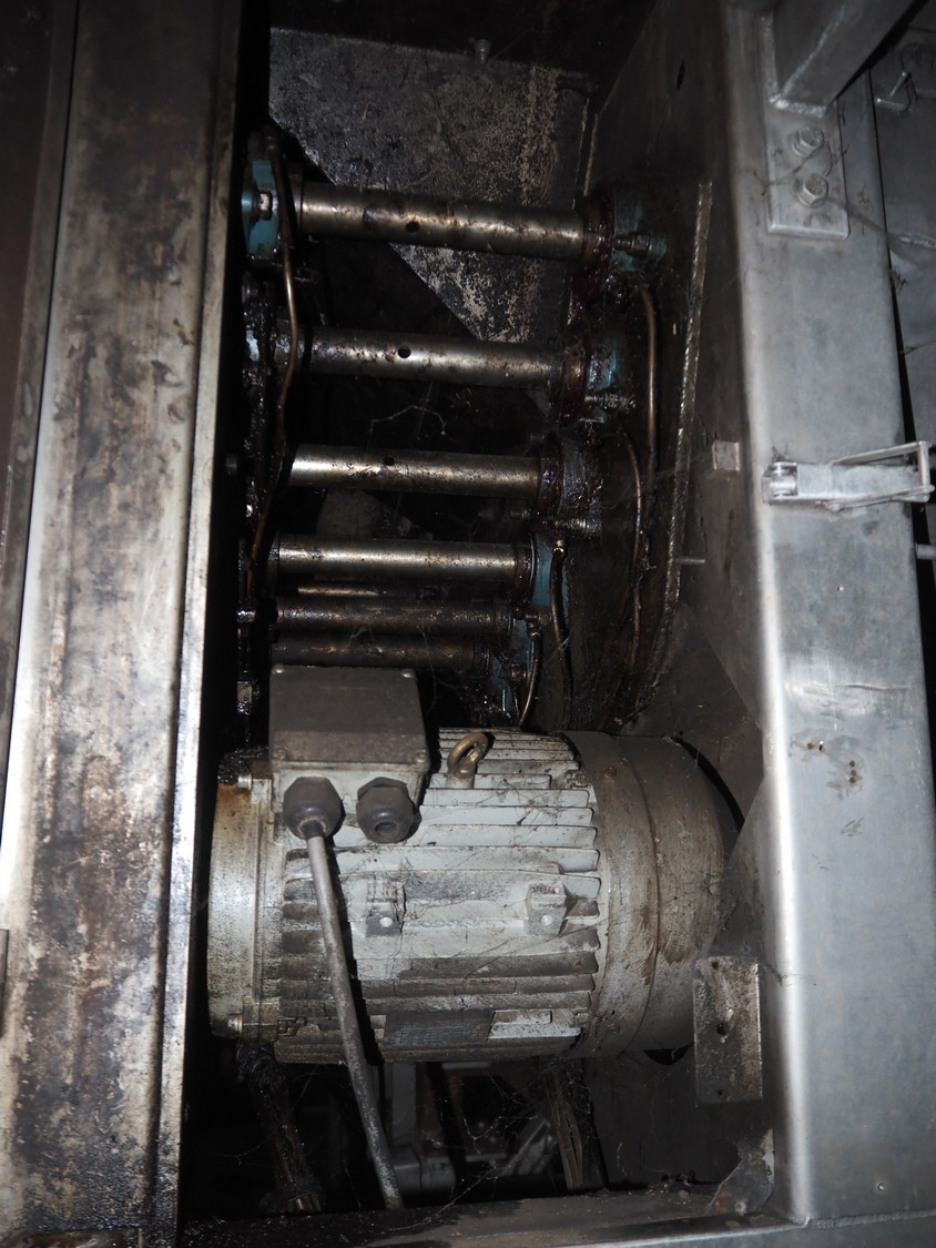 Sormac potato peeler, inside dimensions: 2880 mm x 1230 mm x 1260 mm, screw diameter: 1200 mm, total dimensions: 3250 mm x 1450 mm x 3200 mm. Missing rollers, without stairs/platform.