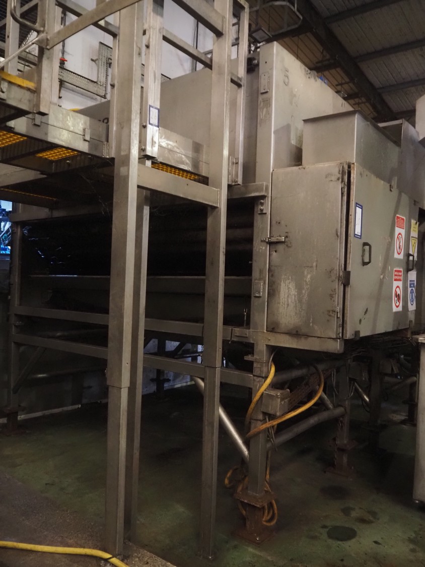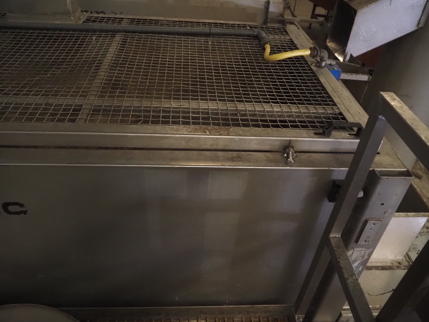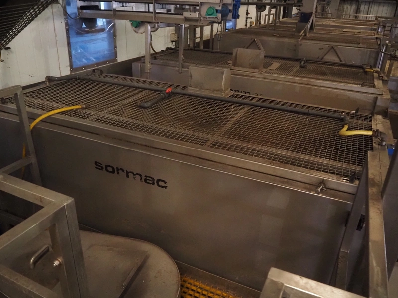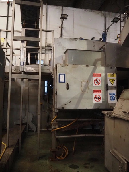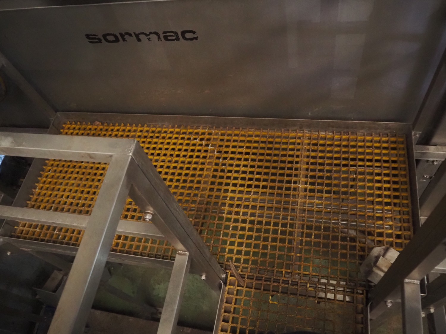 Sormac potato peeler, inside dimensions: 2880 mm x 1230 mm x 1260 mm, screw diameter: 1200 mm, total dimensions: 3900 mm x 1450 mm x 3200 mm. Screw on pallet. Including platform without stairs.