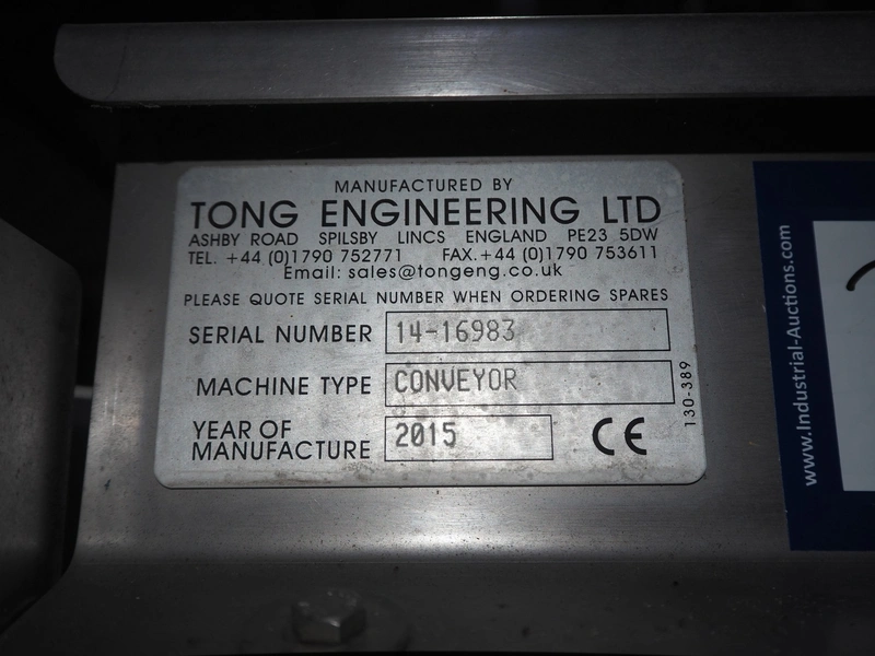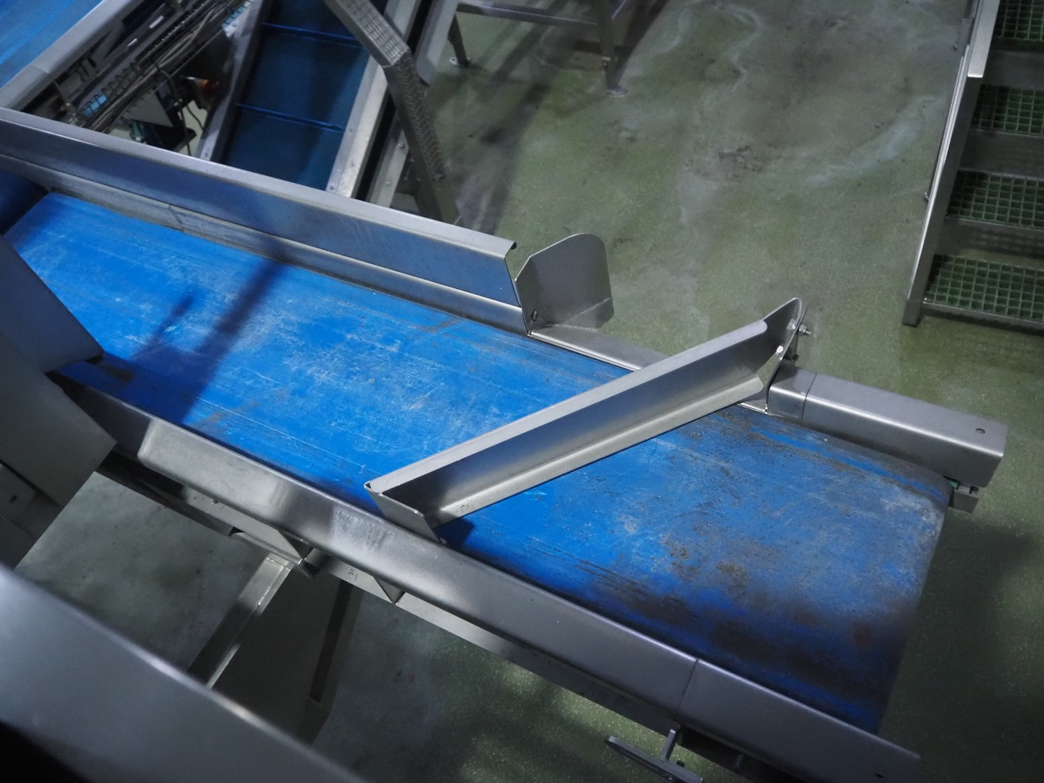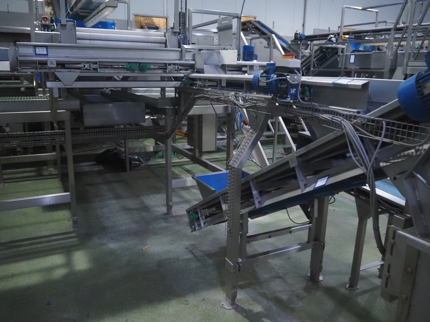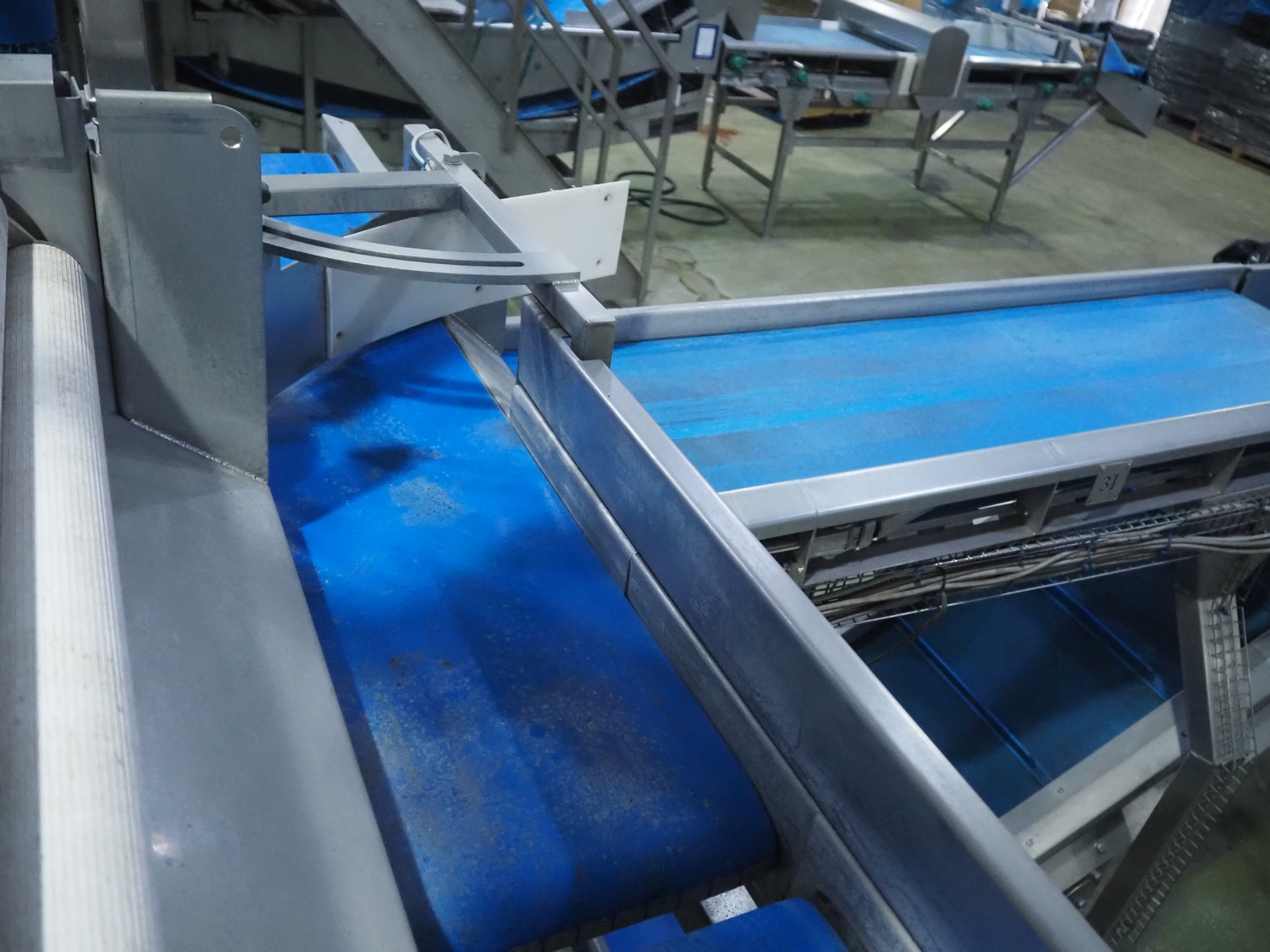 Tong Engineering dividing belt system, type: CONVEYOR, serial number: 14-16983 and 14-16989, year of construction: 2015, plastic belts, belt width: (2x) 300 mm, 2 outputs, clearance: (2x) 250 mm x 110 mm, with transport belt, plastic belt, belt width: 450 mm, total dimensions: 3050 mm x 2700 mm x 1930 mm.
