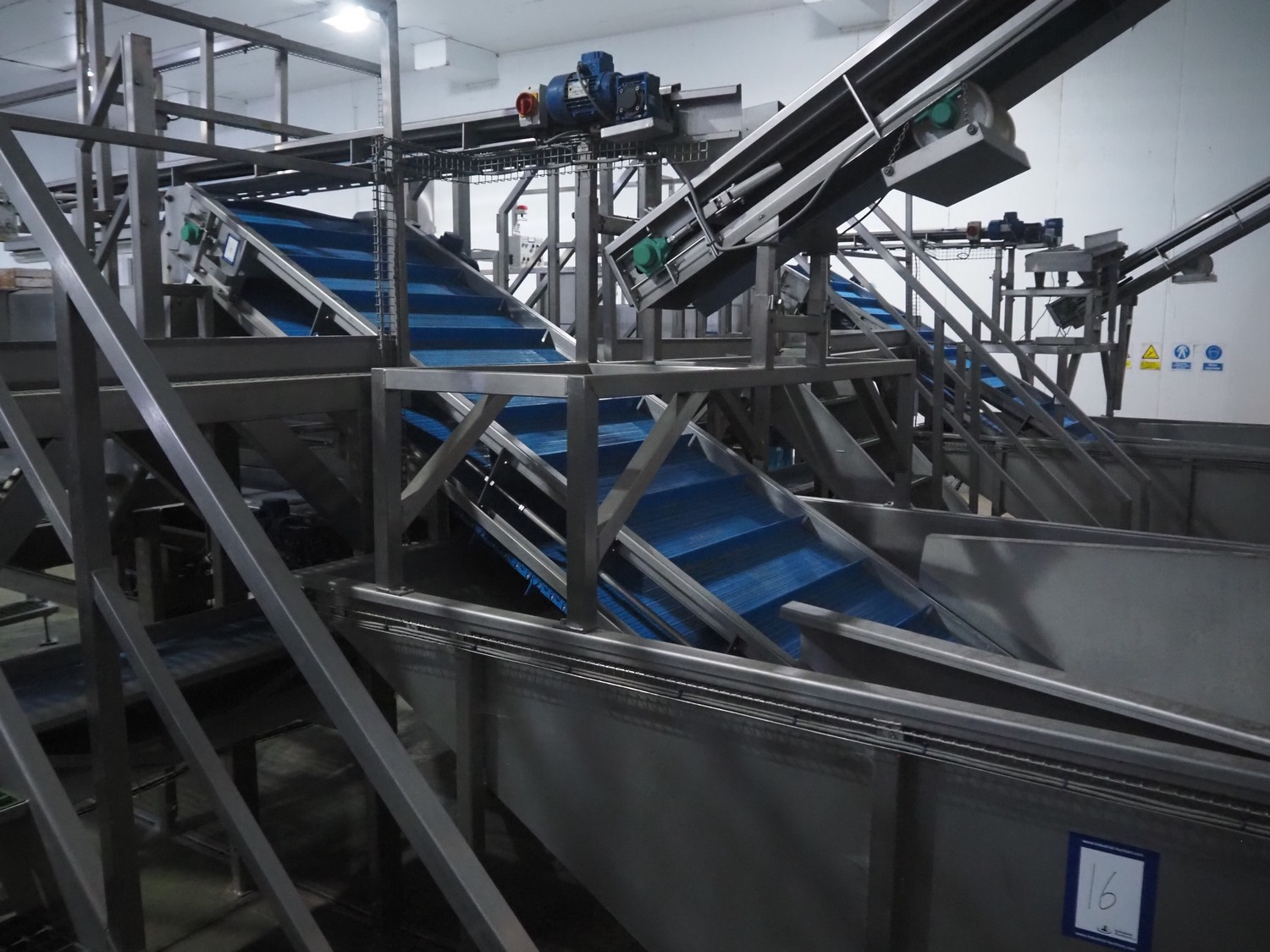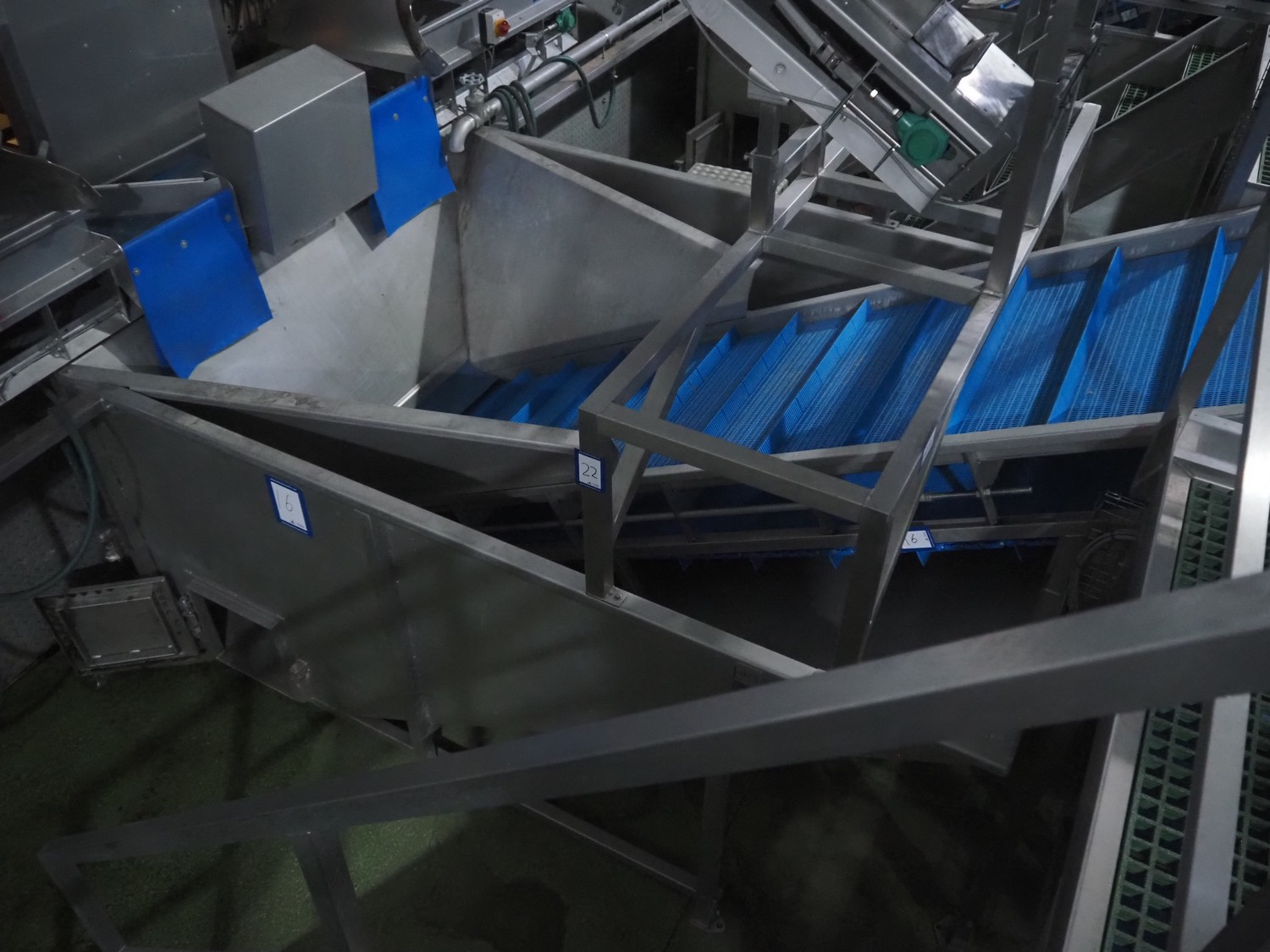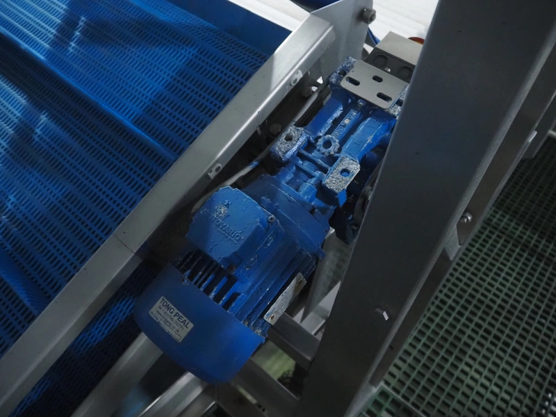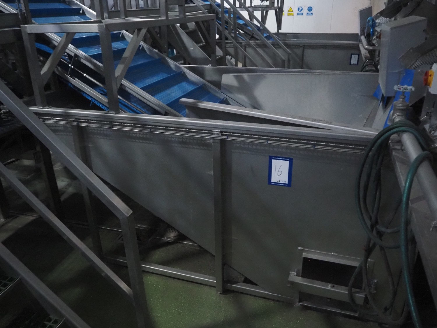 Tong Engineering pre-soak tank with elevating belt, plastic mesh belt, belt width: 890 mm, divider height: 55 mm, divider width: 885, distance between dividers: 250 mm, total dimensions: 2200 mm x 4600 mm x 2550