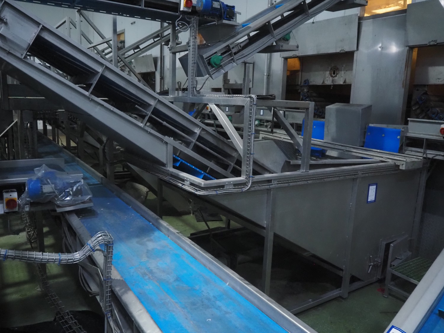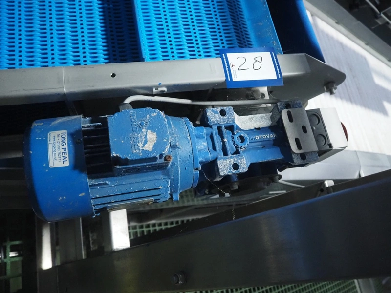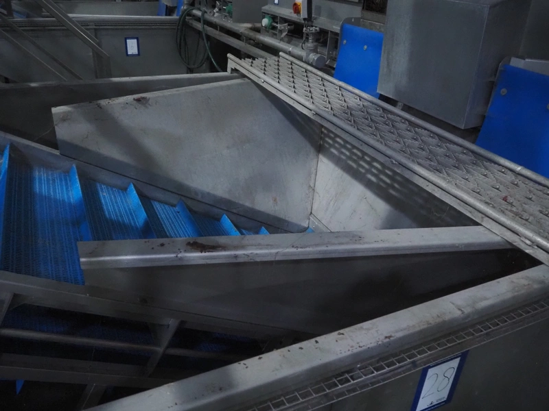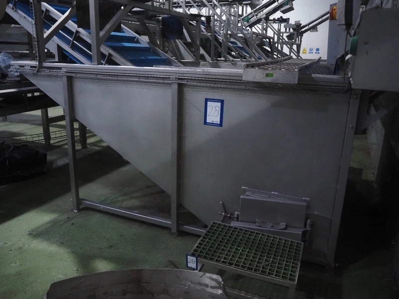 Tong Engineering pre-soak tank with elevating belt, plastic mesh belt, belt width: 890 mm, divider height: 55 mm, divider width: 885, distance between dividers: 250 mm, total dimensions: 2200 mm x 4600 mm x 2550