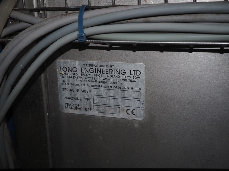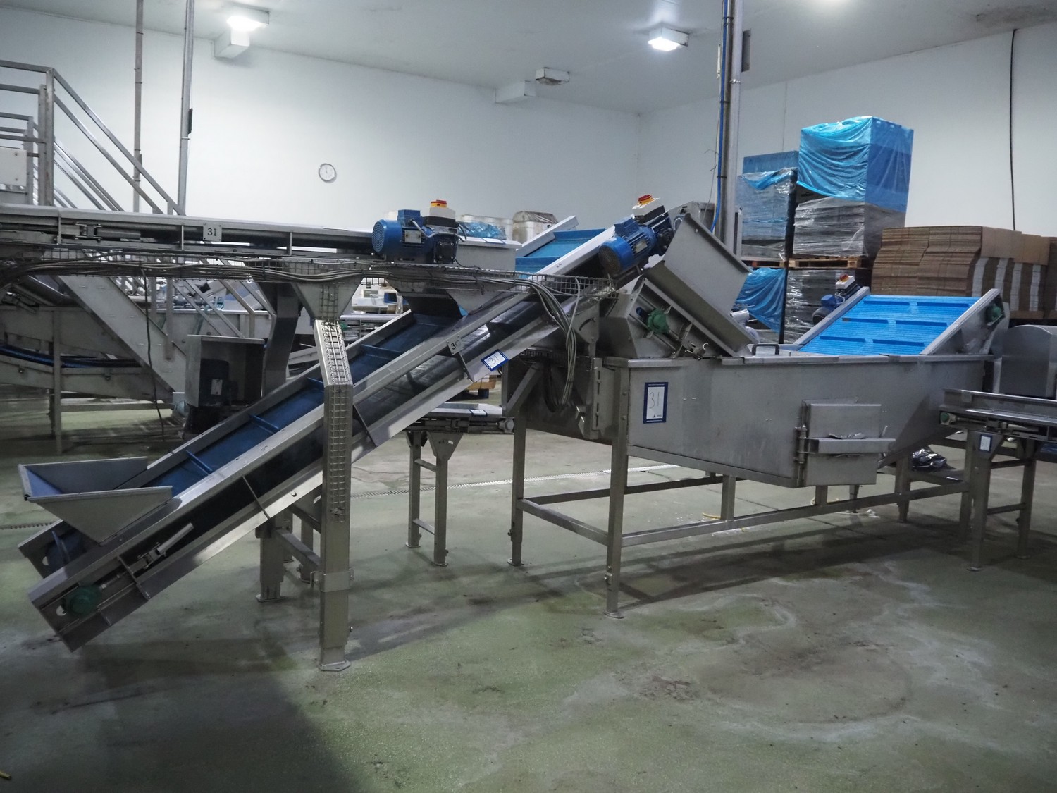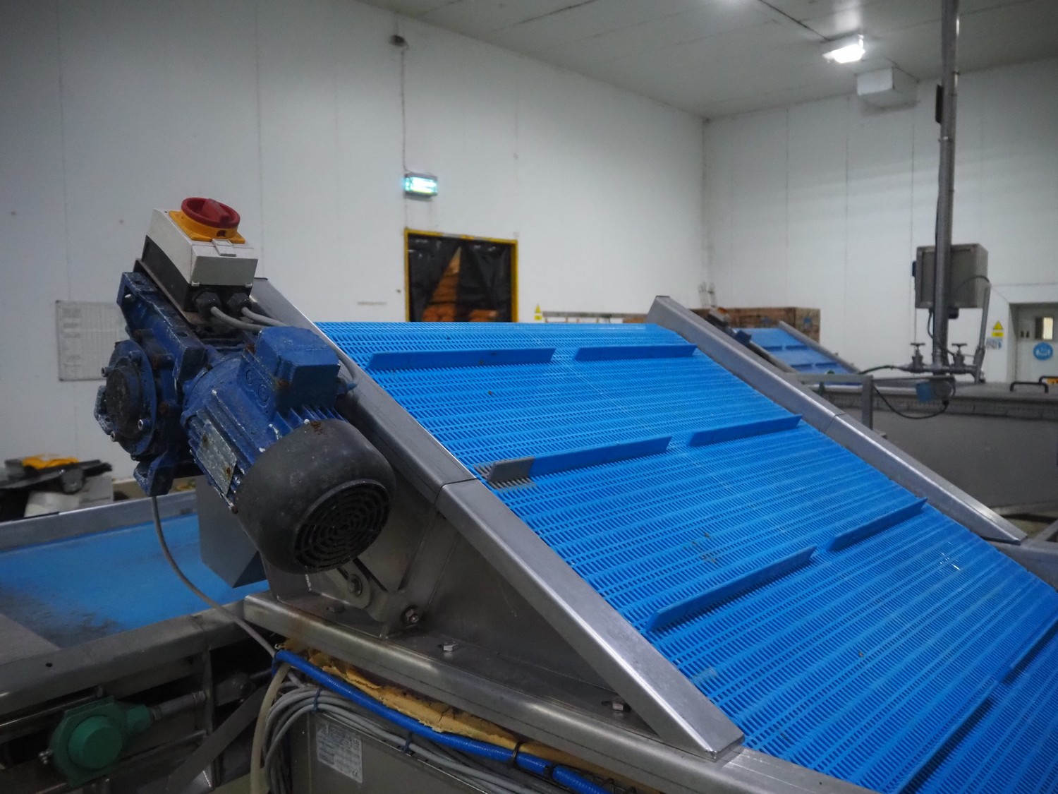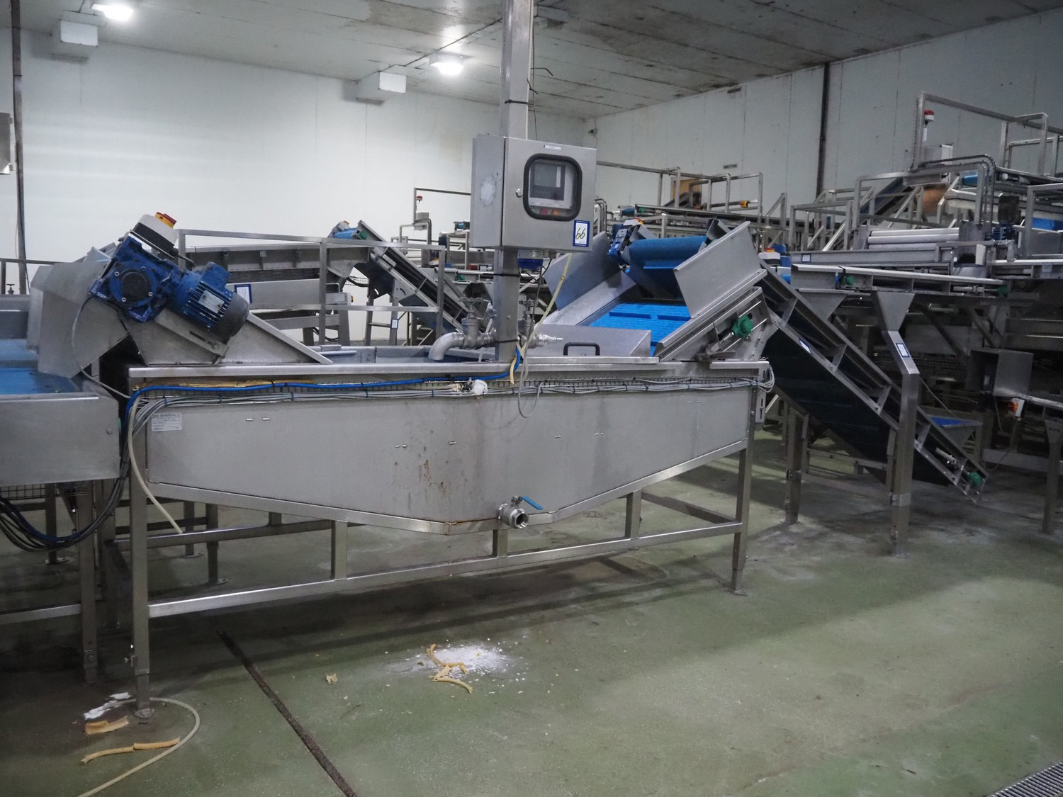 Tong Engineering vegetable washing tub, type: S02 tank, serial number: 14-16997, year of construction: 2015, plastic mesh belt, belt width: 900 mm, divider width: 370 mm, divider height: 25 mm, distance between dividers: 245 mm, outfeed height: 1500 mm, total dimensions: 3300 mm x 1350 mm x 1830 mm. Including elevating belt, plastic belt, belt width: 530 mm, divider width: 445 mm, divider height: 45 mm, distance between dividers: 295 mm, total dimensions: 2700 mm x 1000 mm x 1980 mm. Without dosing unit.