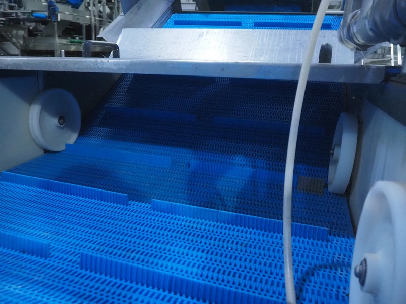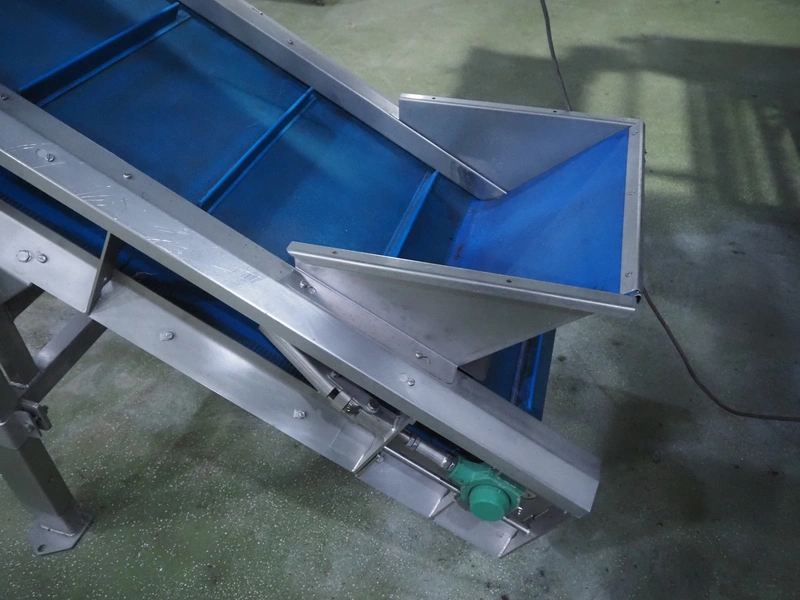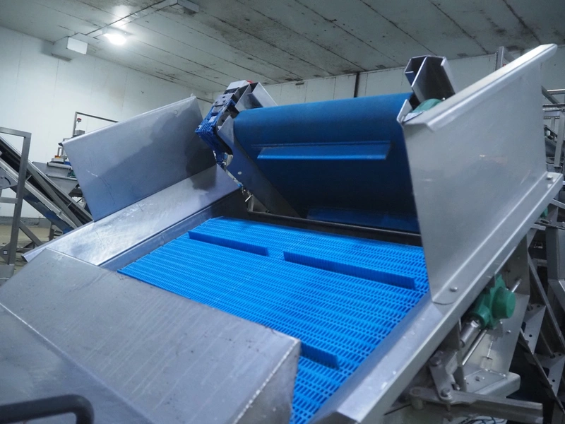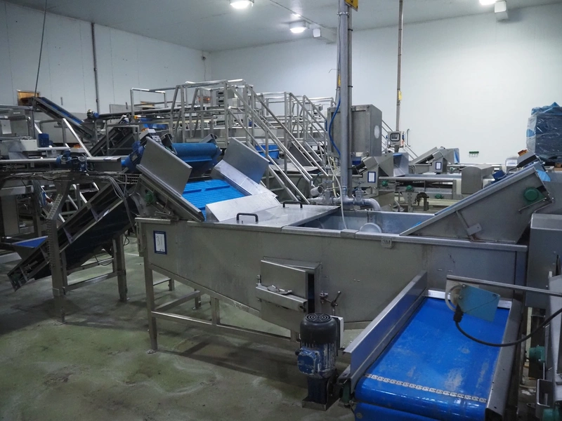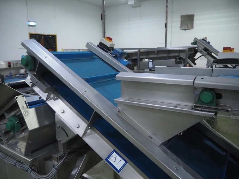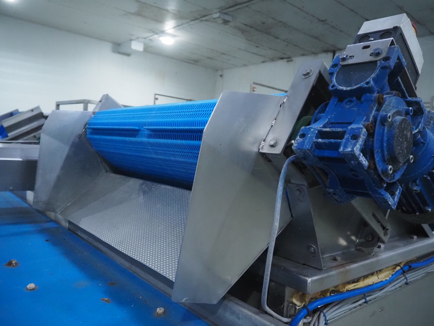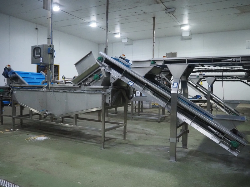 Tong Engineering vegetable washing tub, type: S02 tank, serial number: 14-16997, year of construction: 2015, plastic mesh belt, belt width: 900 mm, divider width: 370 mm, divider height: 25 mm, distance between dividers: 245 mm, outfeed height: 1500 mm, total dimensions: 3300 mm x 1350 mm x 1830 mm. Including elevating belt, plastic belt, belt width: 530 mm, divider width: 445 mm, divider height: 45 mm, distance between dividers: 295 mm, total dimensions: 2700 mm x 1000 mm x 1980 mm. Without dosing unit.