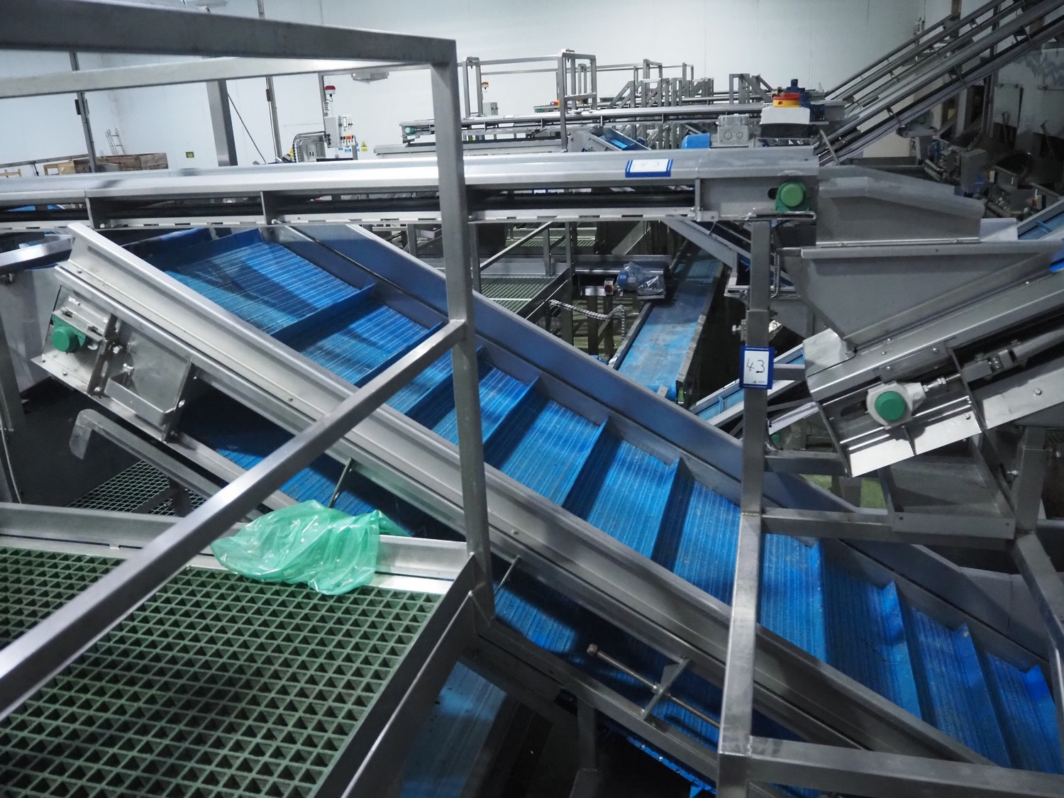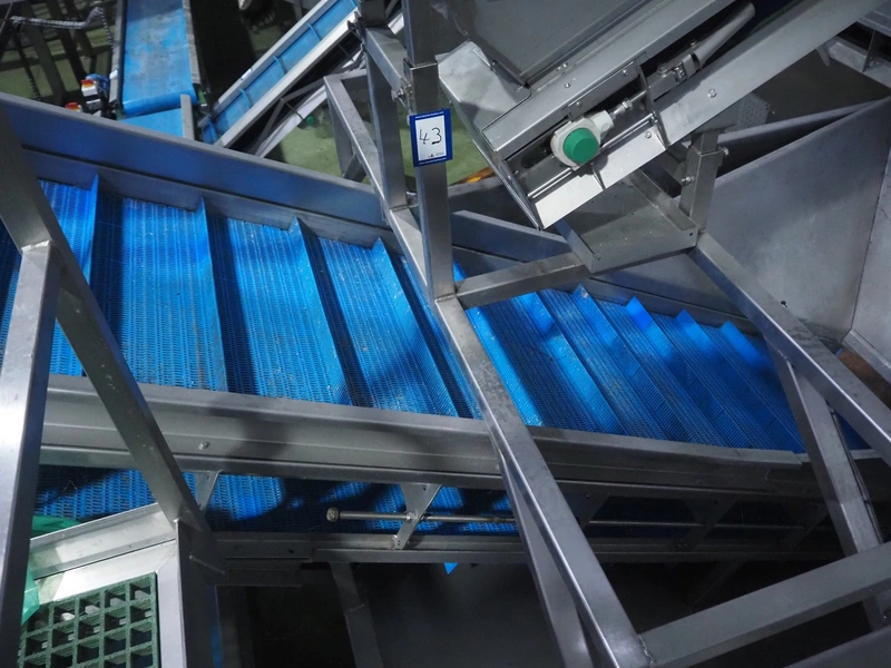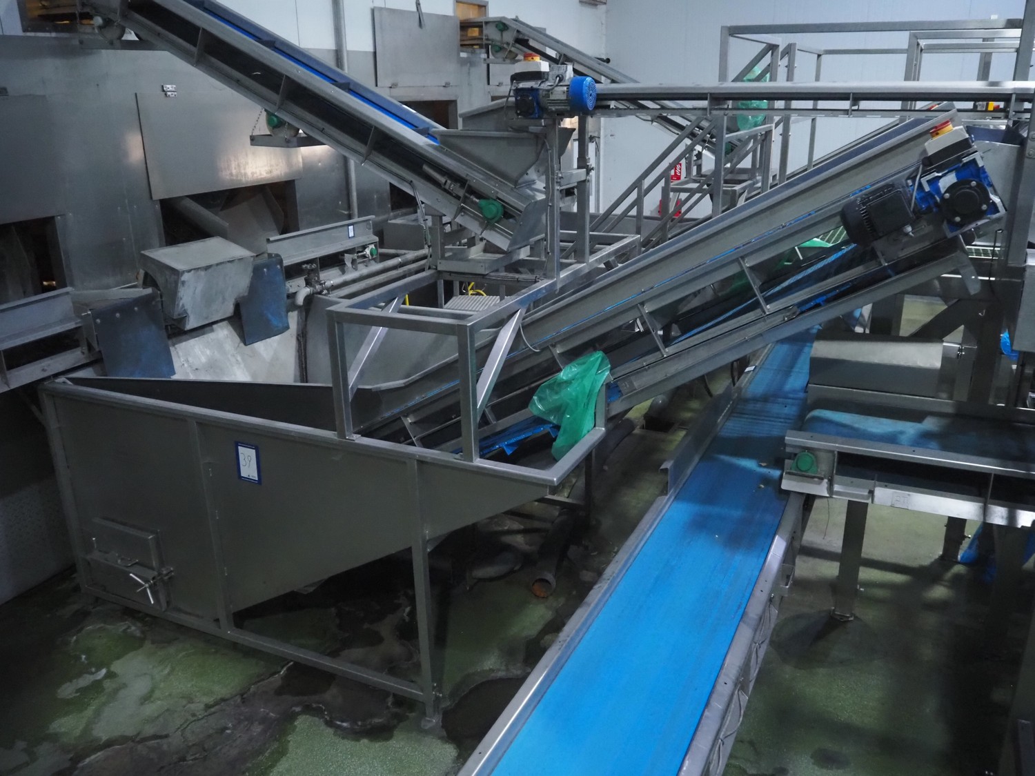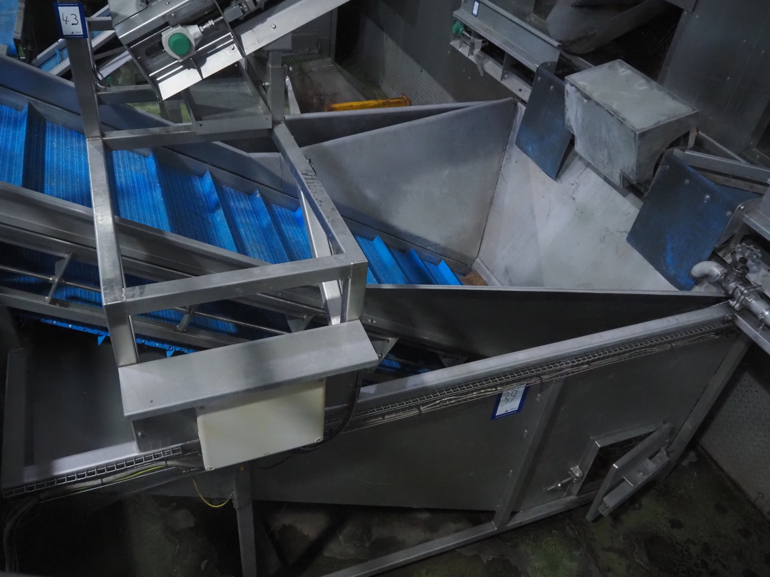 Tong Engineering pre-soak tank with elevating belt, plastic mesh belt, belt width: 890 mm, divider height: 55 mm, divider width: 885, distance between dividers: 250 mm, total dimensions: 2200 mm x 4600 mm x 2550