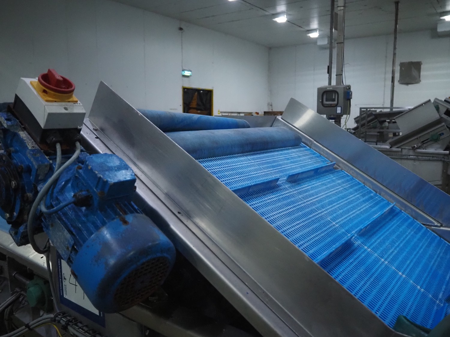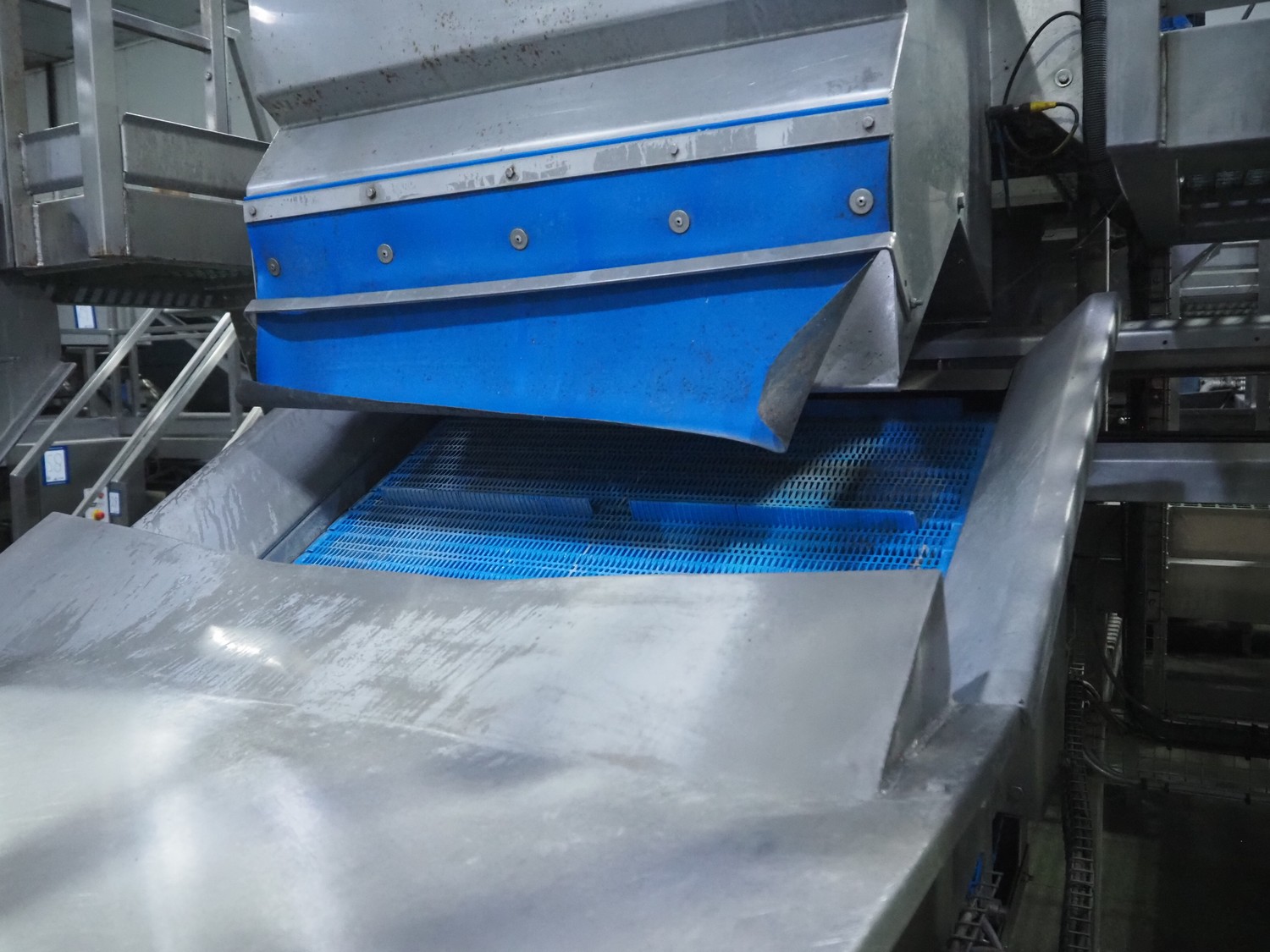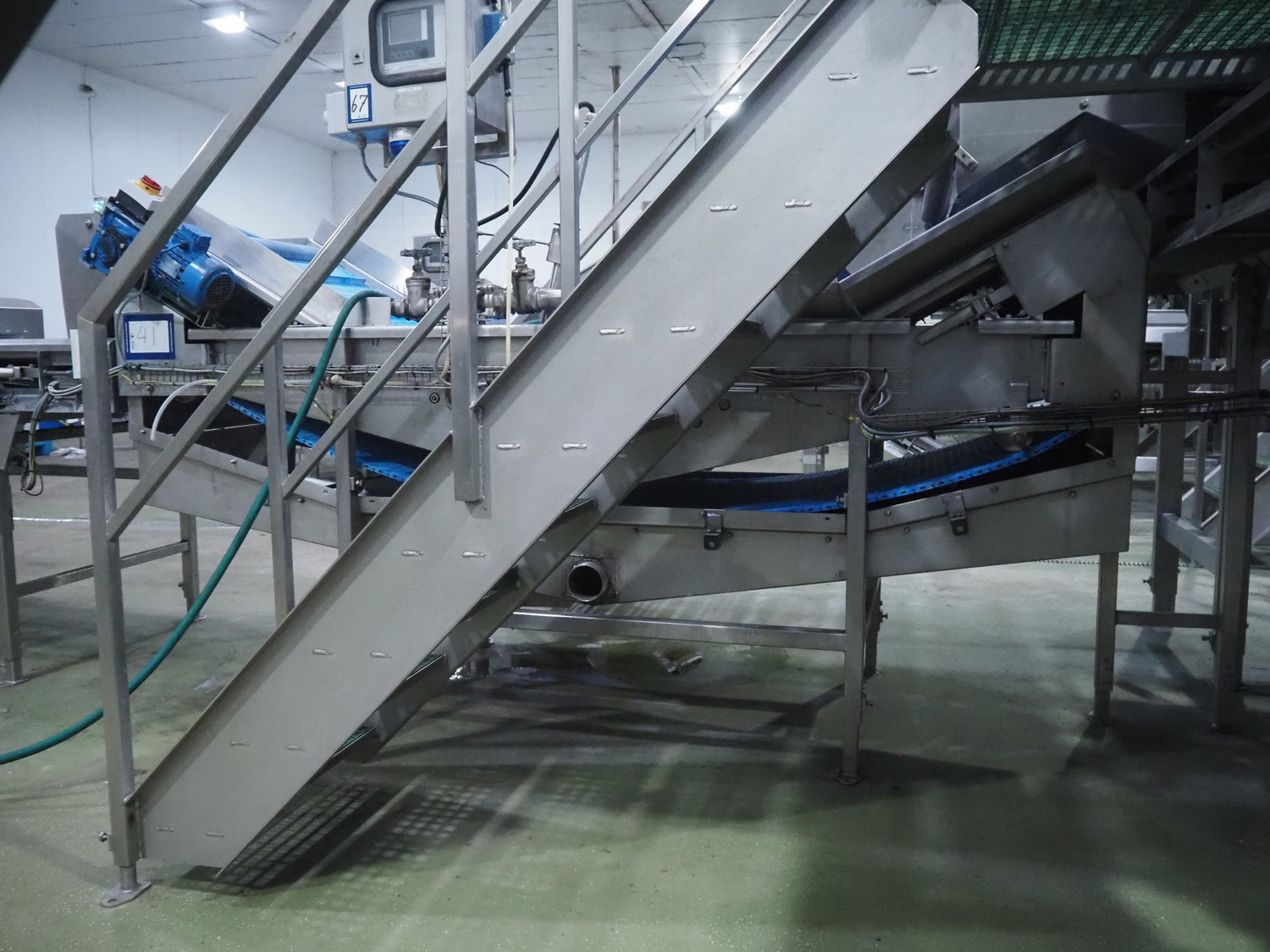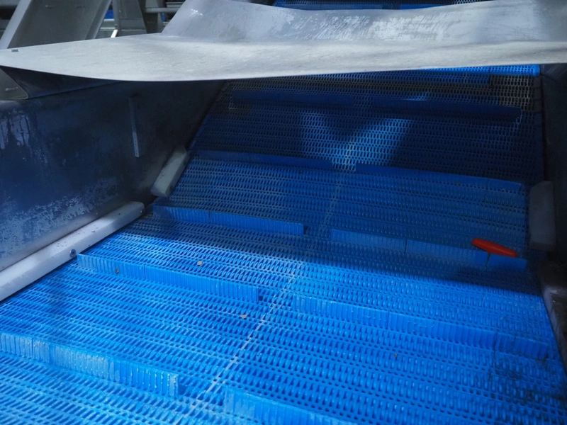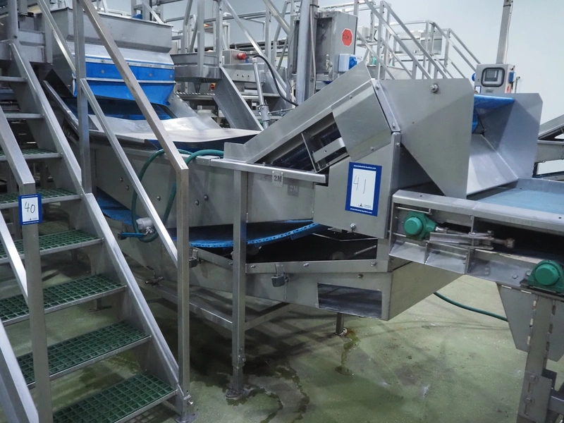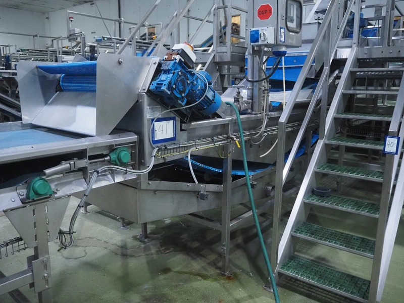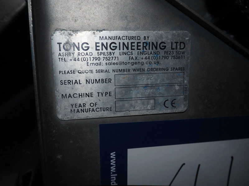 Tong Engineering vegetable washing tub, type: CONVEYOR, serial number: 15932, year of construction: 2014, plastic mesh belt, belt width: 900 mm, divider width: 370 mm, divider height: 25 mm, distance between dividers: 245 mm, outfeed height: 1500 mm, total dimensions: 3300 mm x 1350 mm x 1830 mm. Without dosing unit.