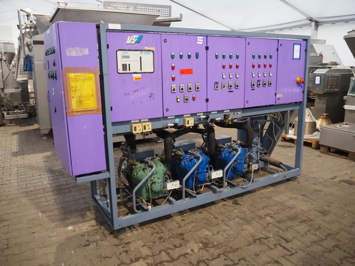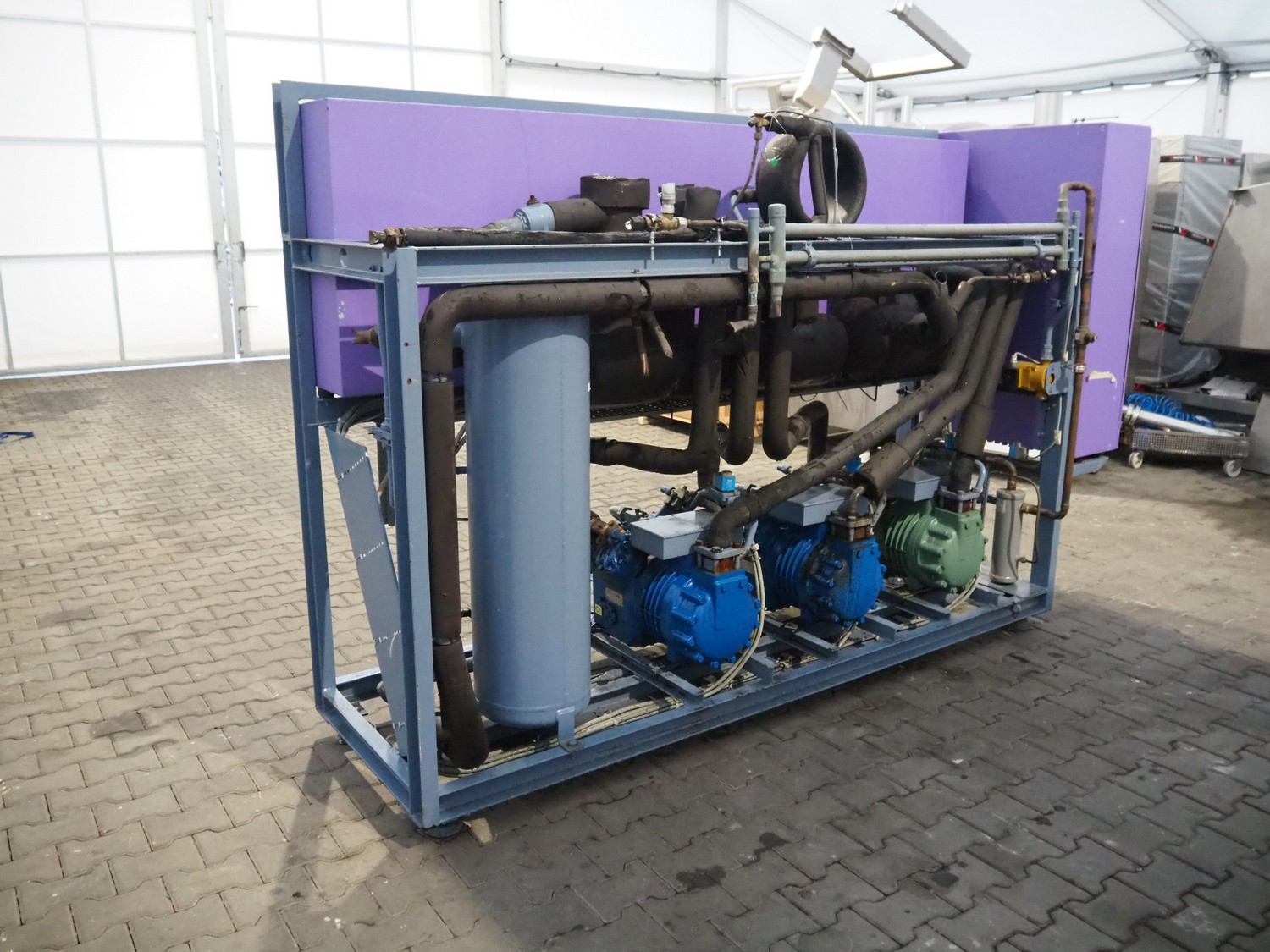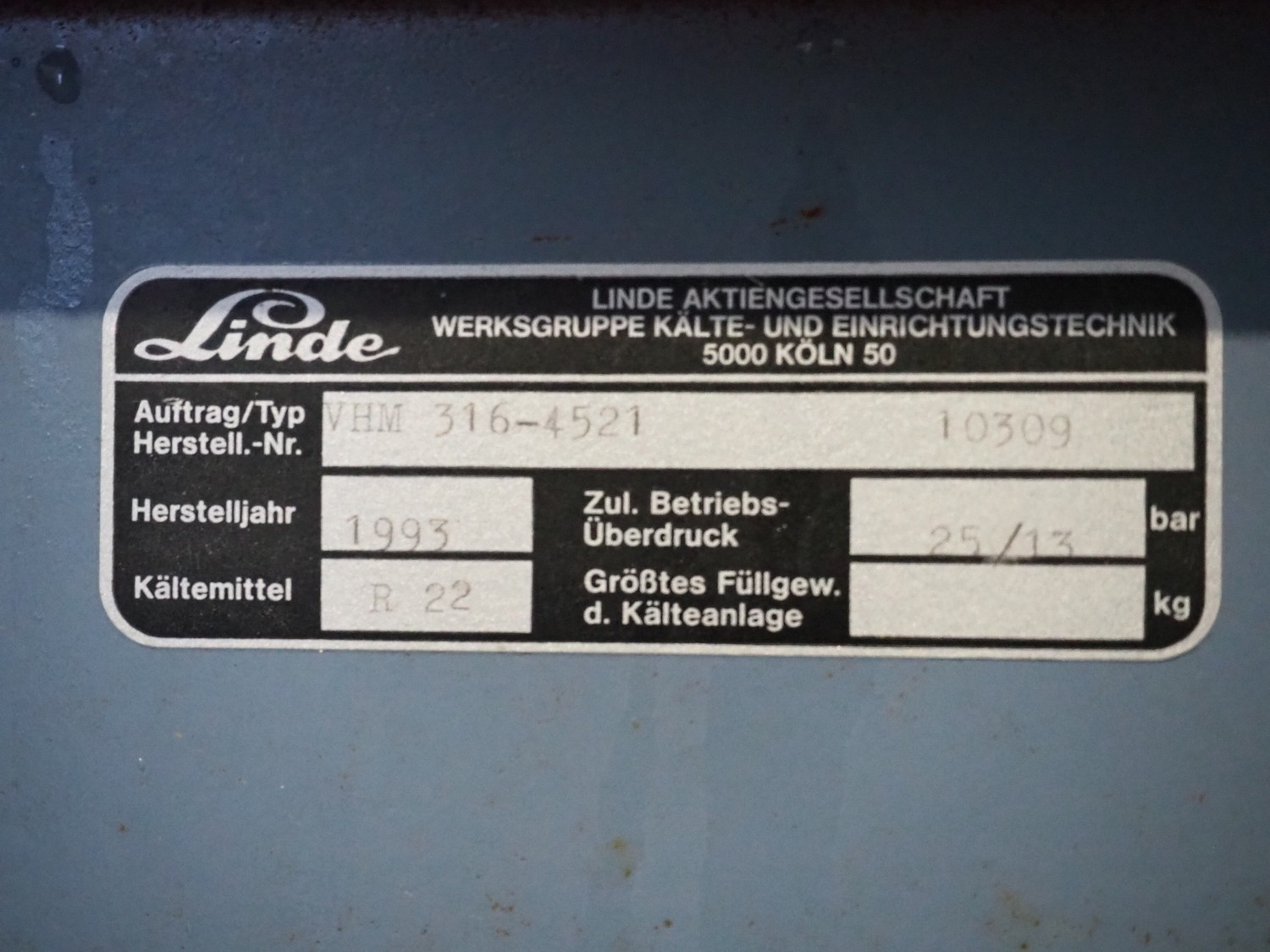Linde / Bitzer Kühlmaschinenbau GmbH compressor rack, type: VHM 316-4521, serial number: 10309, year of construction: 1993, 25/13 bar, refrigerant: R22, (3x) Bitzer Kühlmaschinenbau GmbH cooling compressors, type: (1x) S4G-12.2 Y, (2x) S4G-12.2-40P, 380 / 420 / 440 / 480 V, 3 Ph, 50/60 Hz, capacity: 42.3/51 m³ per hour, dimensions: 2930 mm x 830 mm x 1870 mm.