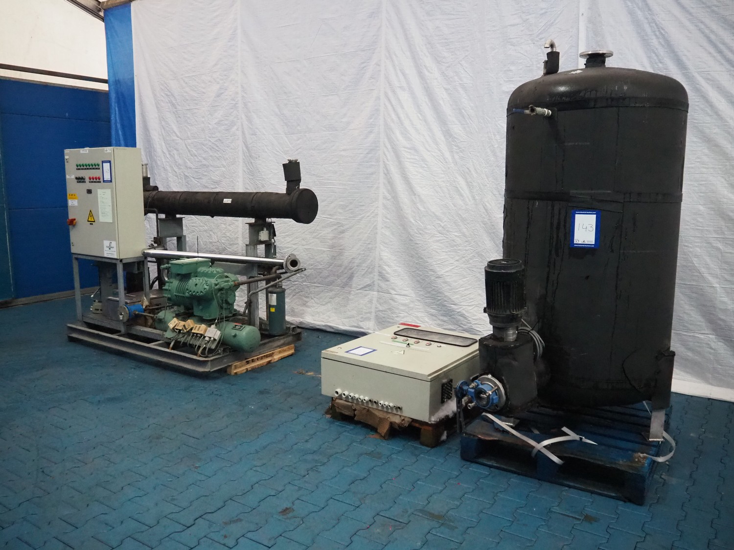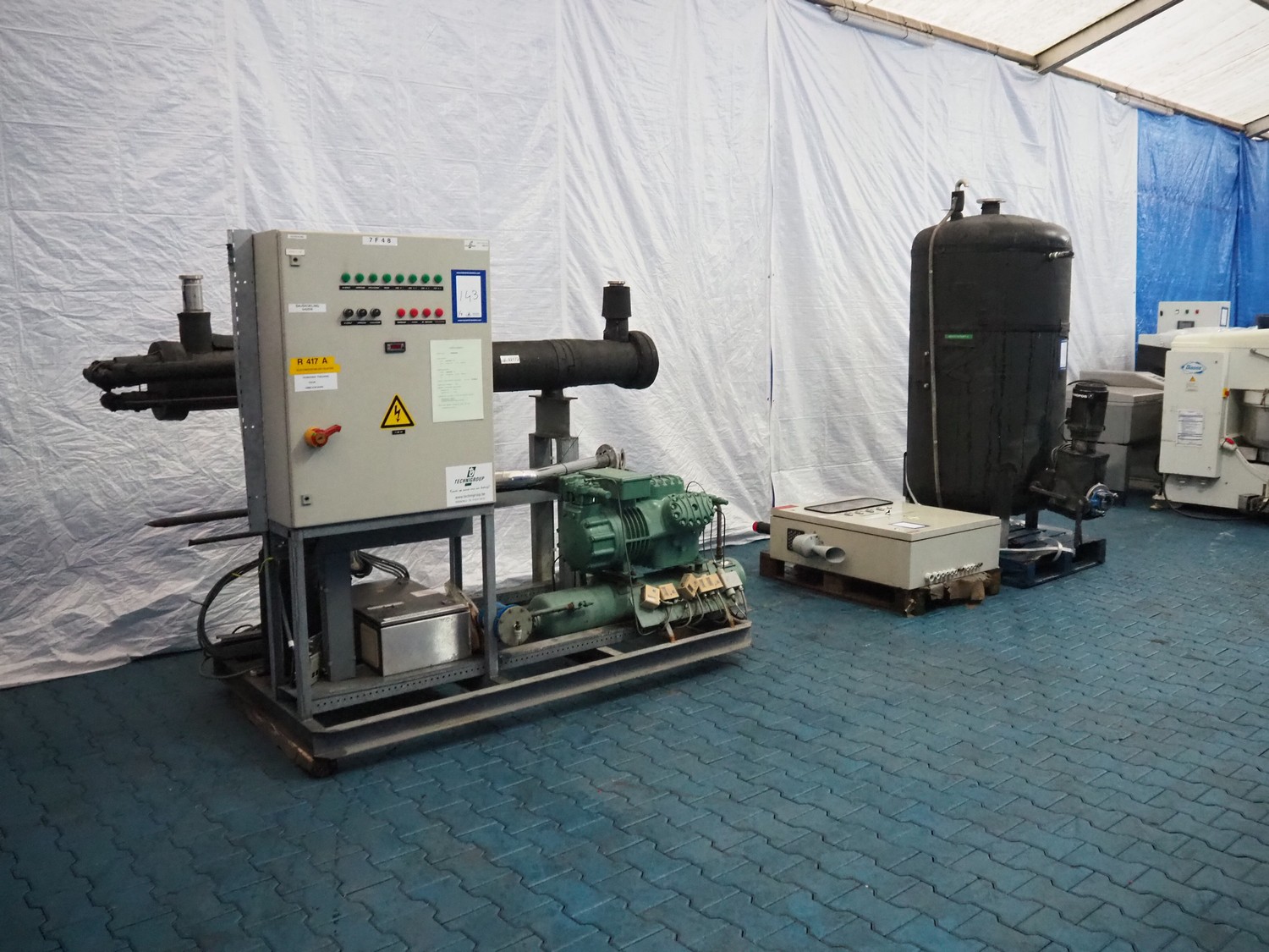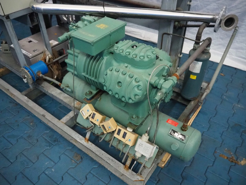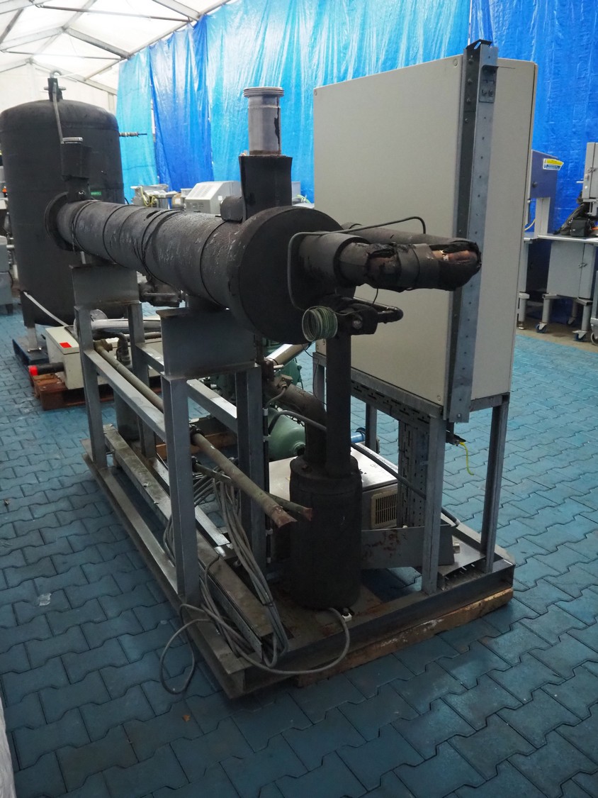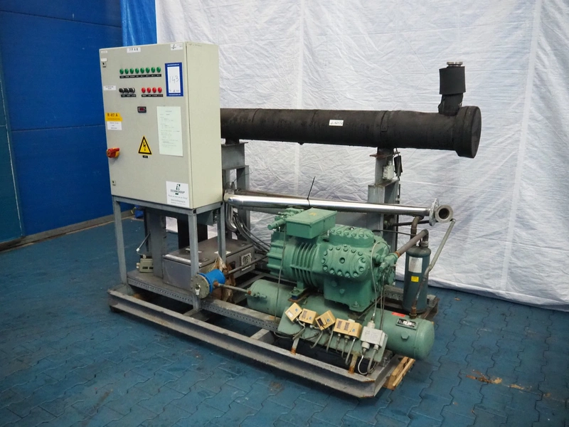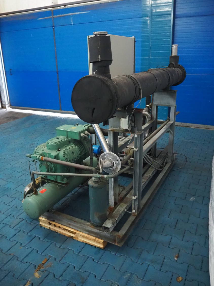 Bitzer cooling compressor, type: F 400 H, number: 4810377, year of construction: 1995, volume: 39 liter, dimensions: 2800 mm x 1300 mm x 1900 mm. Including storage tank and Grundfos circulation pump, dimensions: Ø 1100 mm x 2600 mm and pallet with switch cabinet, dimensions: 850 mm x 1300 mm x 350 mm.