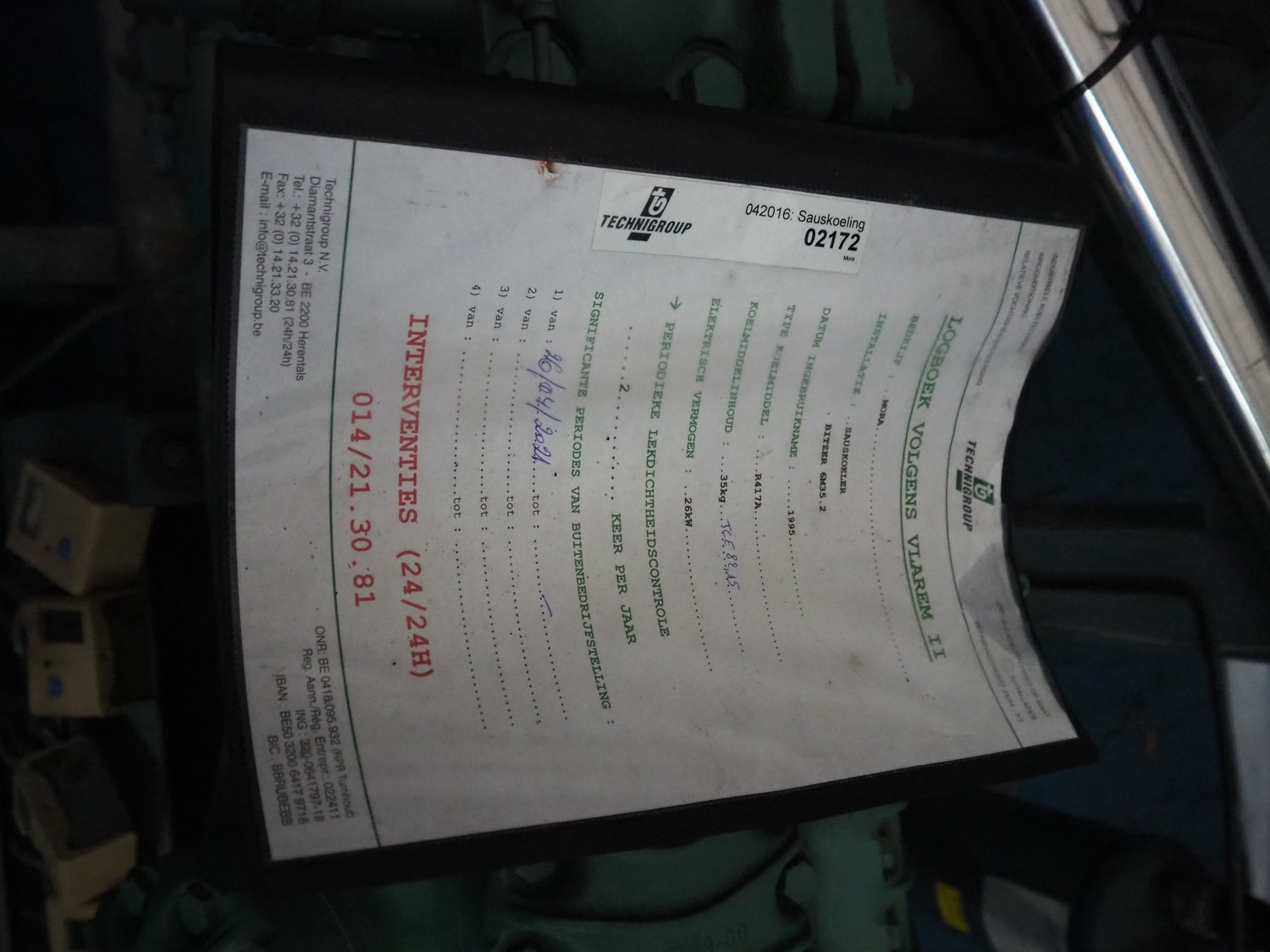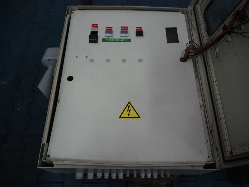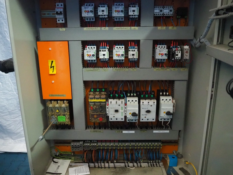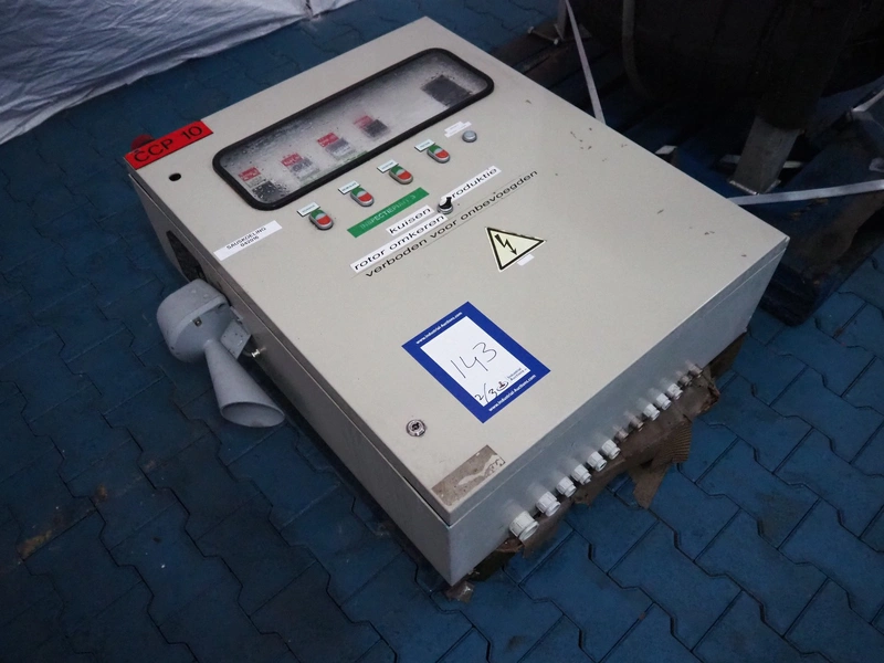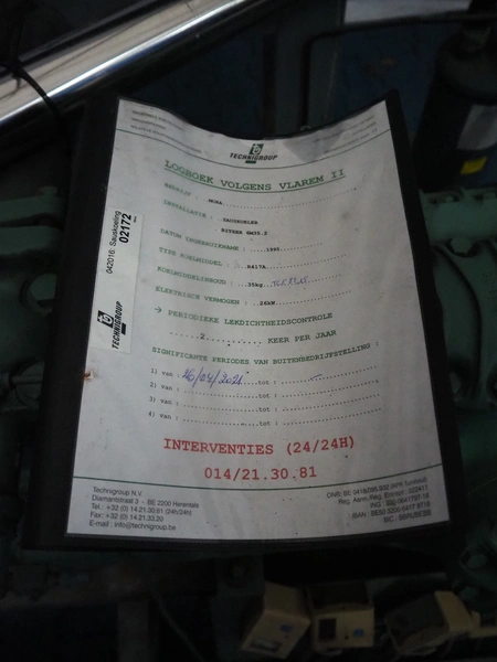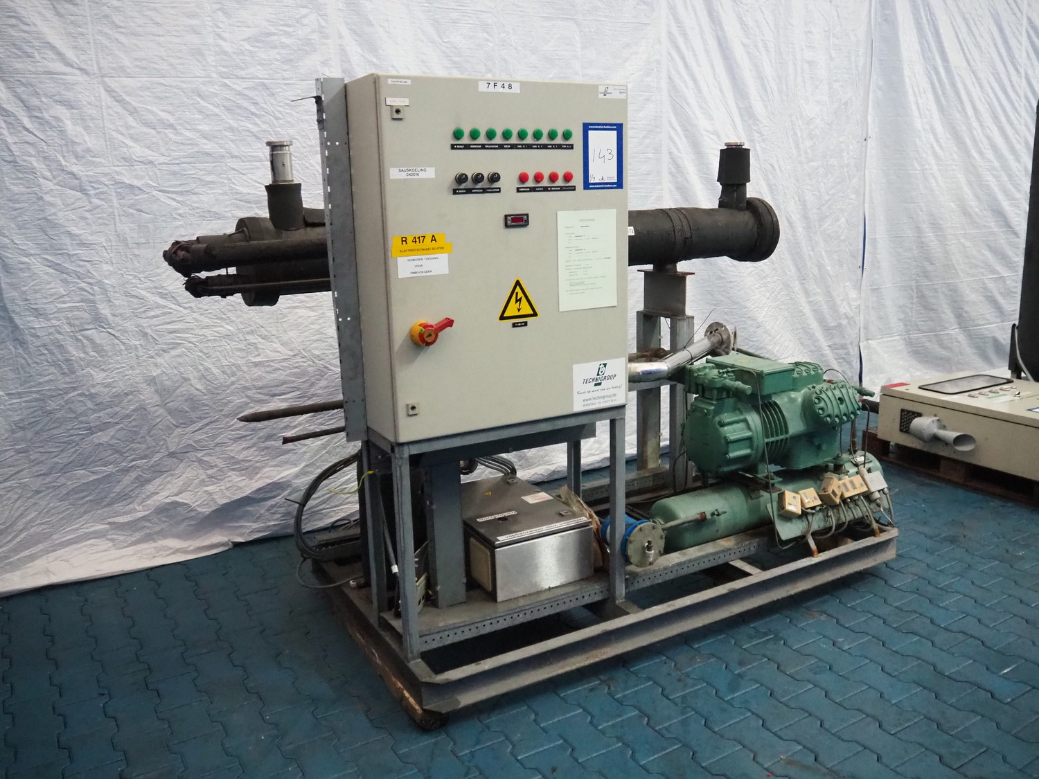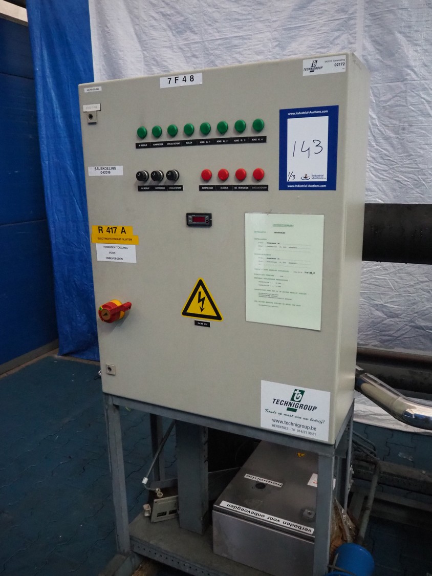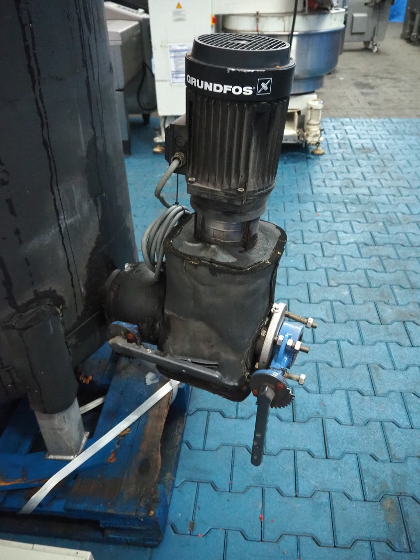 Bitzer cooling compressor, type: F 400 H, number: 4810377, year of construction: 1995, volume: 39 liter, dimensions: 2800 mm x 1300 mm x 1900 mm. Including storage tank and Grundfos circulation pump, dimensions: Ø 1100 mm x 2600 mm and pallet with switch cabinet, dimensions: 850 mm x 1300 mm x 350 mm.