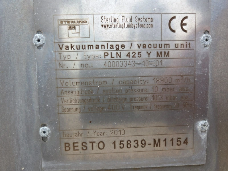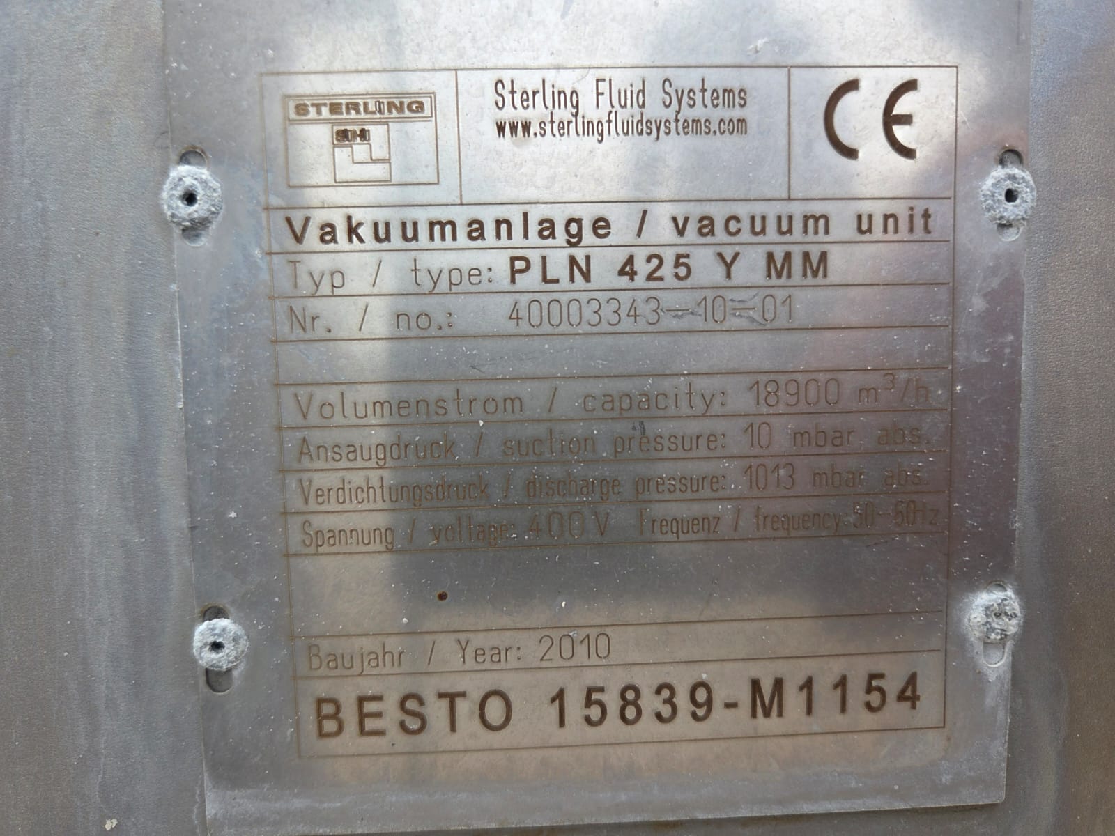 - Sterling Fluid Systems vacuum unit, type: PLN 425 Y MM, serial number: 40003343-10-01, year of construction: 2010, 400 V, 50/60 Hz, capacity: 18900 m³/h, suction pressure: 10 mbar.