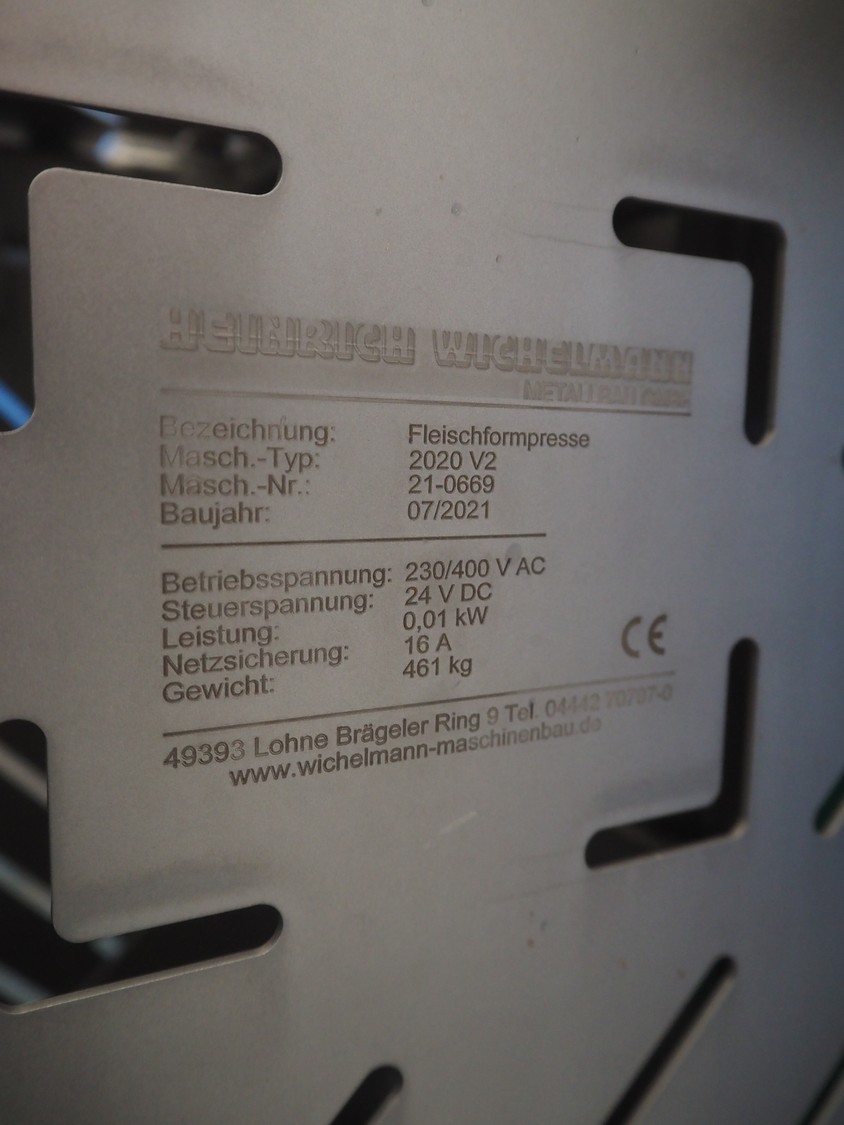 Heinrich Wichelmann meat press, type: 2020 V2, serial number: 21-0669, year of construction: 07/2021, 230/400 V, 16 A, weight: 461 kg, dye dimensions: 800 mm x 80 mm x 105 mm, total dimensions: 2050 mm x 700 mm x 1700 mm.