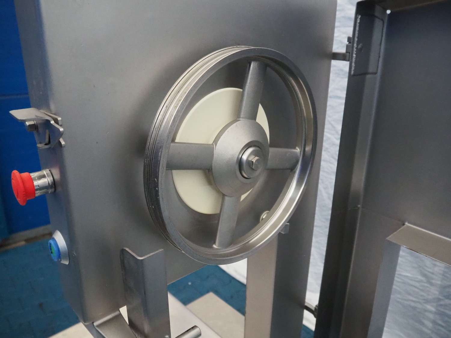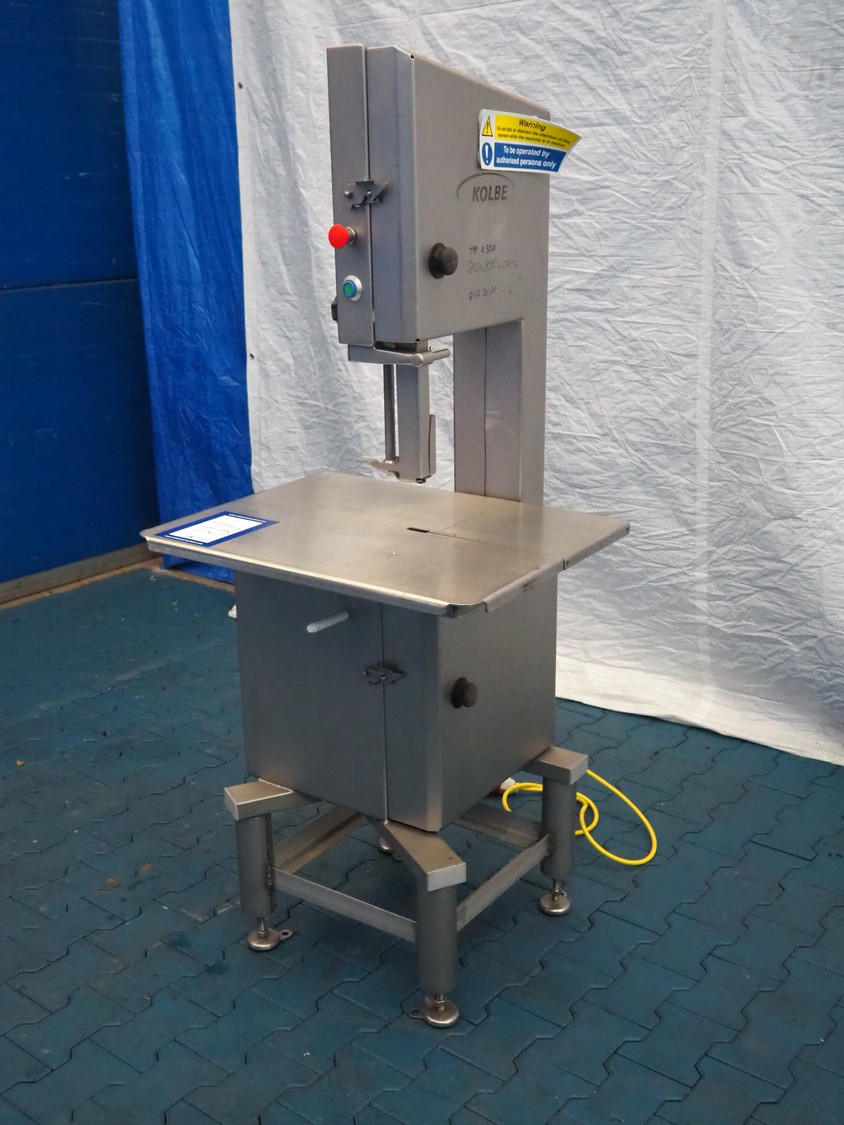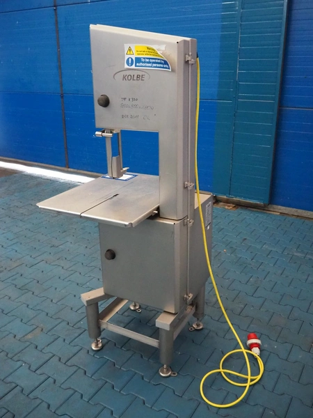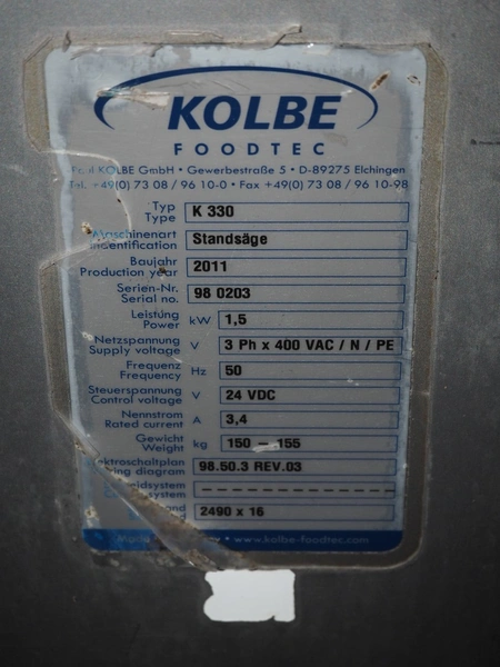 Kolbe bandsaw, type: K 330, serial number: 98 0203, year of construction: 2011, 400 V, 3 Ph, 50 Hz, 3.4 A, 1.5 kW, weight: 150-155 kg, dimensions table: 760 mm x 580 mm, total dimensions: 760 mm x 720 mm x 1750 mm.