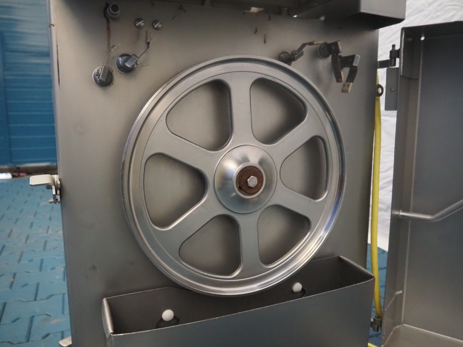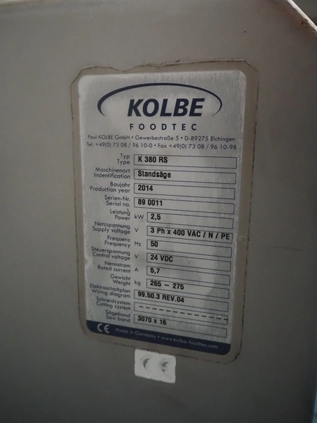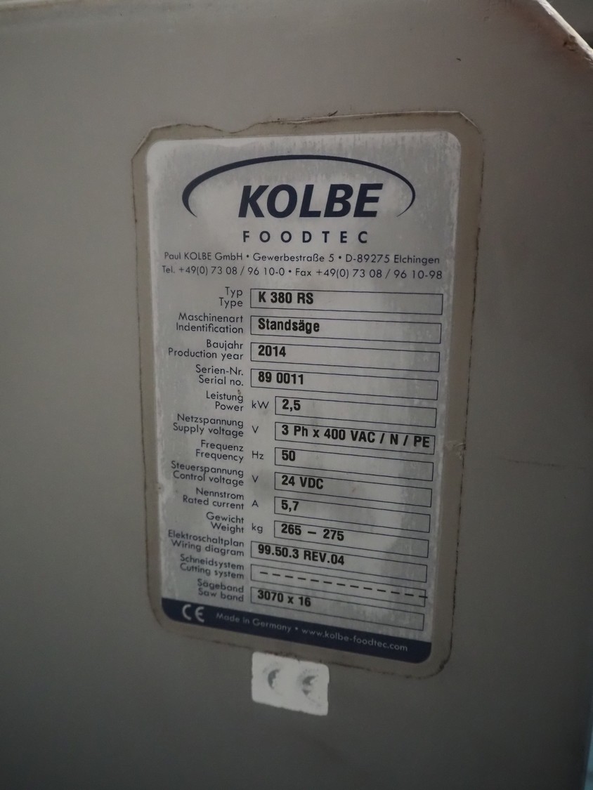Kolbe mobile bandsaw, type: K 380 RS, serial number: 89 0011, year of construction: 2014, 400 VAC, 3 Ph, 50 Hz, 5.7 A, 2.5 kW, weight: 265-275 kg, s/s rollers, roller width: 380 mm, total dimensions: 600 mm x 860 mm x 1840 mm.