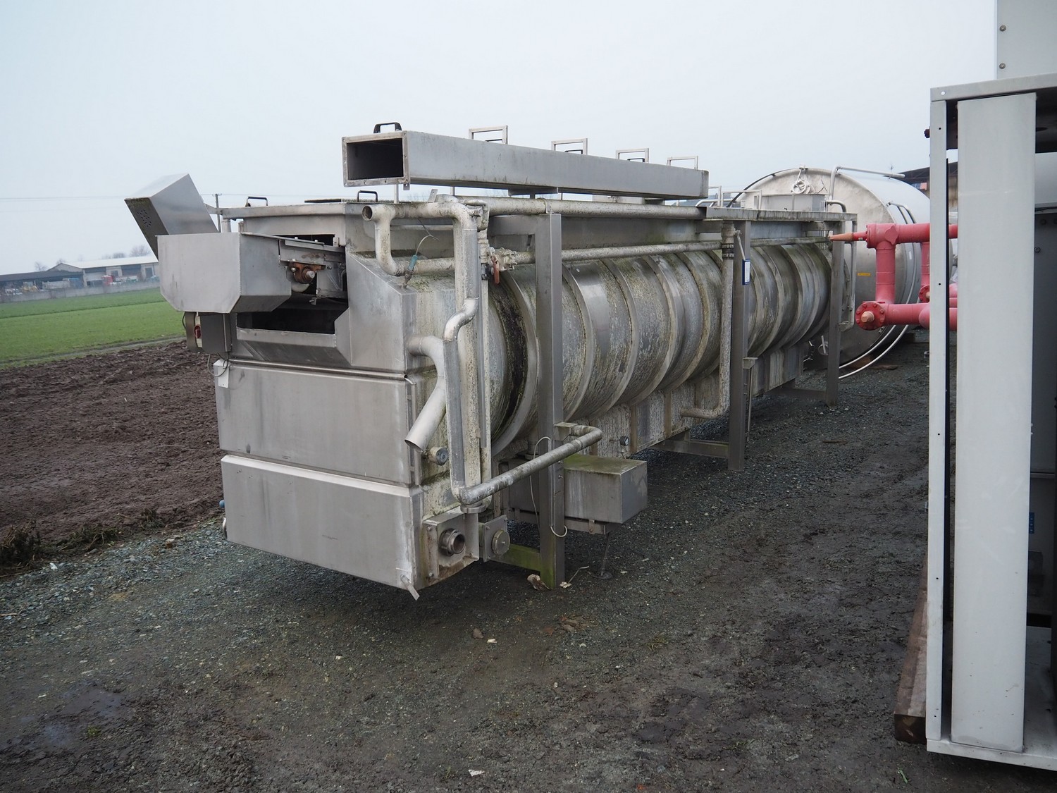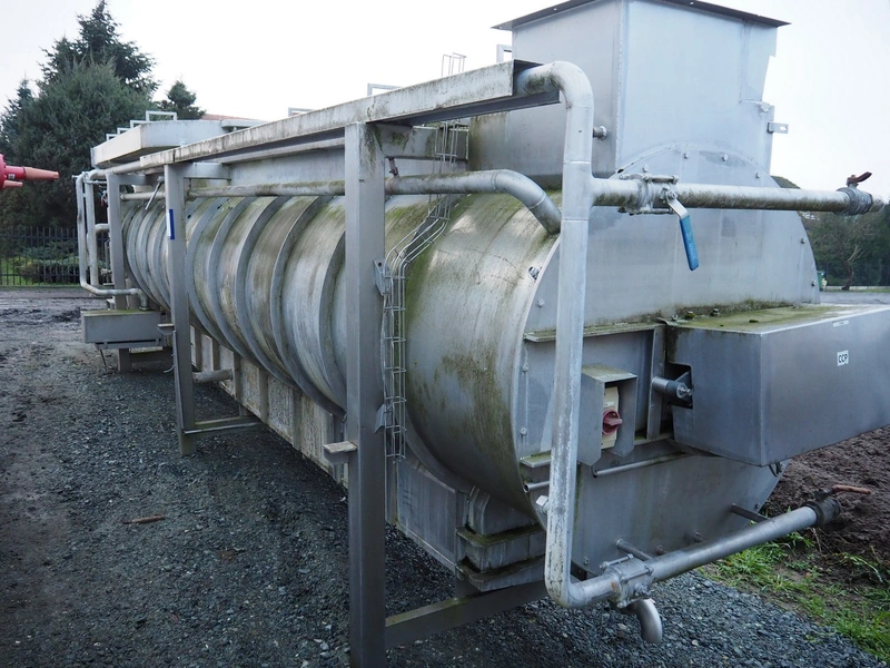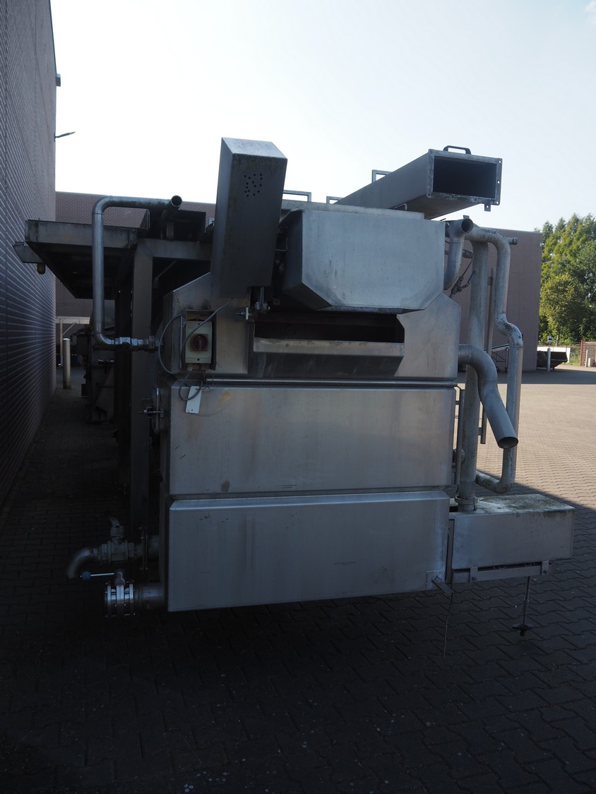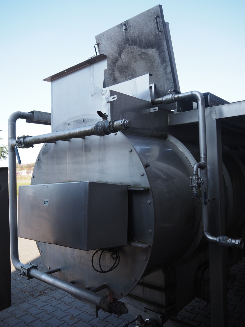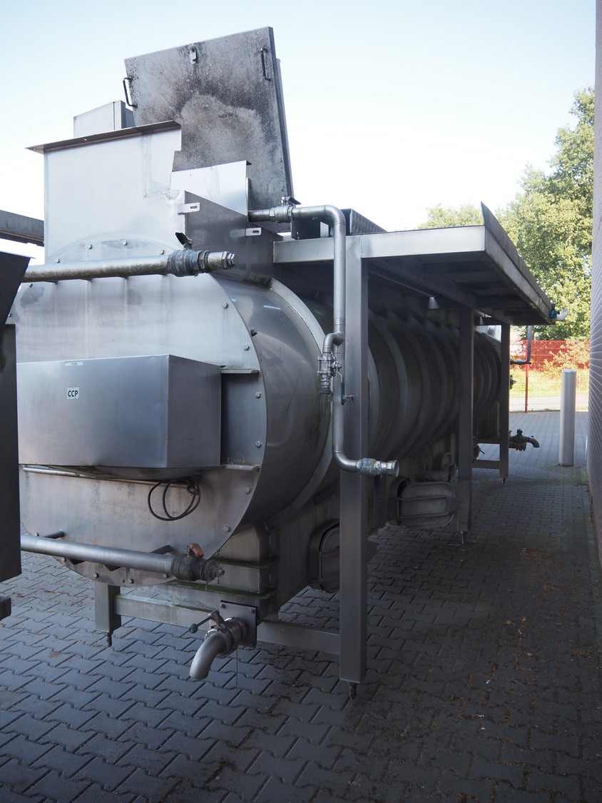 S/s blancher, screw diameter: Ø 1200 mm, tier: 300 mm, s/s mesh belt, belt width: 500 mm, total dimensions: 9000 mm x 2800 mm x 2800 mm.