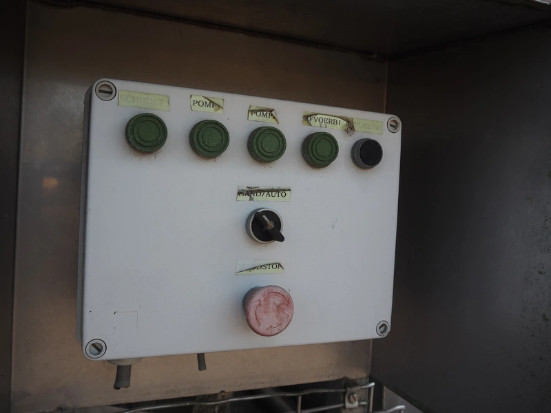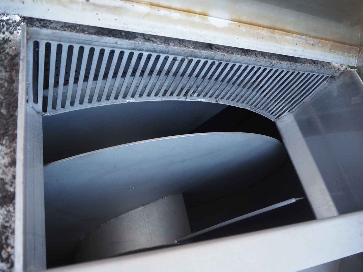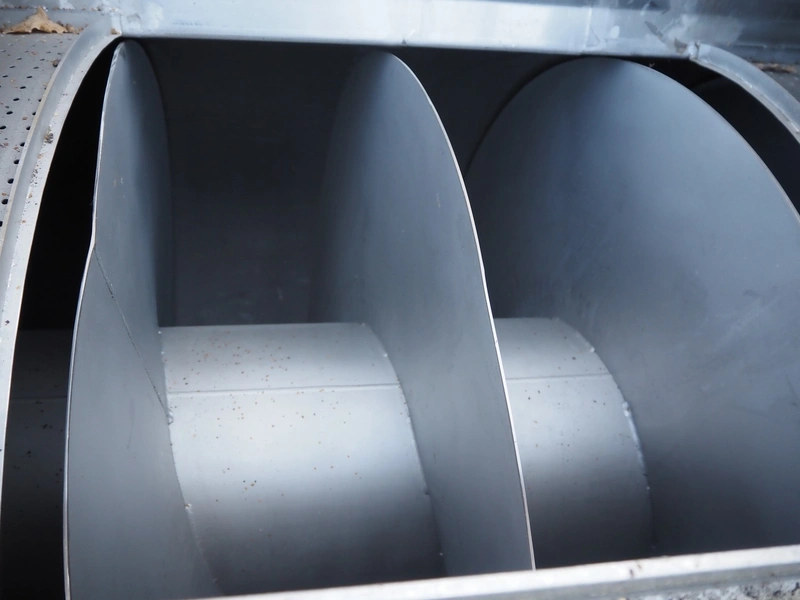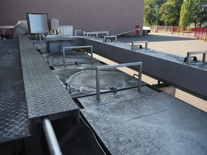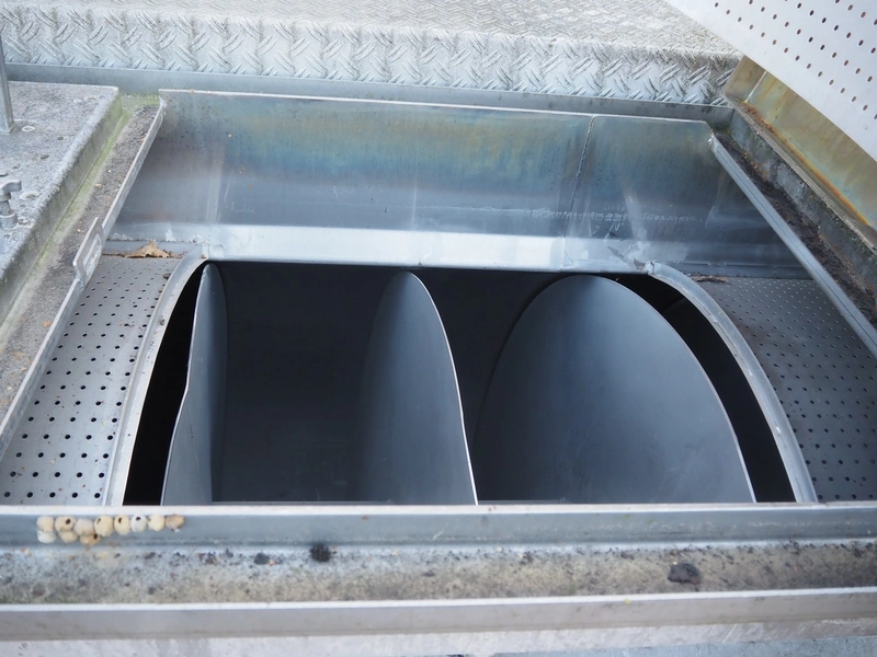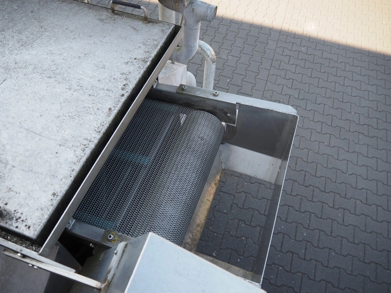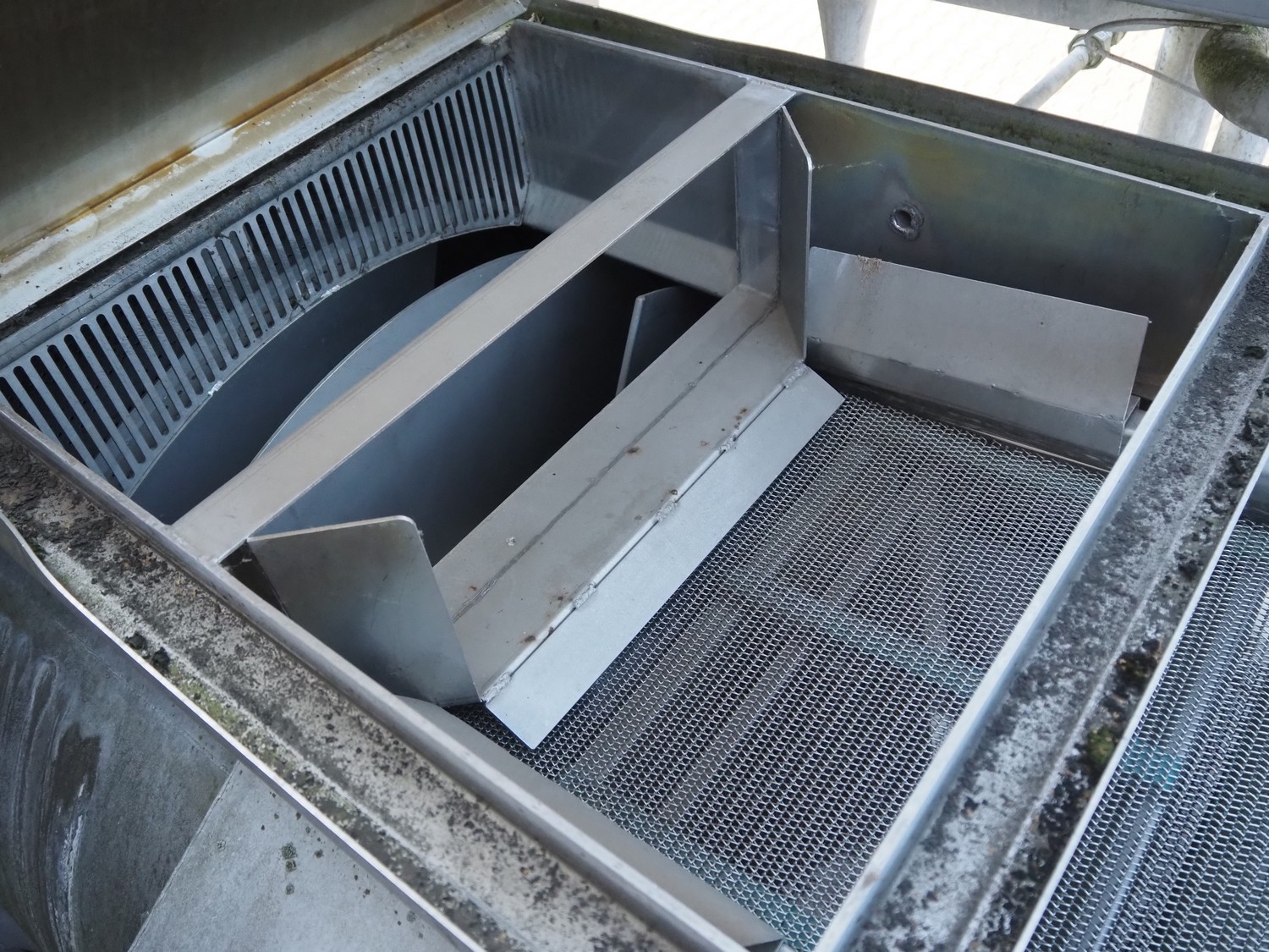 S/s blancher, screw diameter: Ø 1200 mm, tier: 300 mm, s/s mesh belt, belt width: 500 mm, total dimensions: 9000 mm x 2800 mm x 2800 mm.