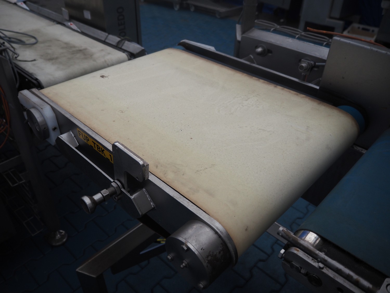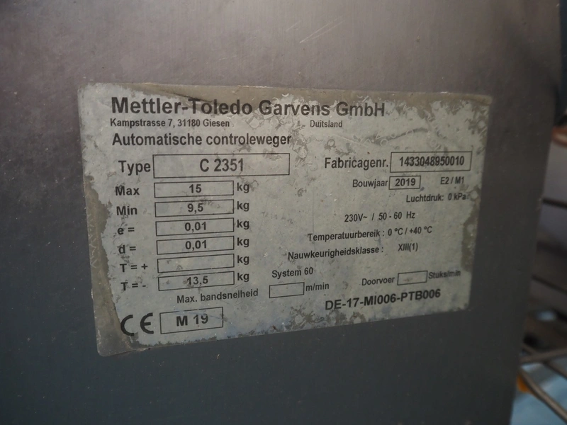 Mettler-Toledo Garvens GmbH checkweigher with scanner, type: C 2351, fabrication number: 1433048950010, year of construction: 2019, 230 V, 50-60 Hz, max: 15 kg, min: 9.5 kg, e- 0.01 kg, belt width: 395 mm and 440 mm, total dimensions: 2300 mm x 1200 mm x 1970 mm.