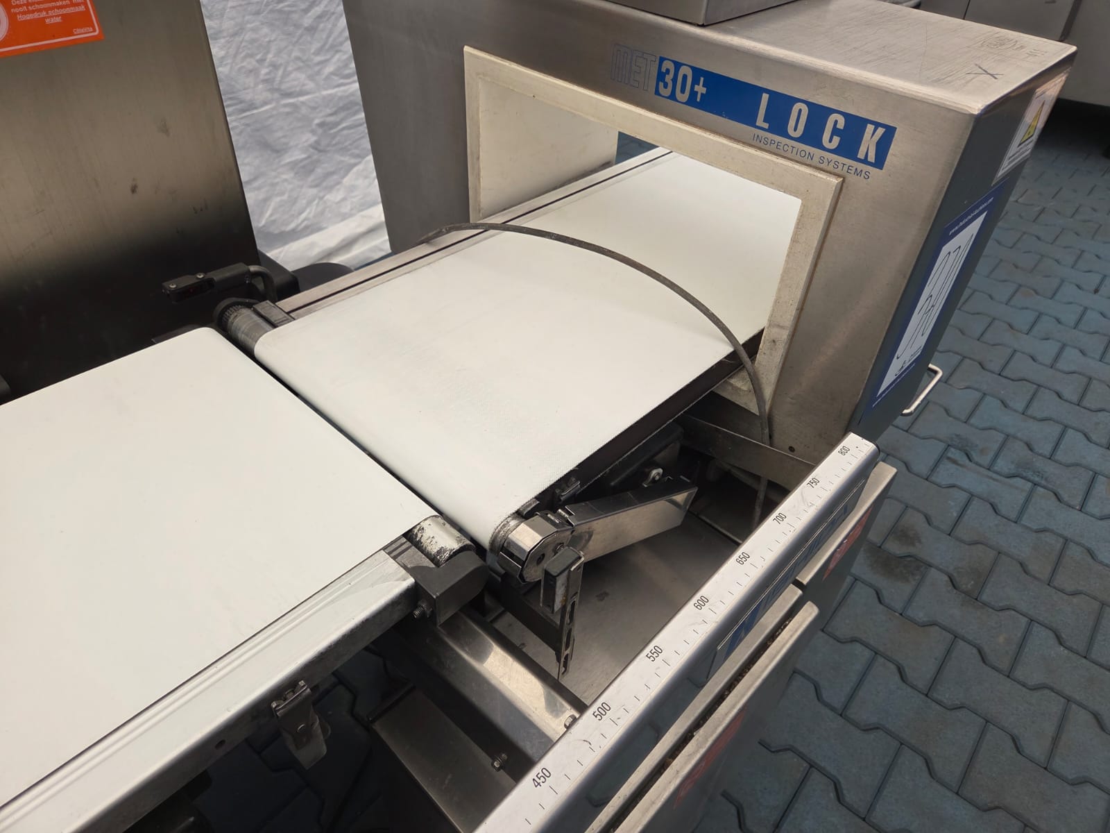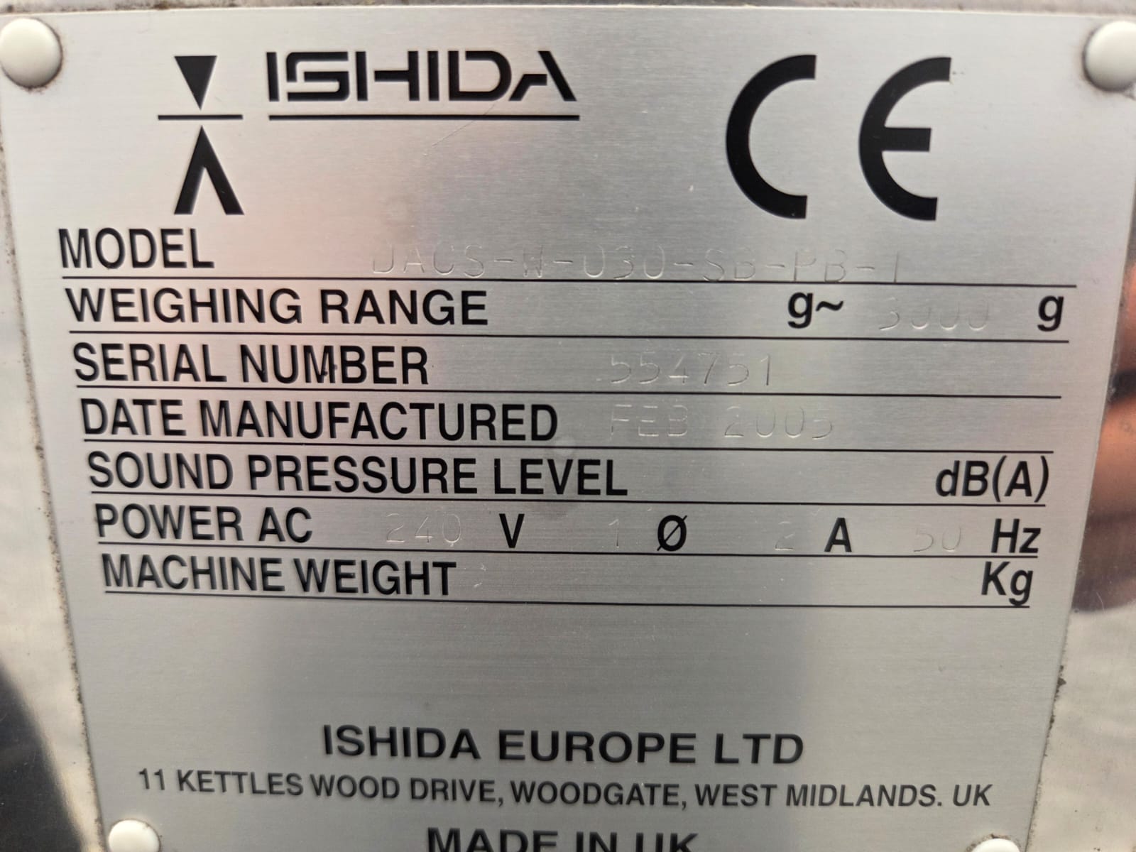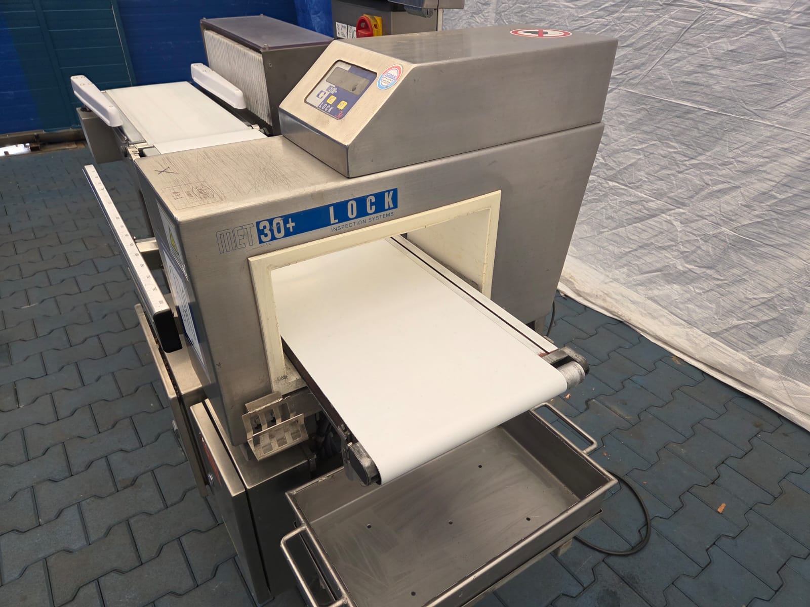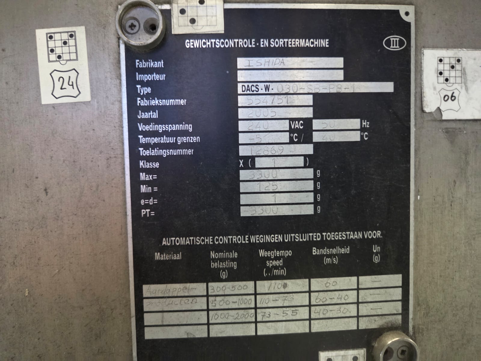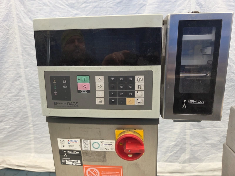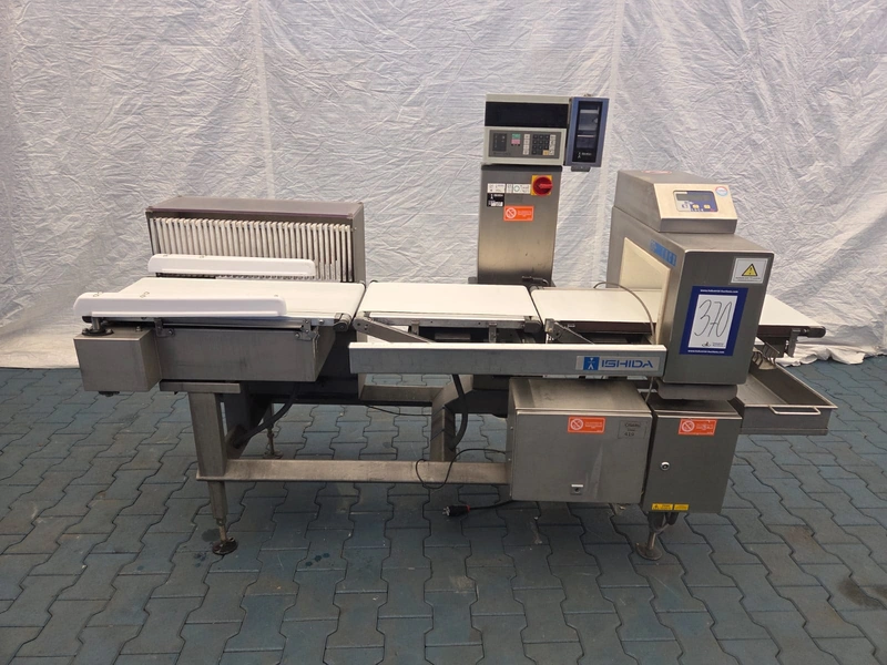 Ishida checkweigher with Lock metal detector, type: DACS-N-030-SB-PB-1, serial number: 554751, year of construction: 02/2005, weighing range: max 3000 g, 240 V, 1 Ph, 50 Hz, 2 A, Lock metal detector type: MET 30+, model: 3F, serial number: 0805.491, plastic belt, belt width: 340 mm, clearance: 360 mm x 140 mm, total dimensions: 2300 mm x 850 mm x 1500 mm.