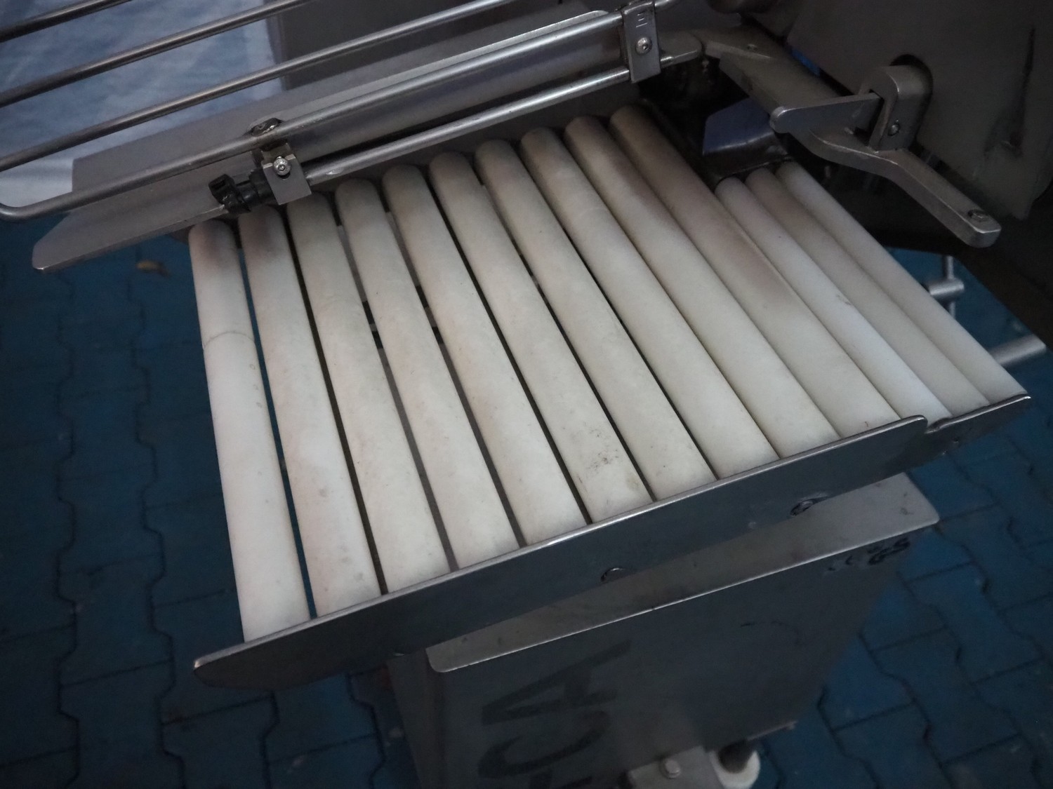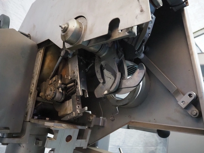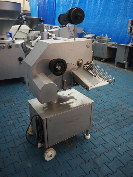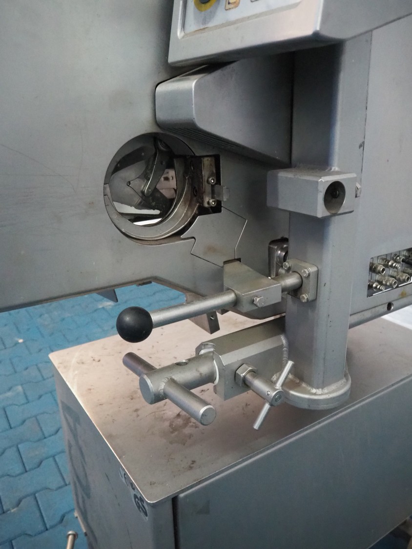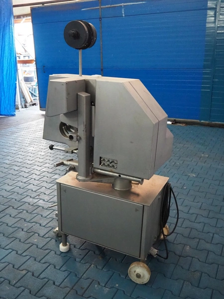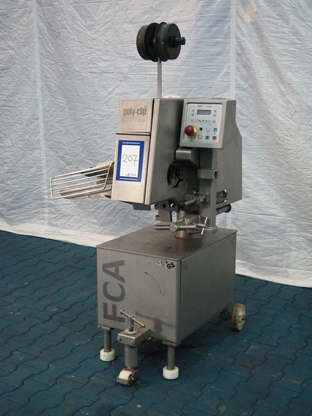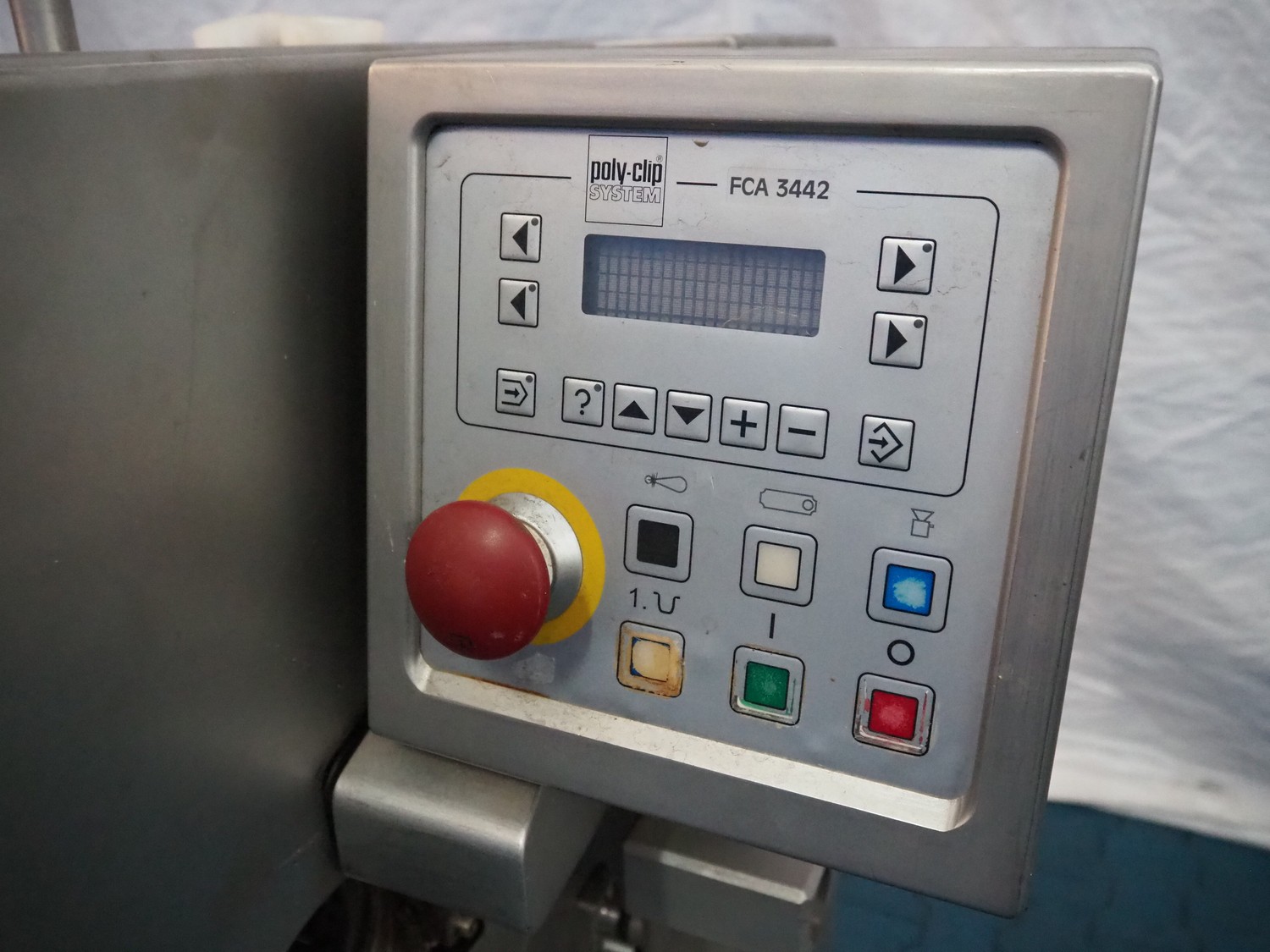Poly-Clip System GmbH & Co. KG mobile automatic double clipper, type: FCA 3442, number: 235, year of construction: 2005, 400 V, 3 Ph, 50/60 Hz, 4 A, 5-7 bar, plastic rollers, roller width: 340 mm, total dimensions: 970 mm x 870 mm x 1820 mm.