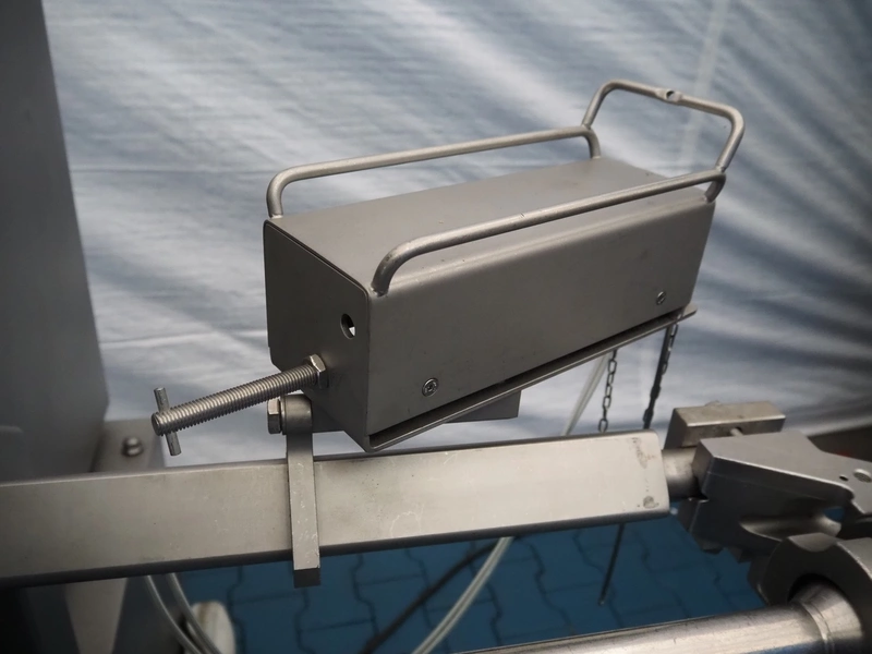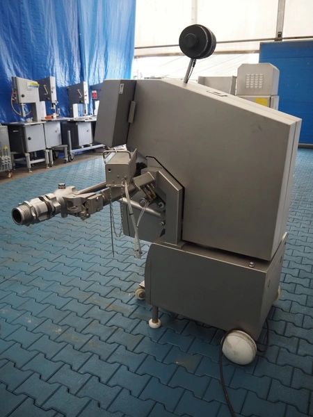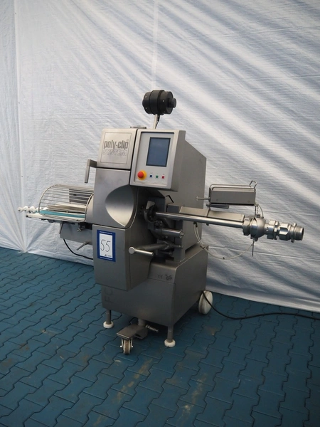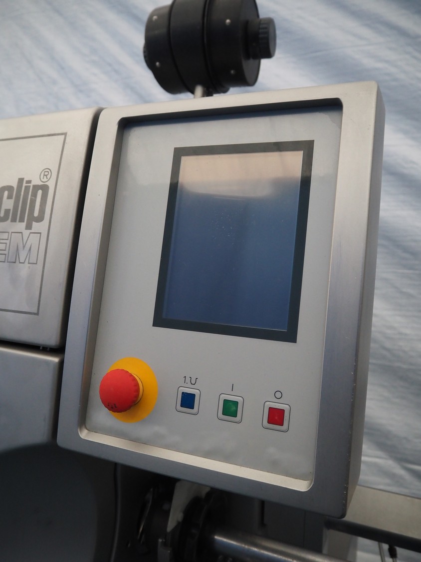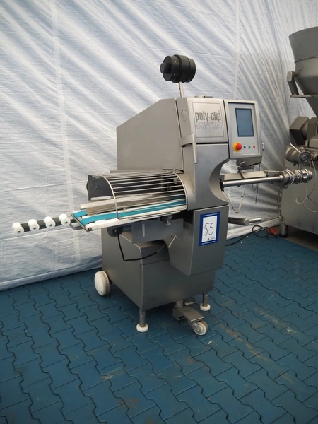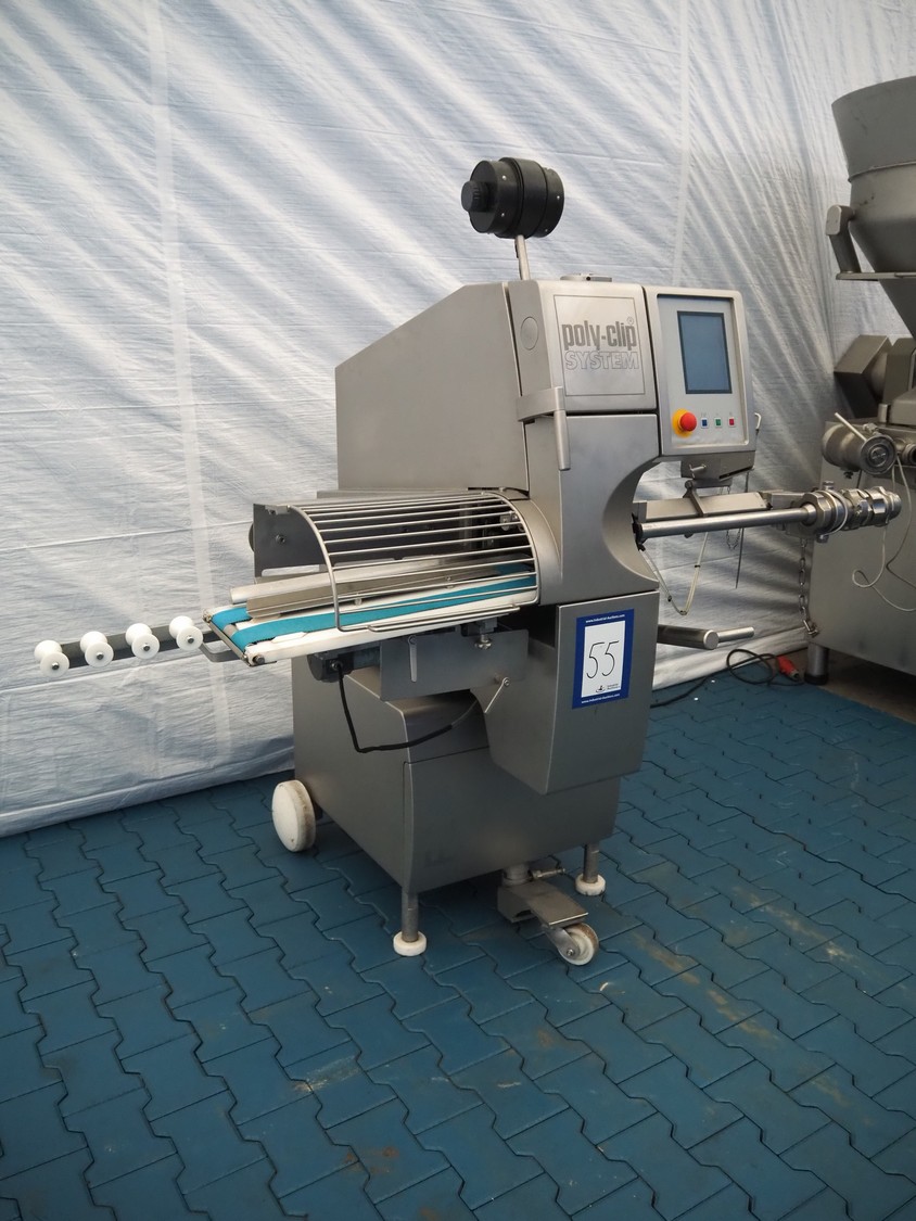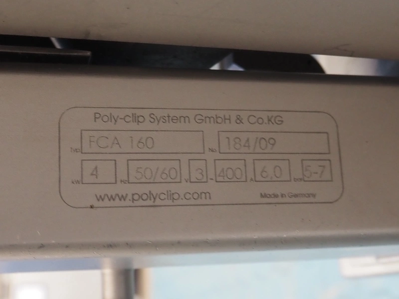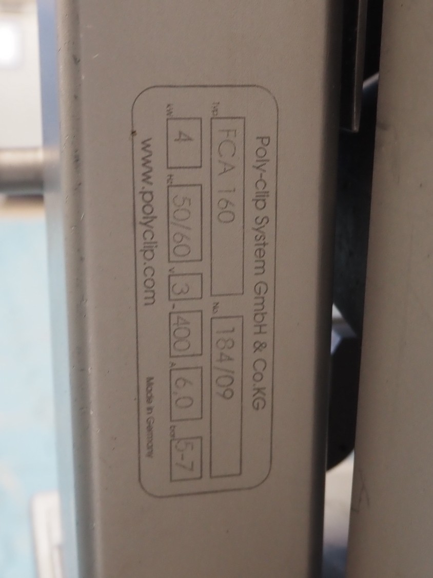 Poly-Clip System GmbH & Co. KG mobile automatic double clipper, type: FCA 160, number: 184, year of construction: 2009, 400 V, 3 Ph, 50/60 Hz, 6.0 A, 4.0 kW, 5-7 bar, dimensions: 1500 mm x 1120 mm x 1850 mm.