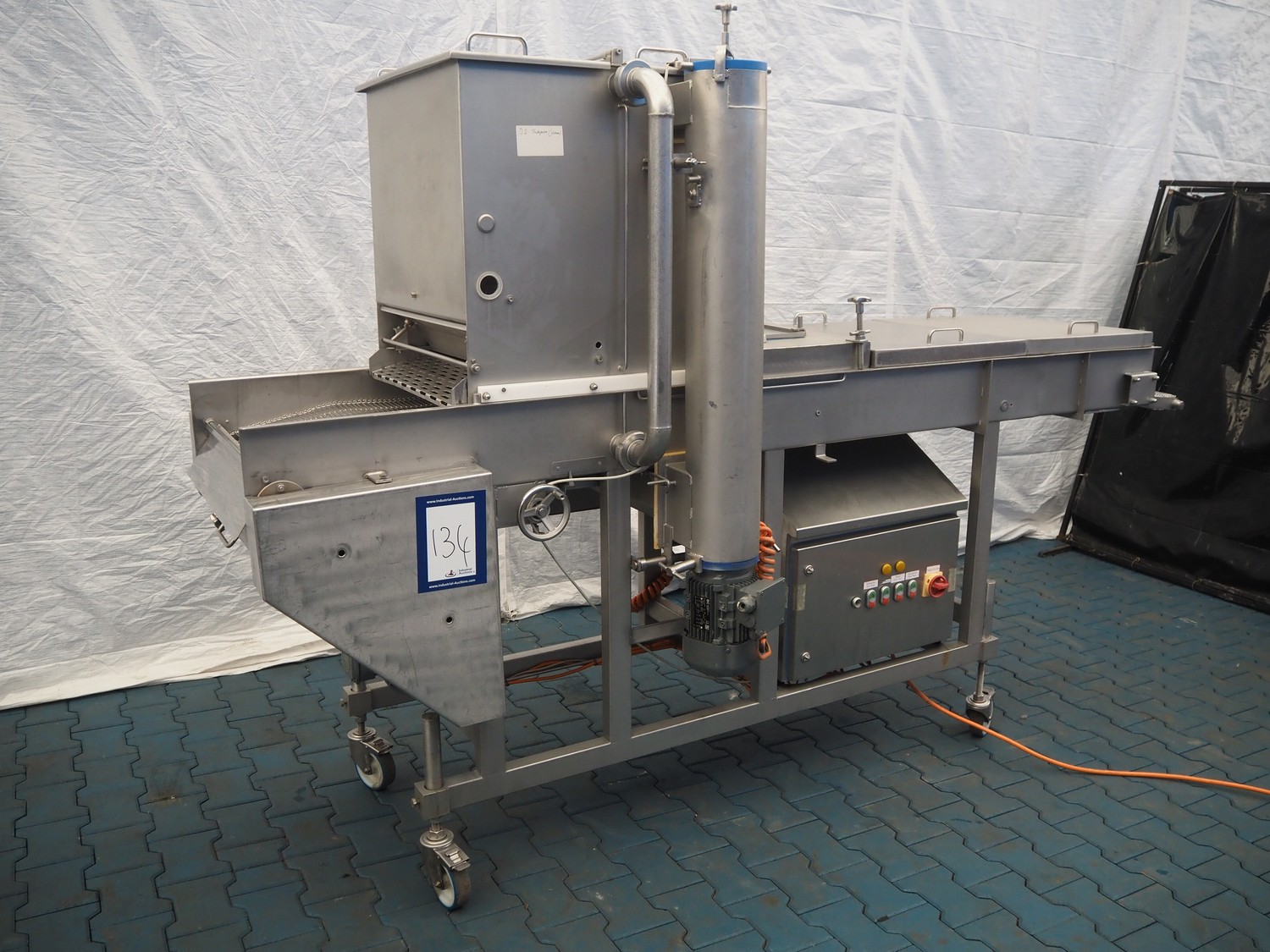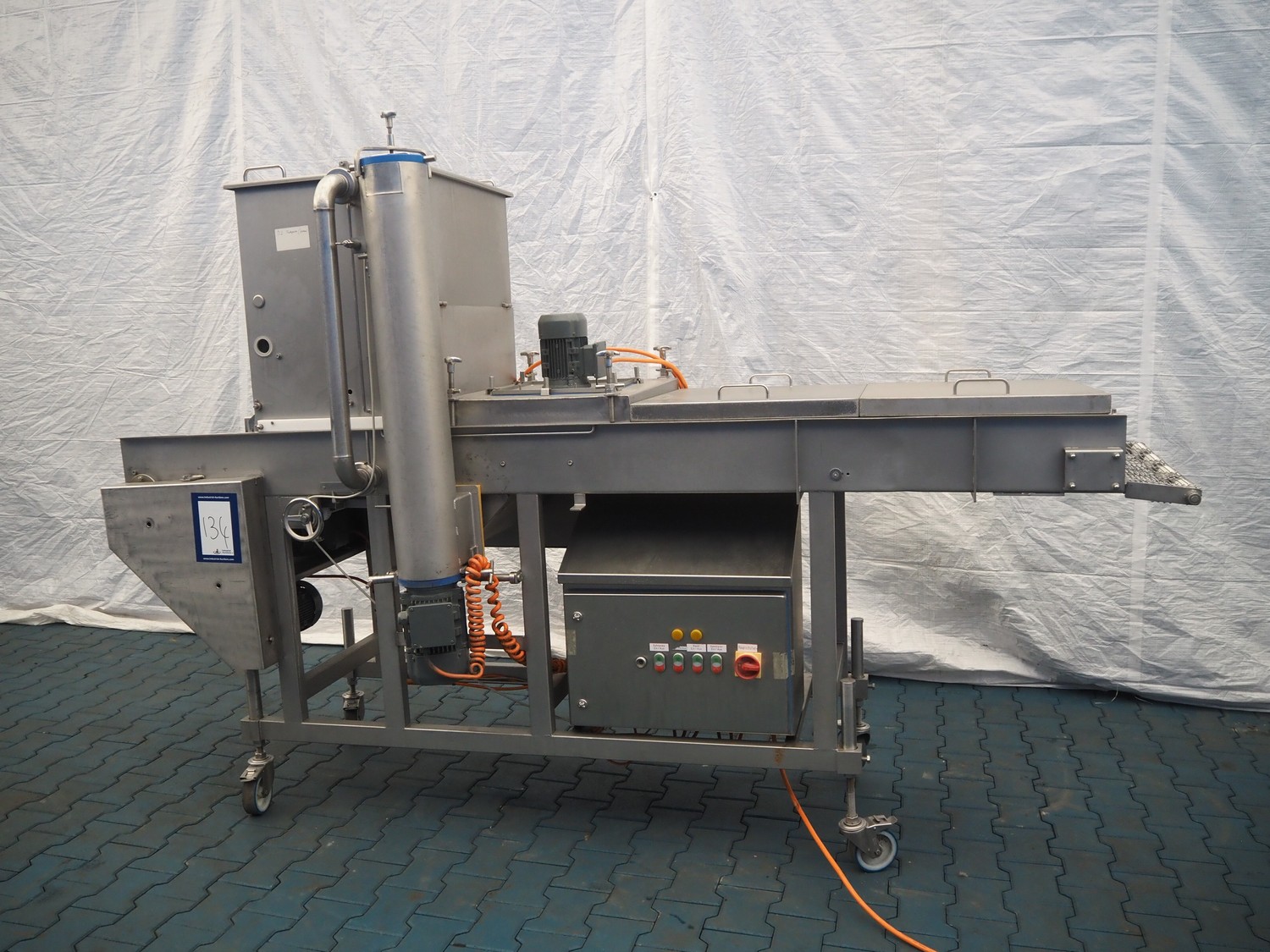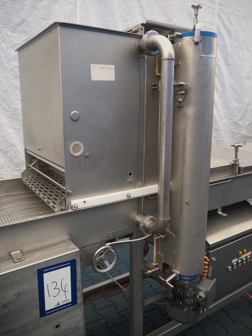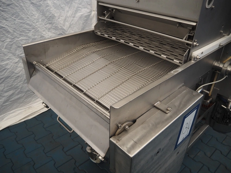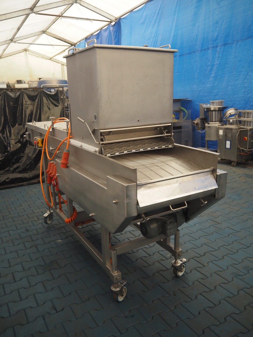 Mobile breading machine, type: STWC-600, serial number: 280515, s/s mesh belt, belt width: 600 mm, total dimensions: 2900 mm x 900 mm x 1930 mm.