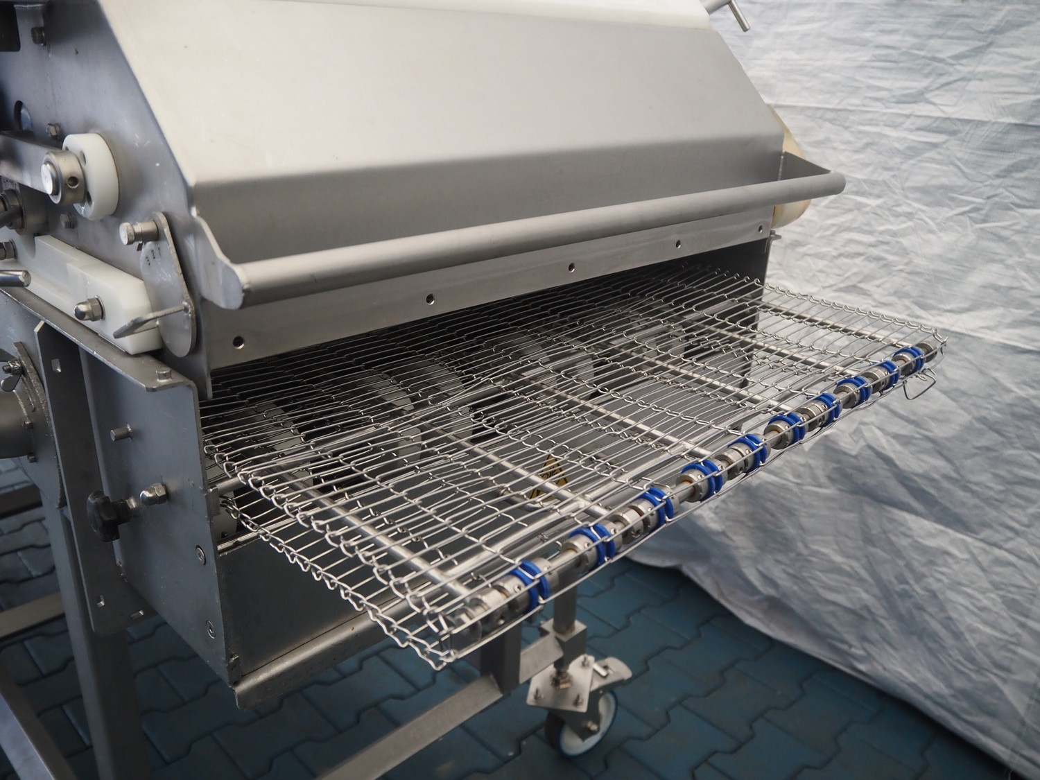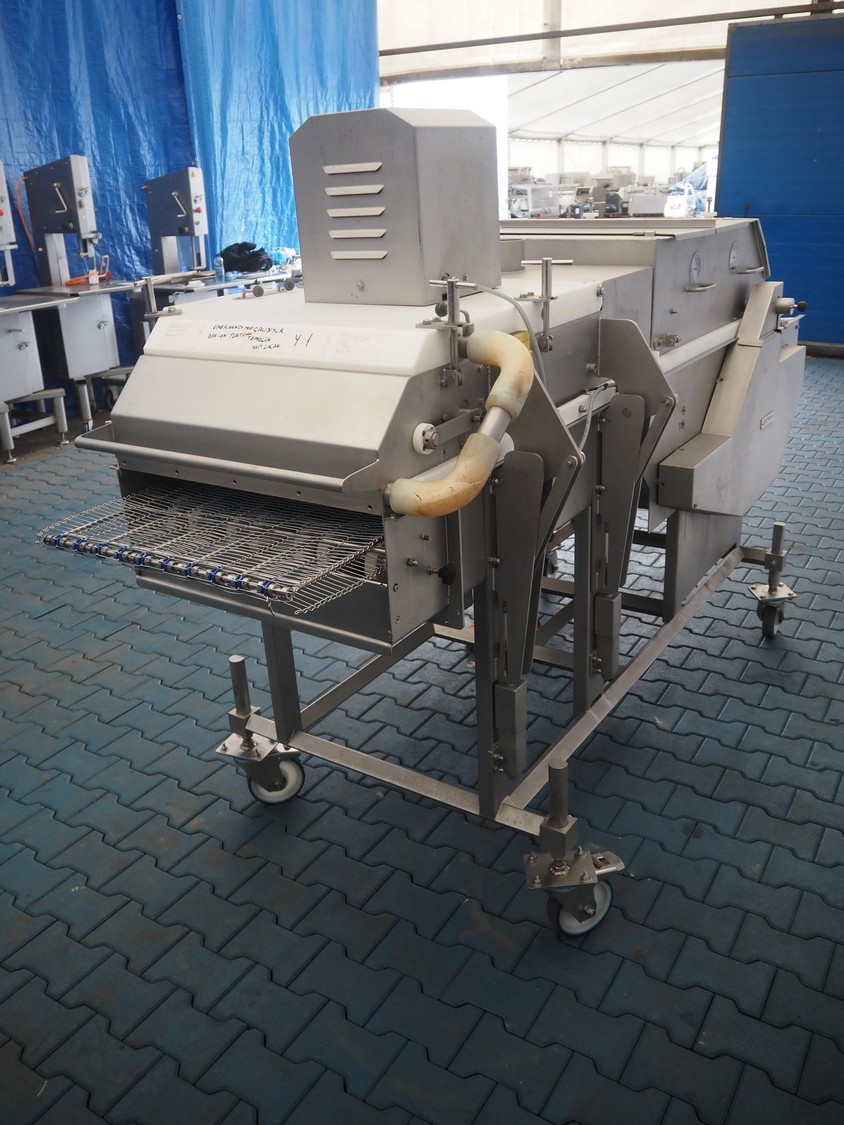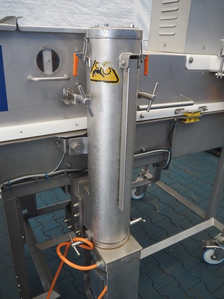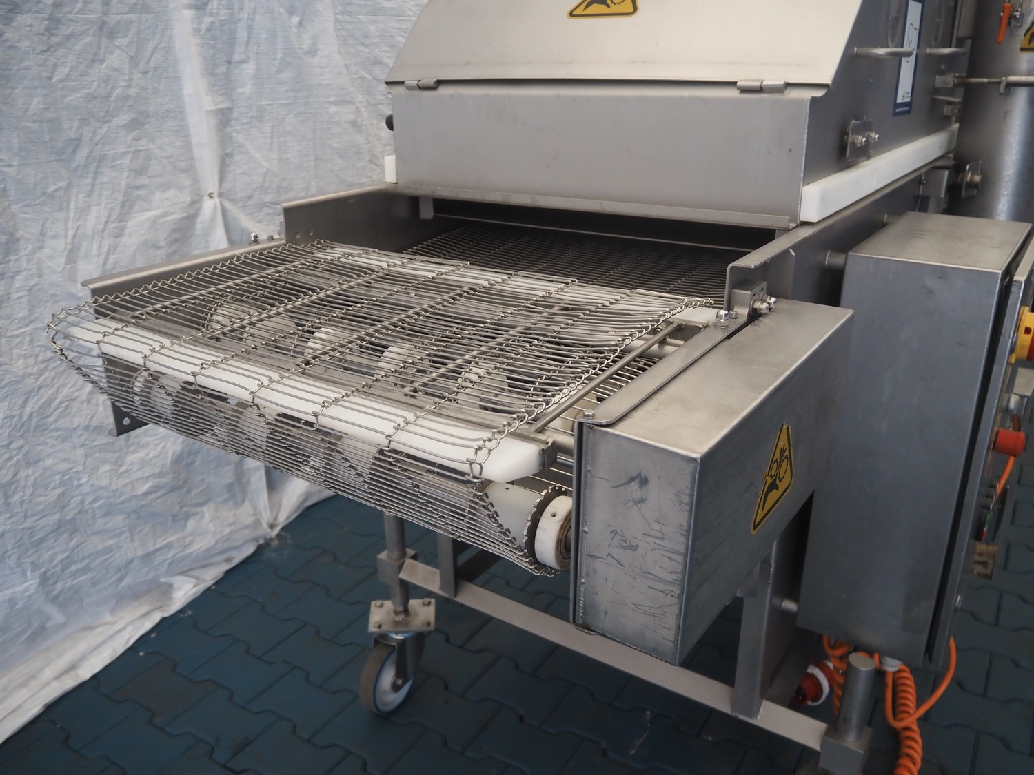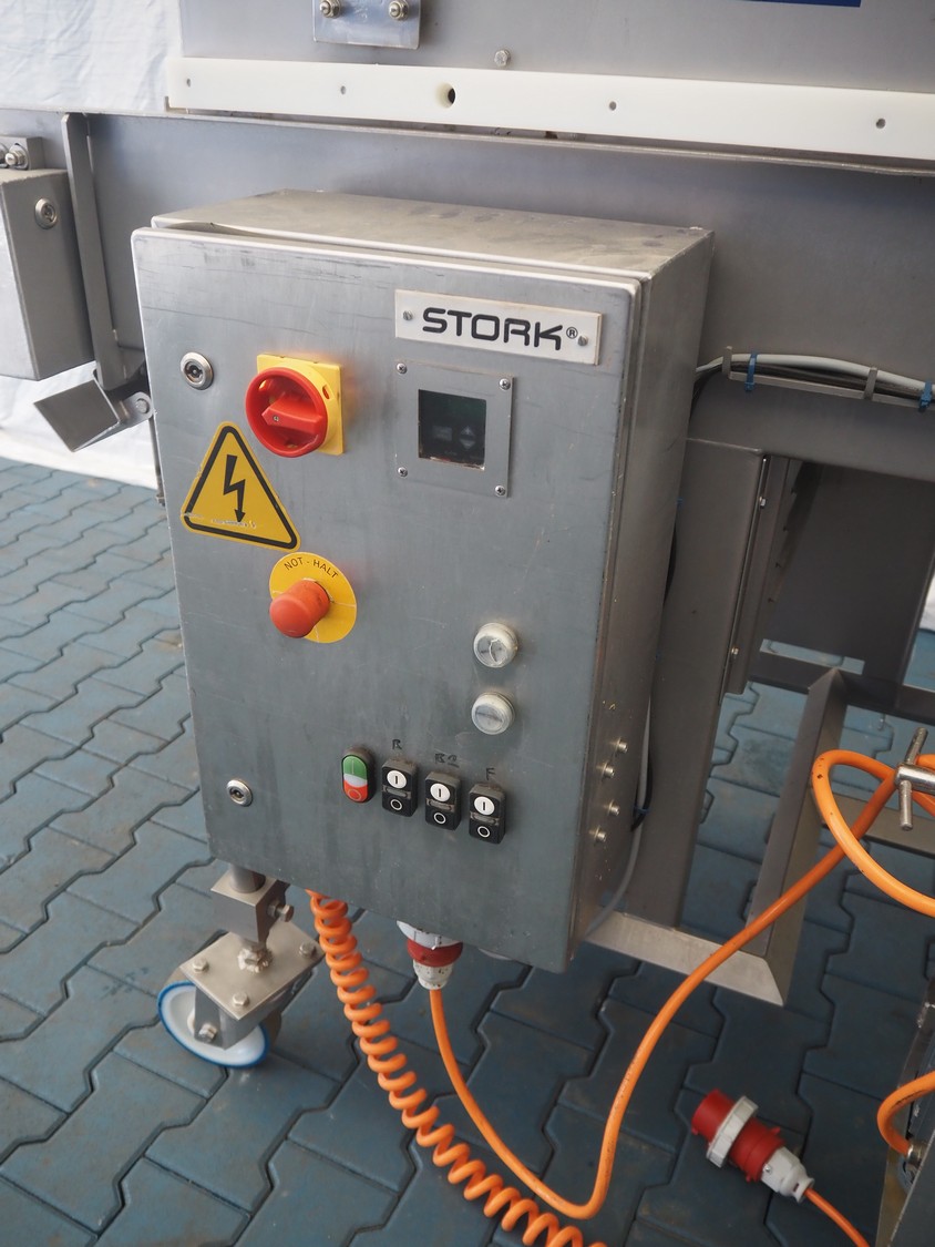 Stork mobile coating machine, s/s mesh belt, belt width: 600 mm, total dimensions: 3000 mm x 1100 mm x 1730 mm.