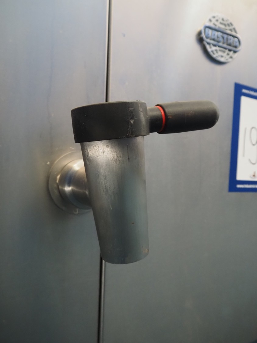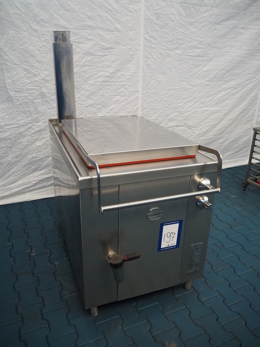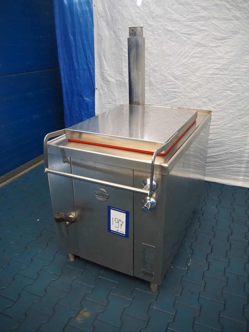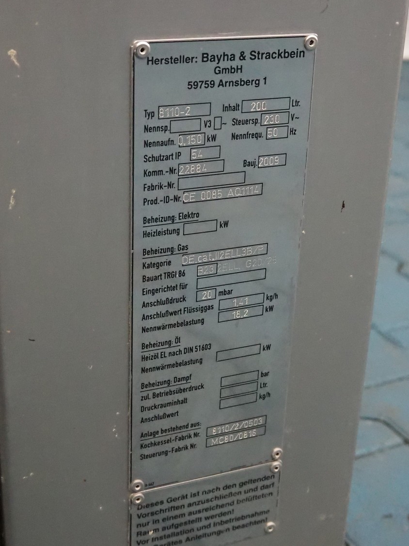 Bastra cooking vessel, type: B110-2, number: 22884, year of construction: 2009, 230 V, 1 Ph, 50 Hz, 0.150 kW, gas heated, volume: 200 liter, dimensions: 1400 mm x 840 mm x 1660 mm.