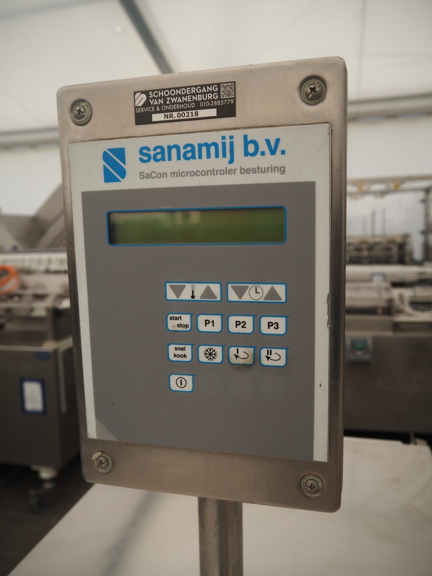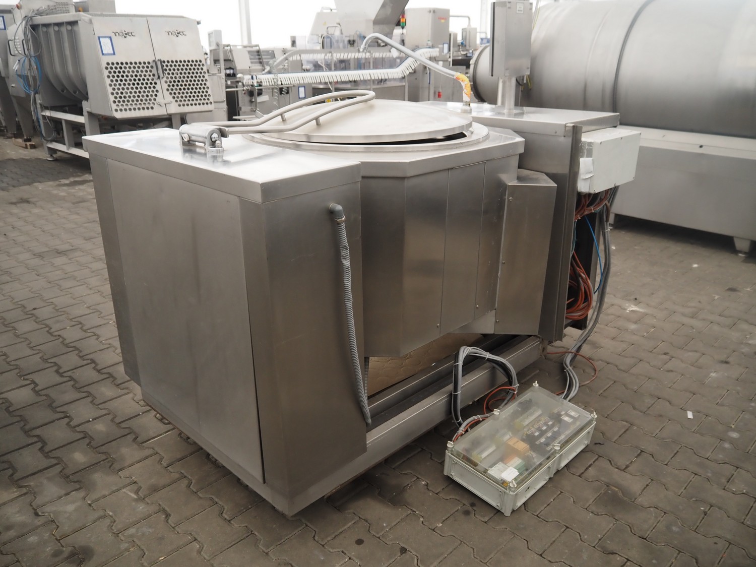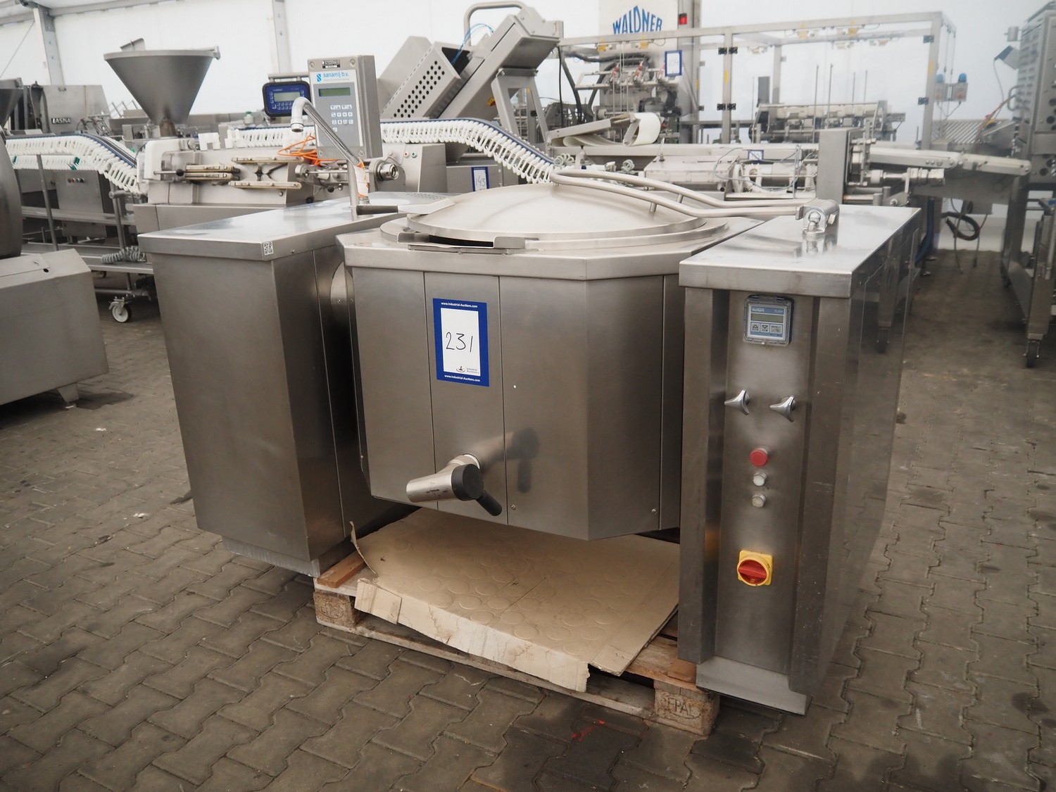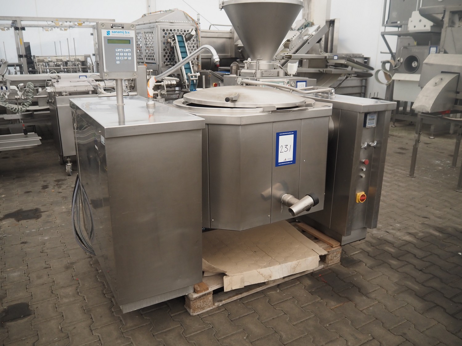 Sanamij water heated tiltable cooking vessel with cooling function and mixing arm, type: Kantelbare kookk., number: 00.106, year of construction: 2000, 230/400 V, 4 kW, 400 V, volume: 200 liter, dimensions: 1850 mm x 1200 mm x 1500 mm.
