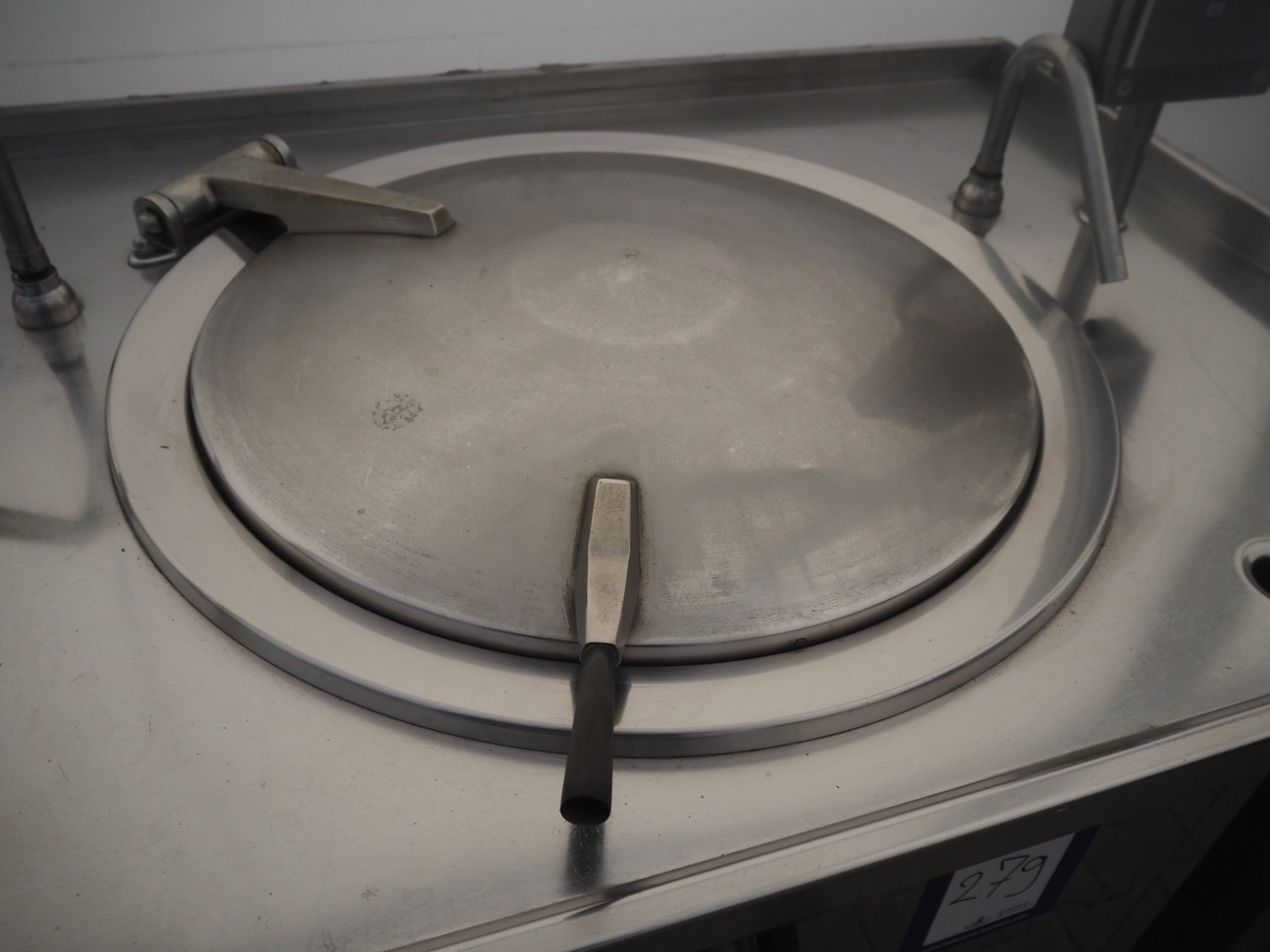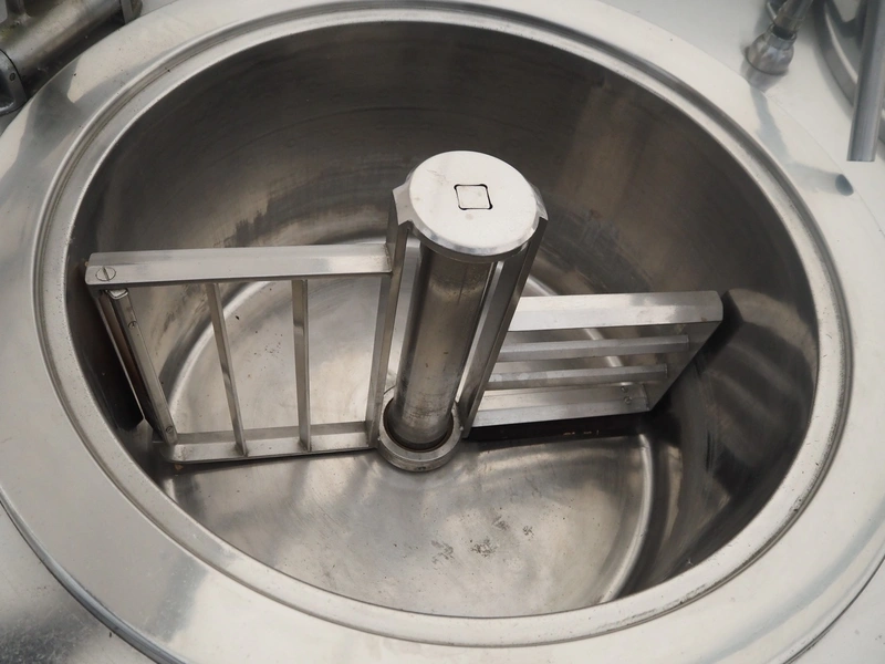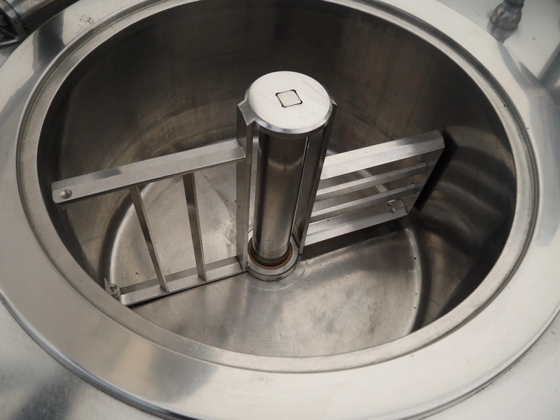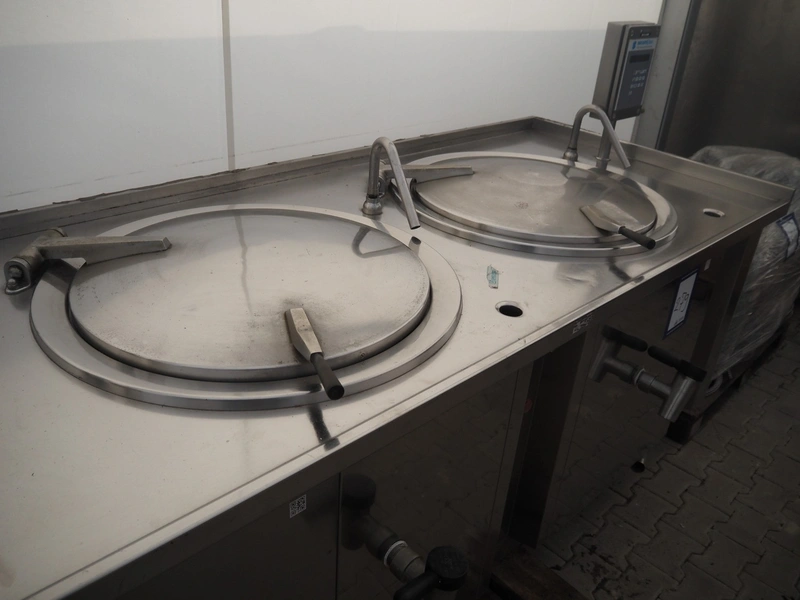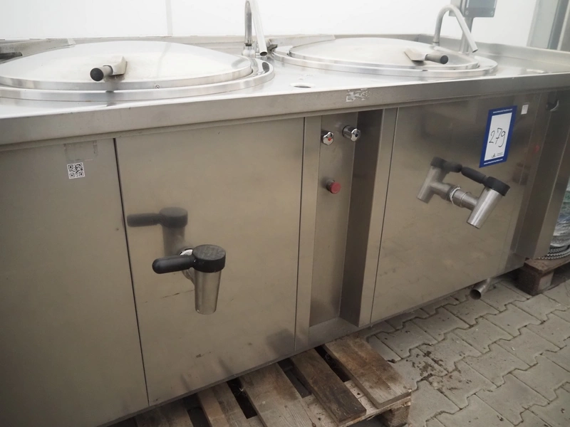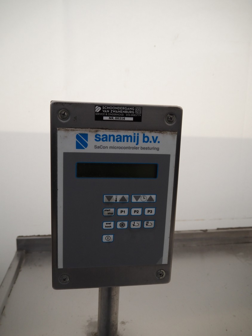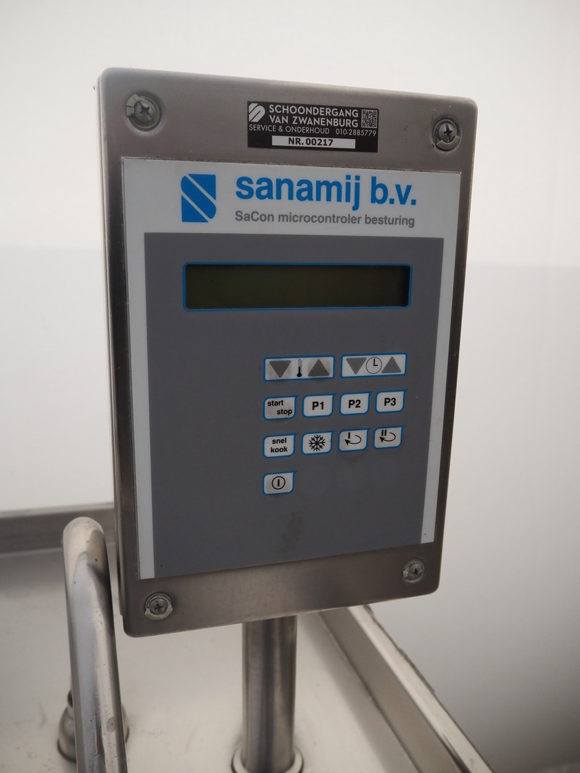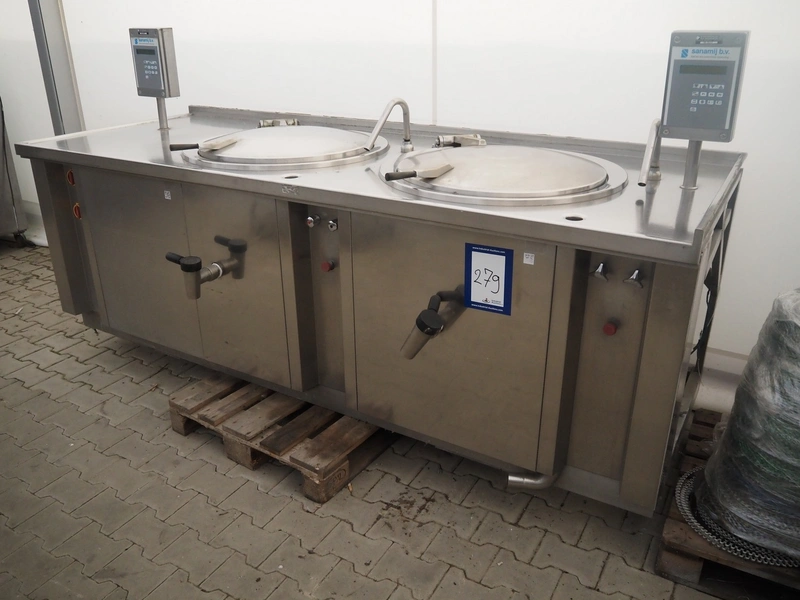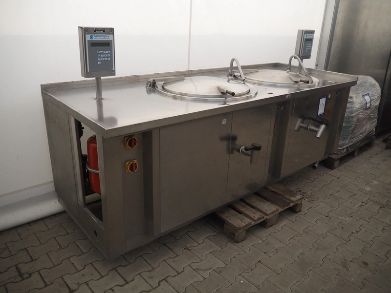 Sanamij double cooking vessel with agitators, type: Kookketel, number: 00.105, year of construction: 2000, 230/400 V, 4 kW, volume: 100 liter, water heated, dimensions: 2710 mm x 1000 mm x 900 mm.