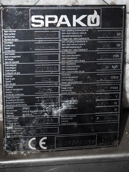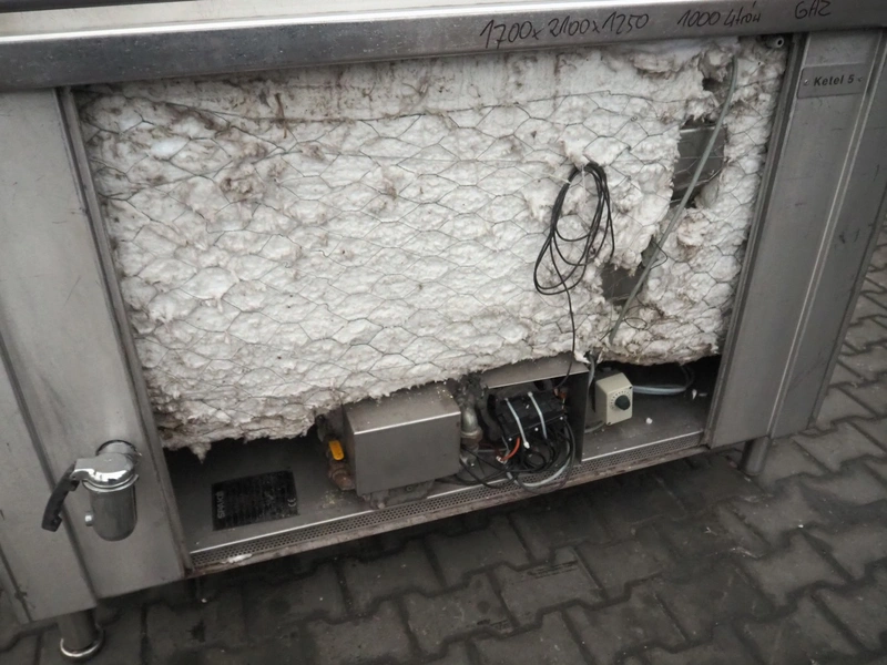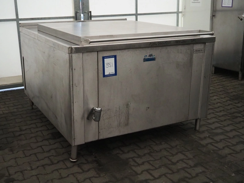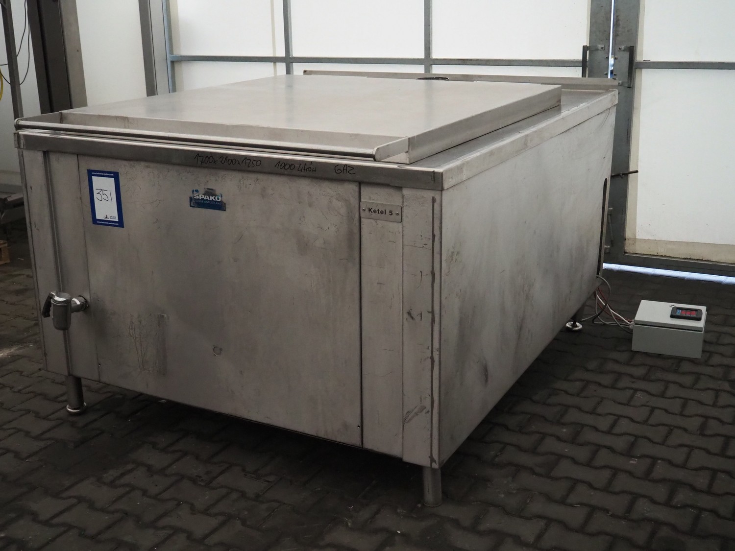 Spako cooking vessel, type: RHV 1100, 230 V, 50 Hz, 130 W, gas heated, volume: 1000 liter, dimensions: 2100 mm x 1700 mm x 1250 mm.
