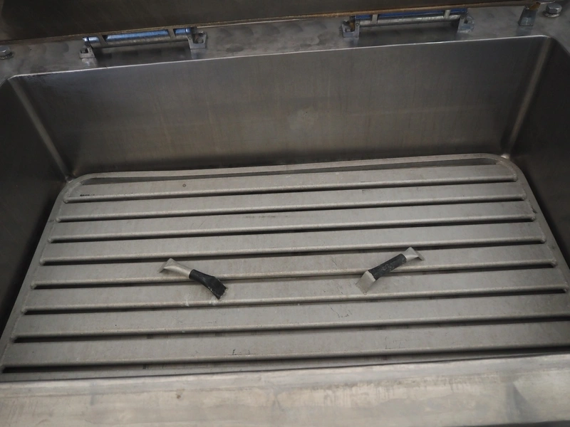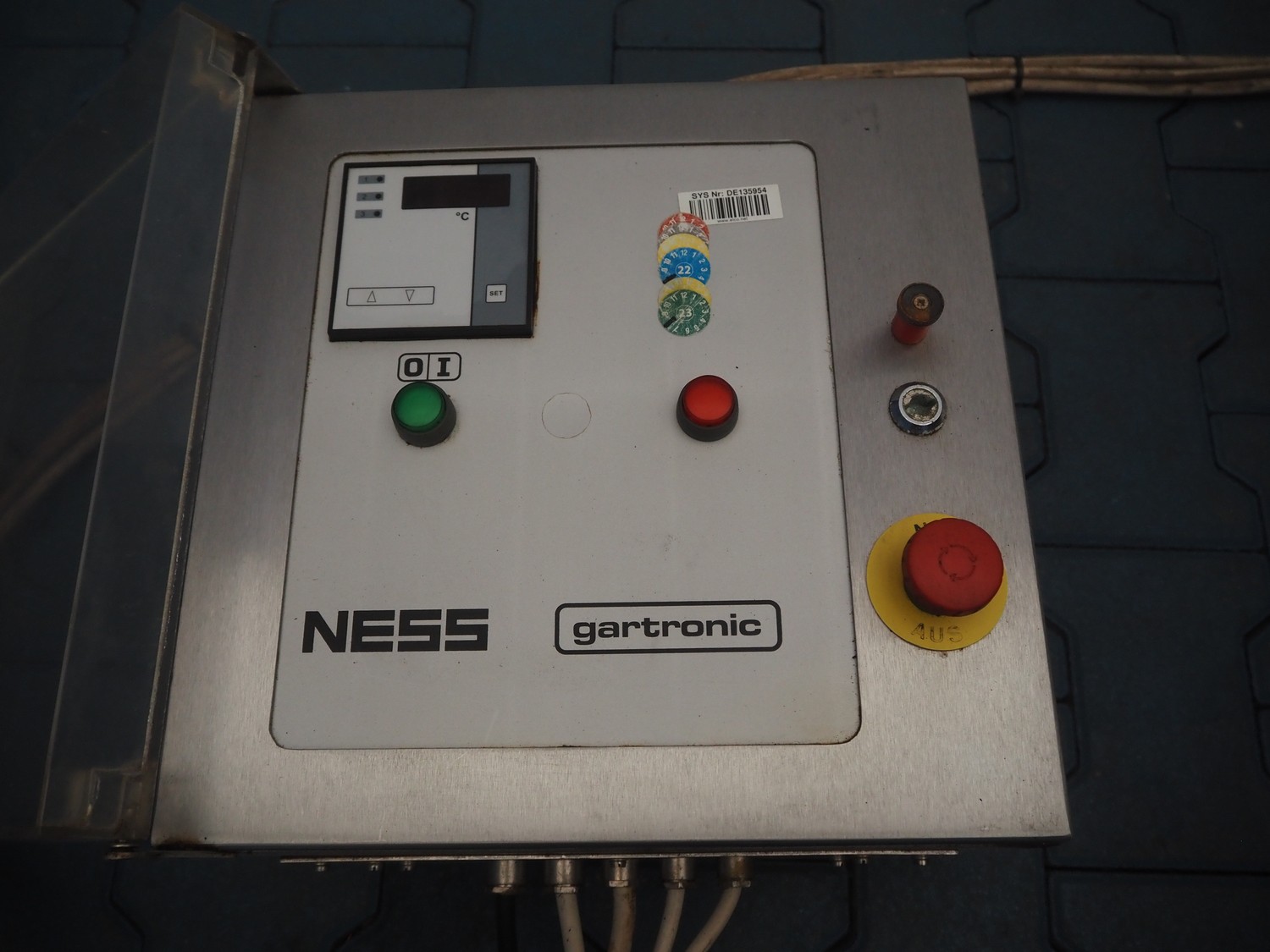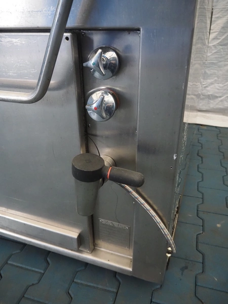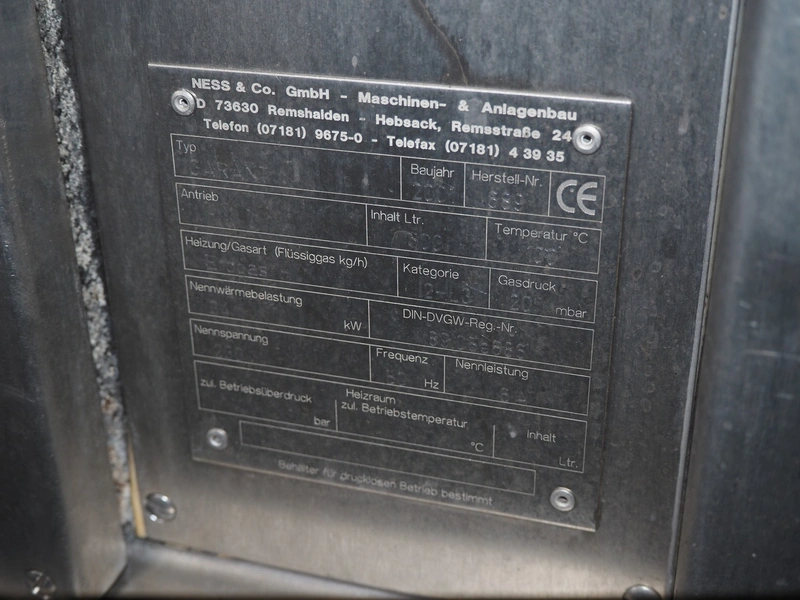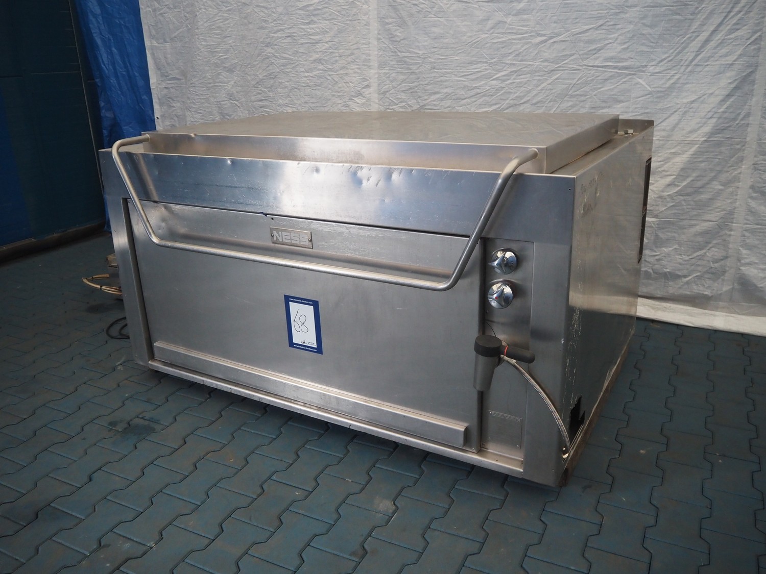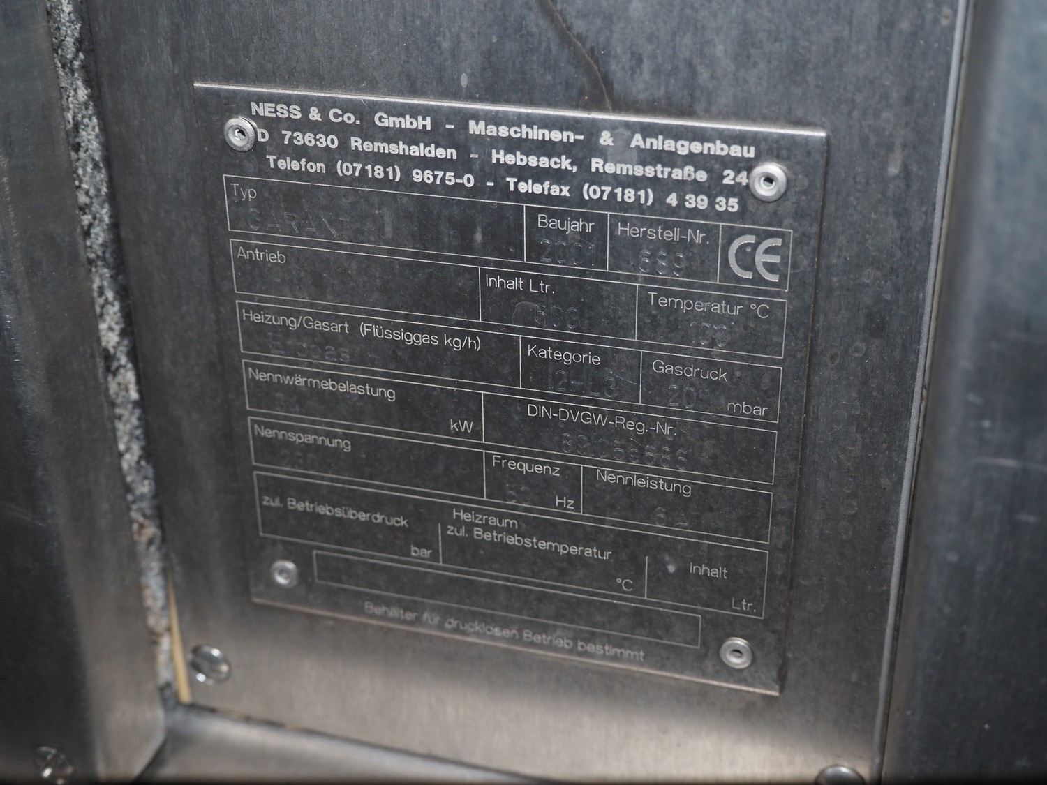 Ness & Co. GmbH cooking vessel, type: Garant, serial number: 689, year of construction: 2001, 230 V, 50 Hz, 6 A, gas heated, volume: 600 liter, inside dimensions: 1540 mm x 910 mm x 430 mm, total dimensions: 1800 mm x 1350 mm x 1100 mm.