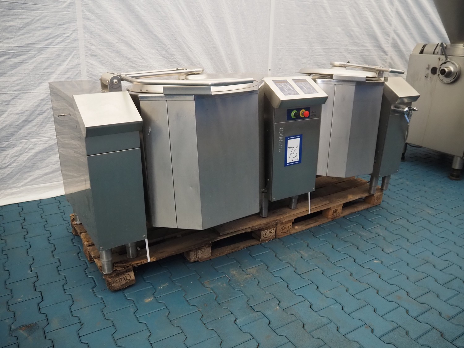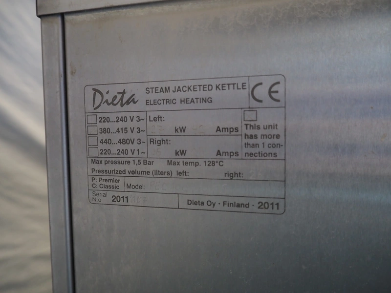 Dieta Oy double tiltable cooking vessel, model: PEC, serial number: 2011, year of construction: 2011, 380-415 V, 3 Ph, 25-42 A, 15-27 kW, inside dimensions: Ø 700 mm x 350 mm and Ø 550 mm x 330 mm, total dimensions: 2450 mm x 950 mm x 1050 mm.