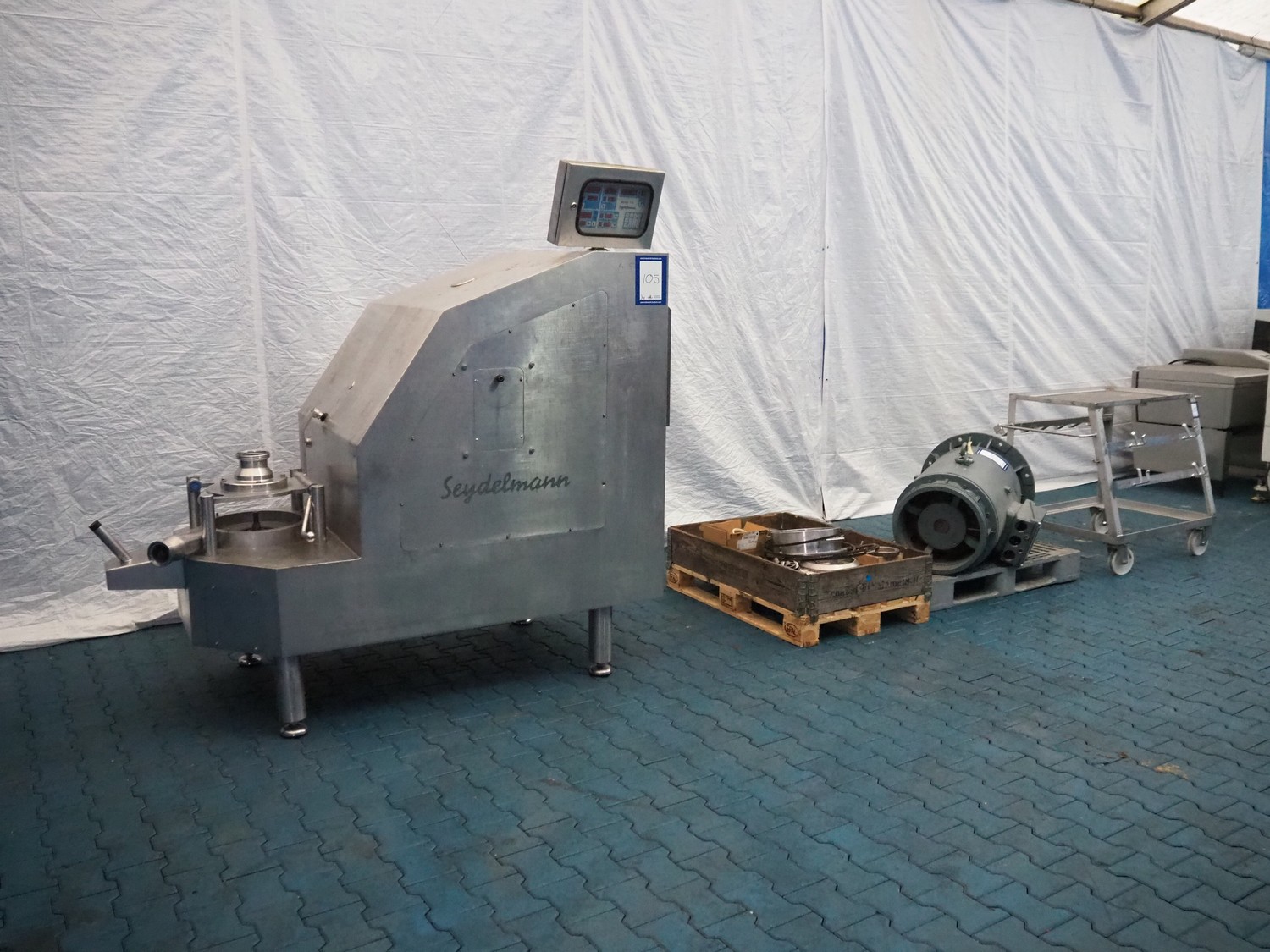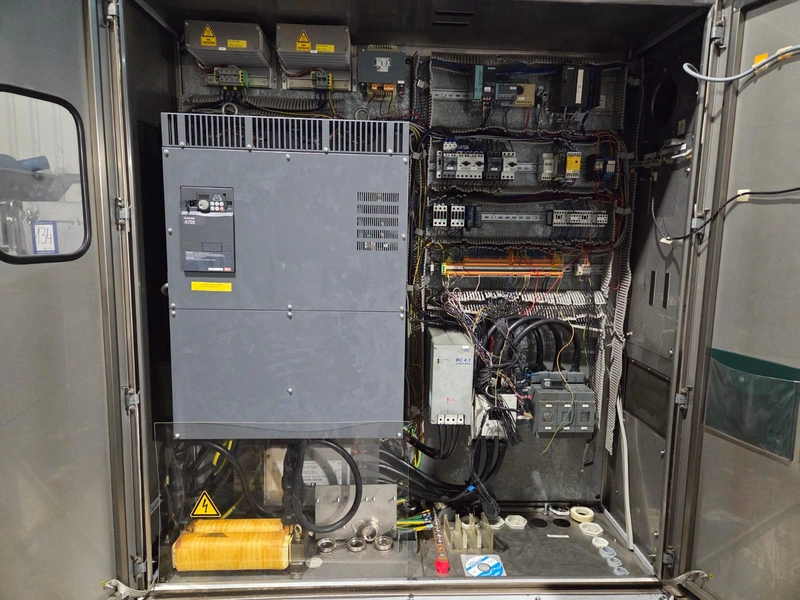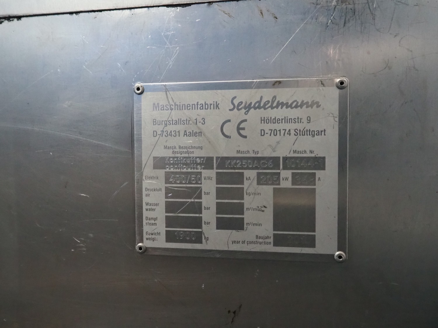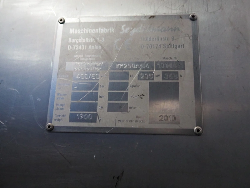 Seydelmann emulsifier, type: KK250AC6, machine number: 10144-1, year of construction: 2010, 400 V, 50 Hz, 368 A, 205 kW, diameter plate: 250 mm, total dimensions: 2400 mm x 1000 mm x 2100 mm. With trolley, switch cabinet and 2 pallets with parts, dimensions trolley: 1200 mm x 800 mm x 1000 mm. Technical condition unknown.