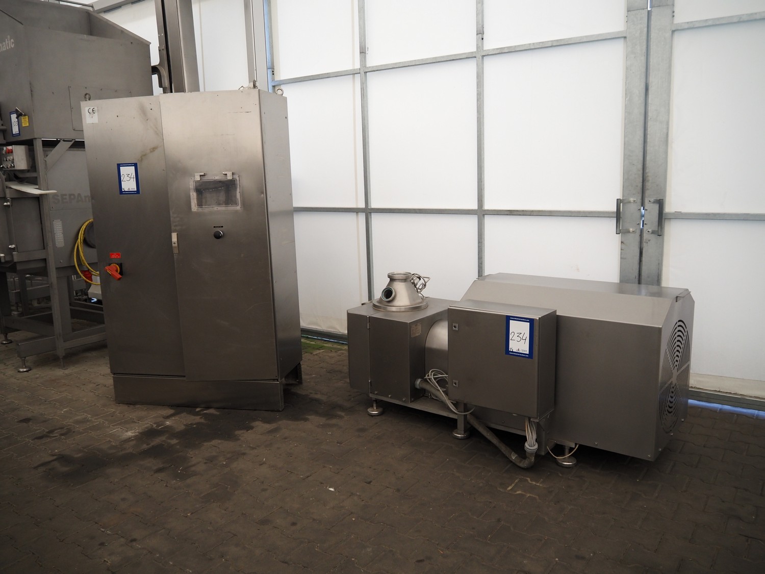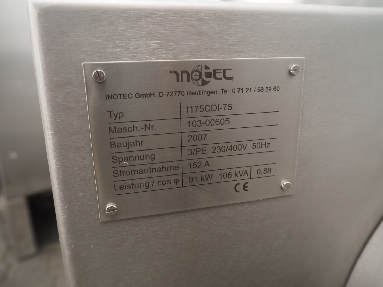 Inotec GmbH emulsifier, type: I175CDI-75, machine number: 103-00605, year of construction: 2007, 230/400 V, 50 Hz, 152 A, 91 kW, 106 kVA, dimensions: 2000 mm x 900 mm x 850 mm. With s/s switch cabinet, dimensions: 1200 mm x 600 mm x 2100 mm. Missing knife set, technical condition unknown.