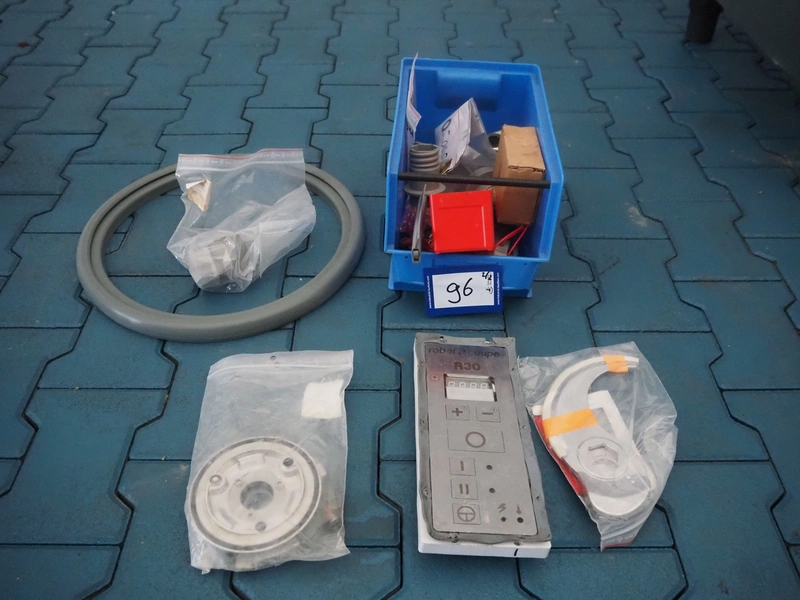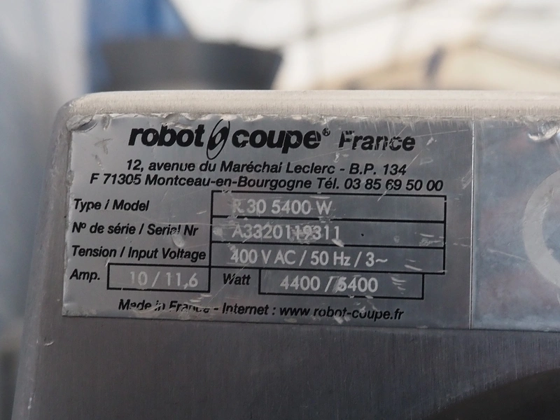 Robot Coupe universal machine, type: R 30 5400 W, serial number: A3320119311, 400 VAC, 3 Ph, 50 Hz, 10/11.6 A, 4400 Watt, volume: 30 liter, dimensions: 730 mm x 590 mm x 1240 mm. Including extra parts.