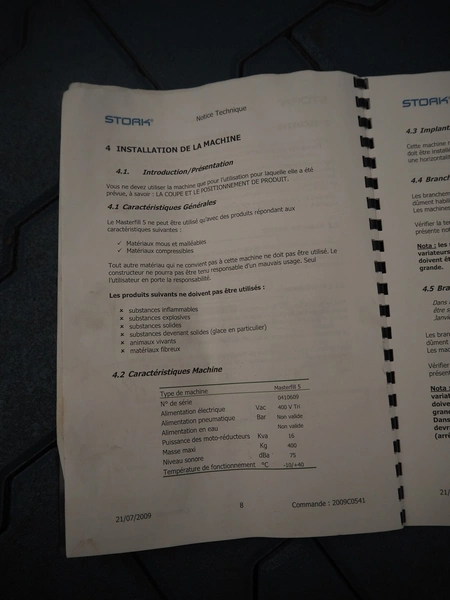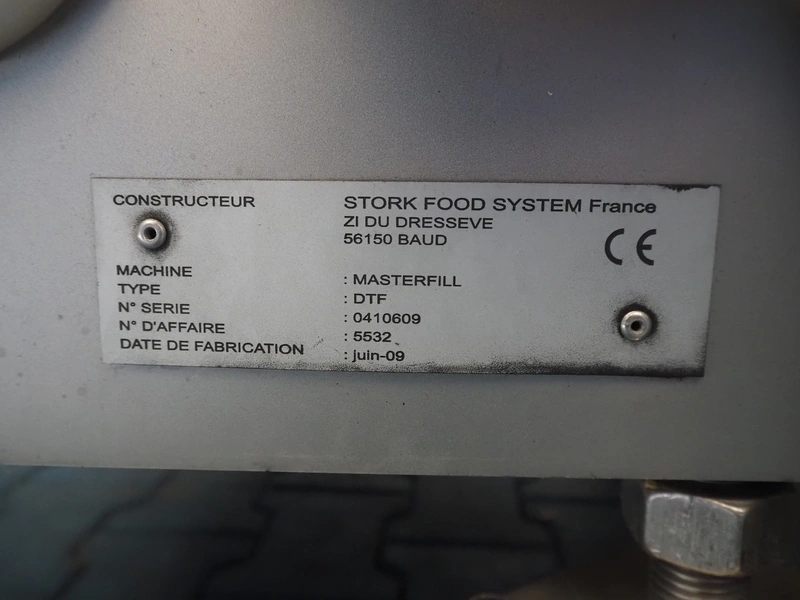 Stork Food System mobile 5-heads filling machine, model: Masterfill, type: DTF, serial number: 0410609, year of construction: 2009, 400 V, 16 kW, temperature: -10/+ 40 ° Celsius, dimensions: 1500 mm x 935 mm x 1780 mm.