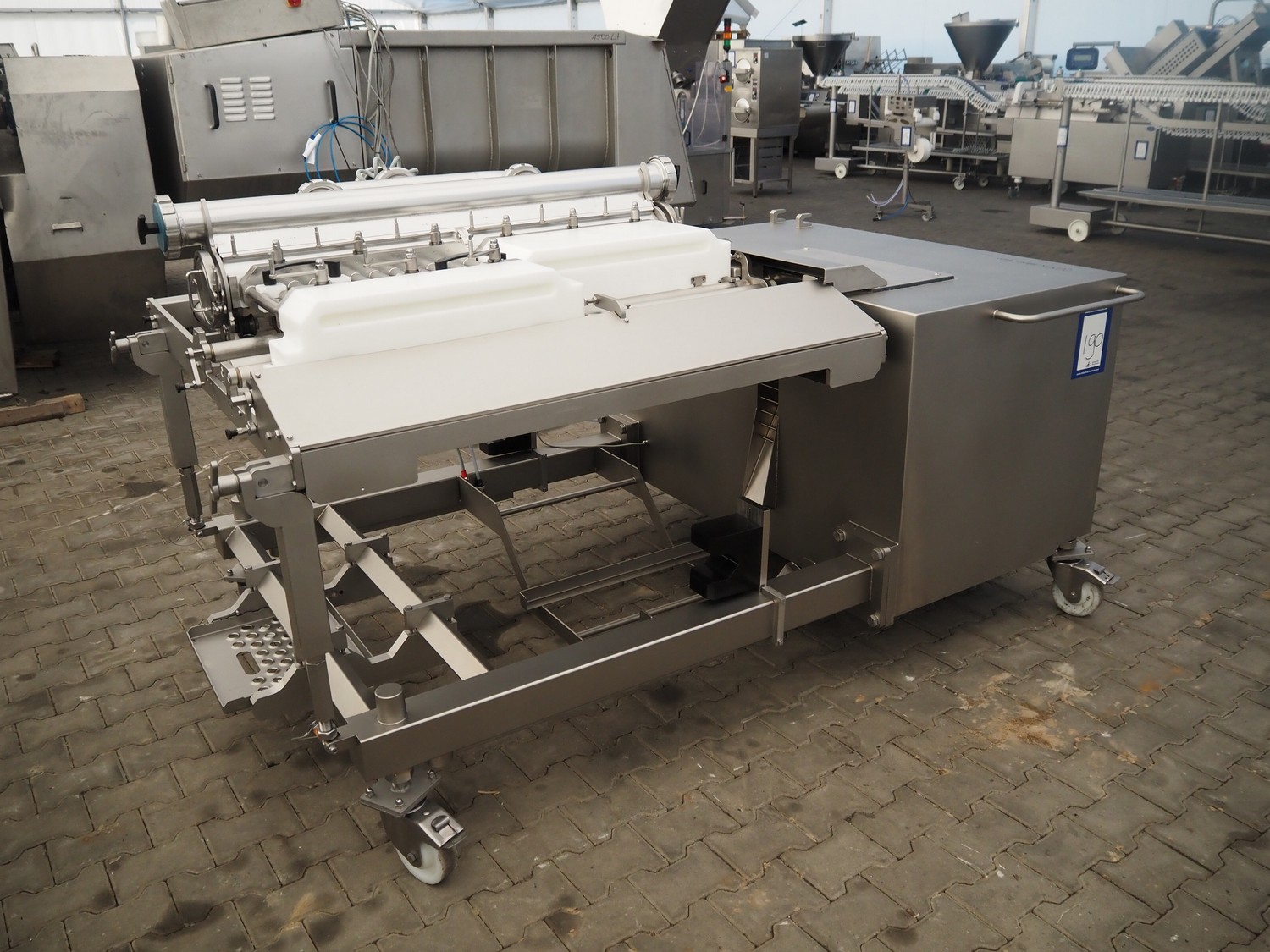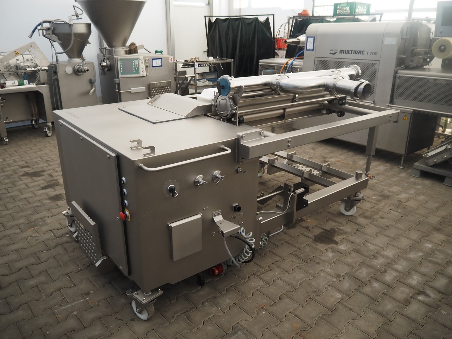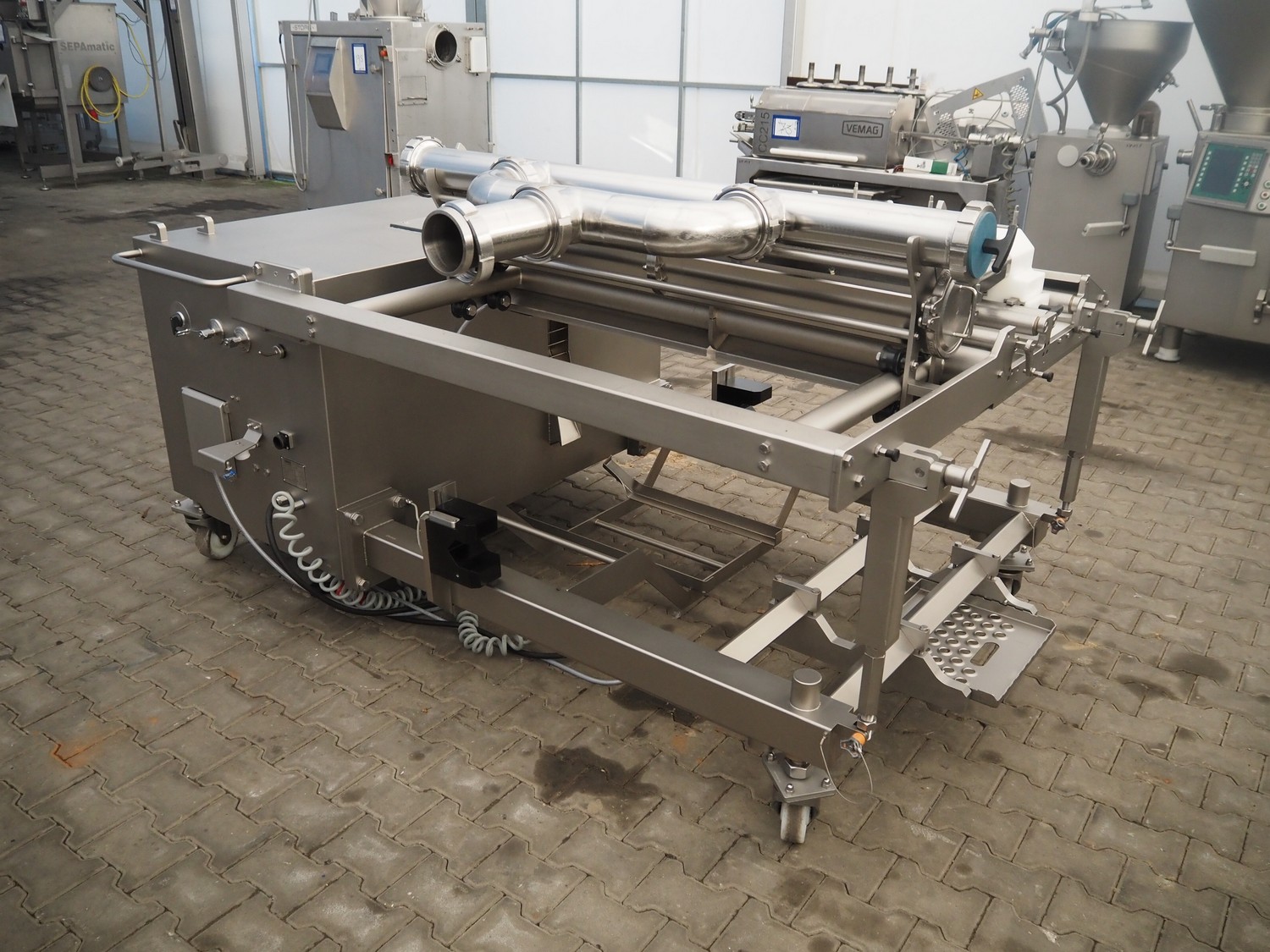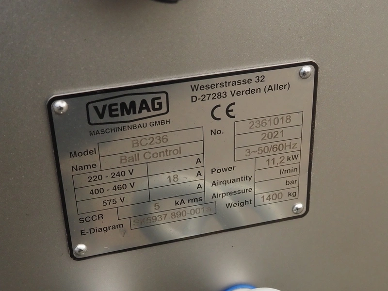 Vemag mobile meat ball forming machine, model: BC236, name: Ball Control, number: 2361018, year of construction: 2021, 400-460 V, 3 Ph, 50/60 Hz, 18 A, 11.2 kW, 1400 kg, (2x) 12 lanes, meat ball weight: up to 20 g, dimensions meat ball: maximum Ø 30 mm or rolls: 30 mm x 120 mm, total dimensions: 1620 mm x 2500 mm x 1300 mm.