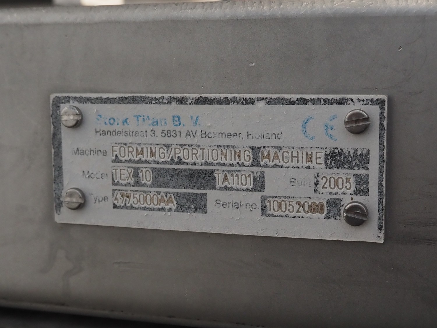 Stork Titan B.V. mobile forming/portioning machine, model: TEX 10 TA1101, type: 4775000AA, serial number: 10052060, year of construction: 2005, dimensions: 1050 mm x 1300 mm x 2440 mm. Incomplete.