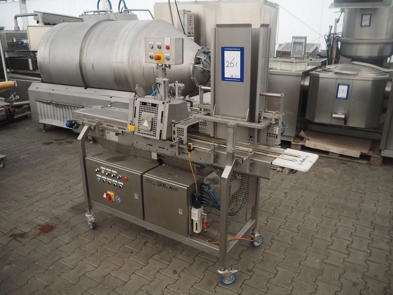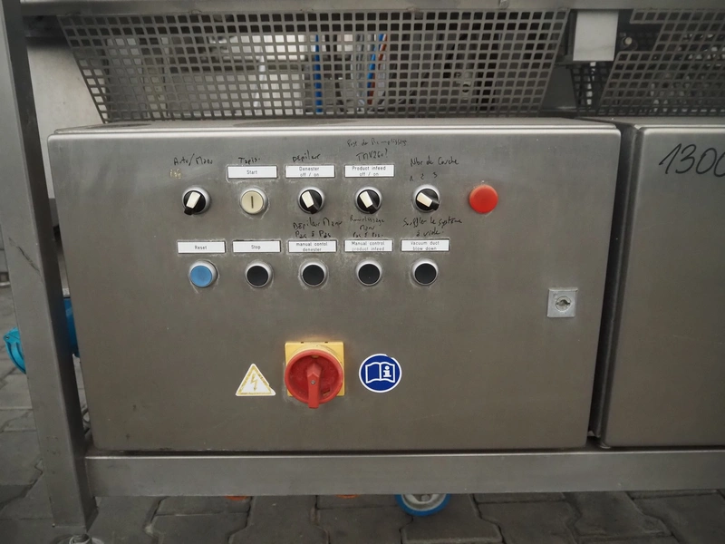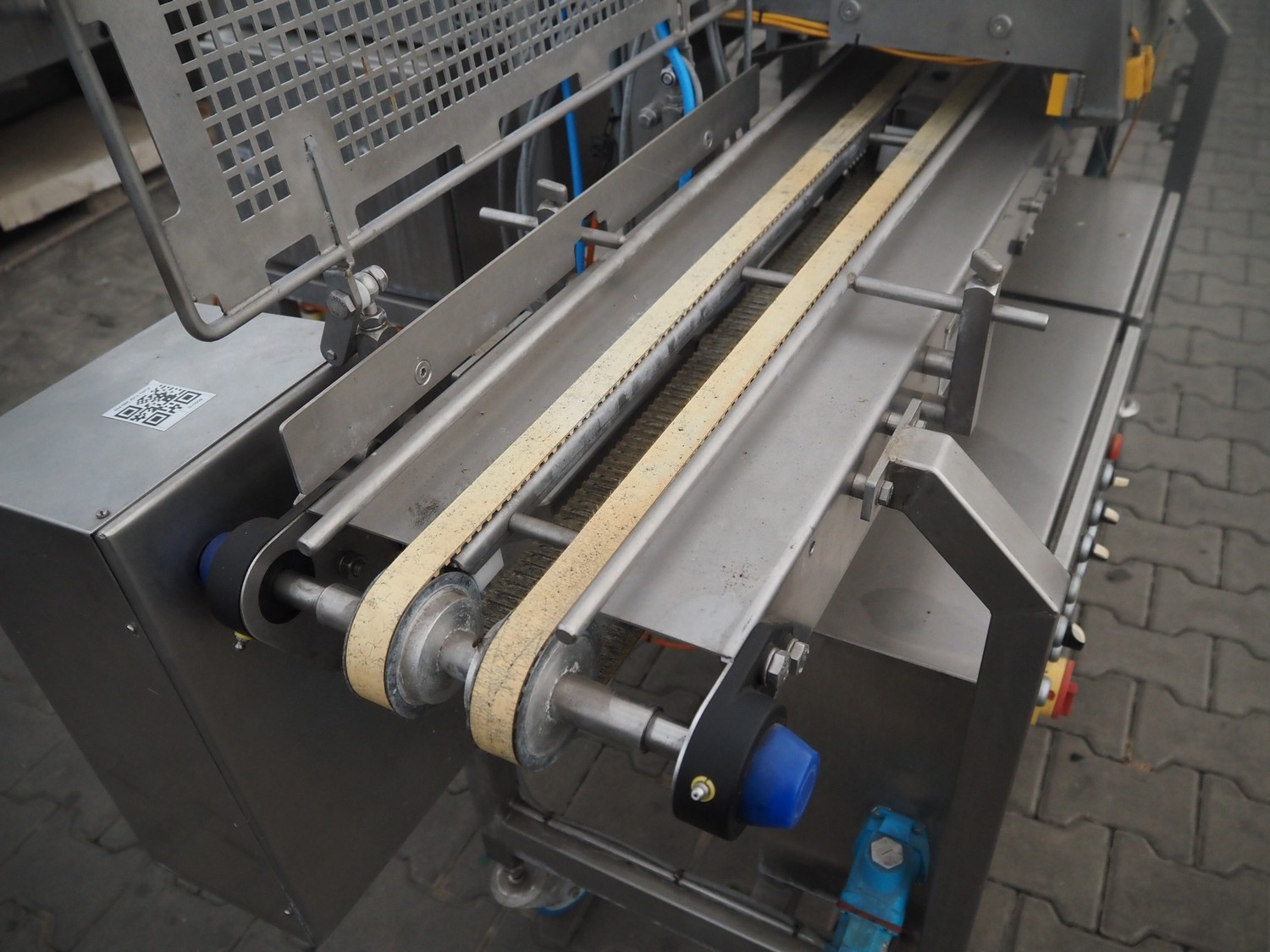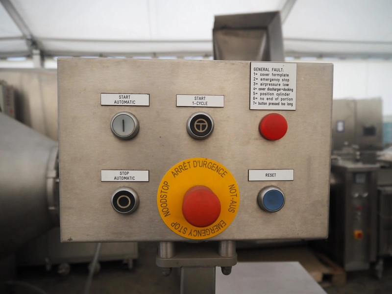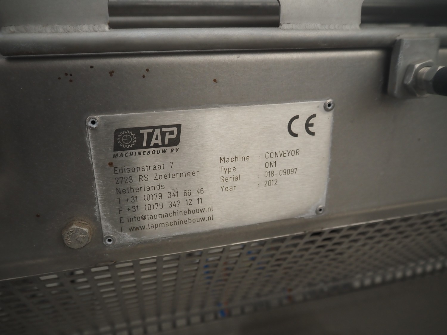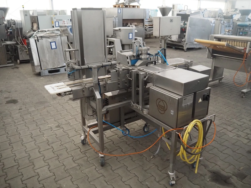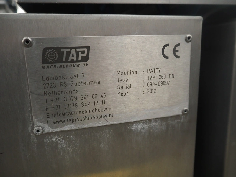 Risco / TAP Machinebouw BV mobile hamburger forming machine with denester, type forming machine: TVM260 PN, serial number: 090-09097, year of construction: 2012, dye: (2x) Ø 100 mm, plastic belt, belt width: (2x) 25 mm and 110 mm, total dimensions: 2000 mm x 1200 mm x 1660 mm.
