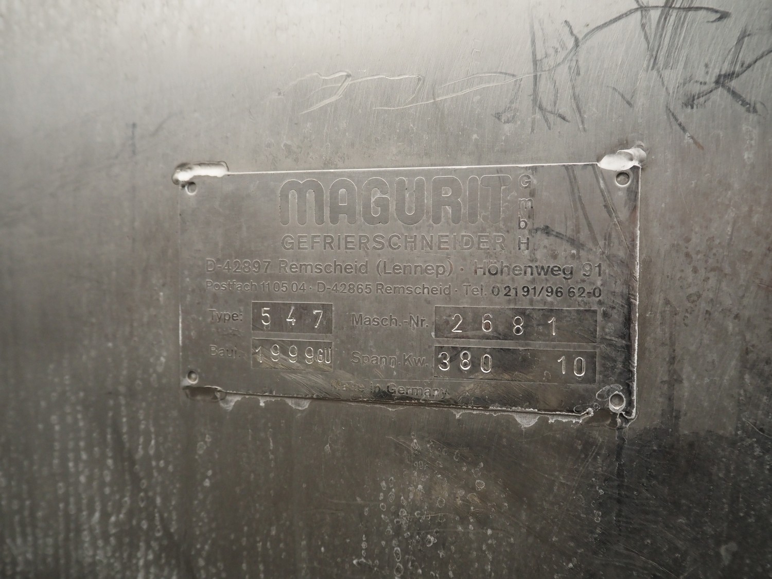 Magurit frozen block cutter, type: 547, machine number: 2681, year of construction: 1999, 380 V, 10 kW, working width: 700 mm, total dimensions: 2700 mm x 1250 mm x 2300 mm.