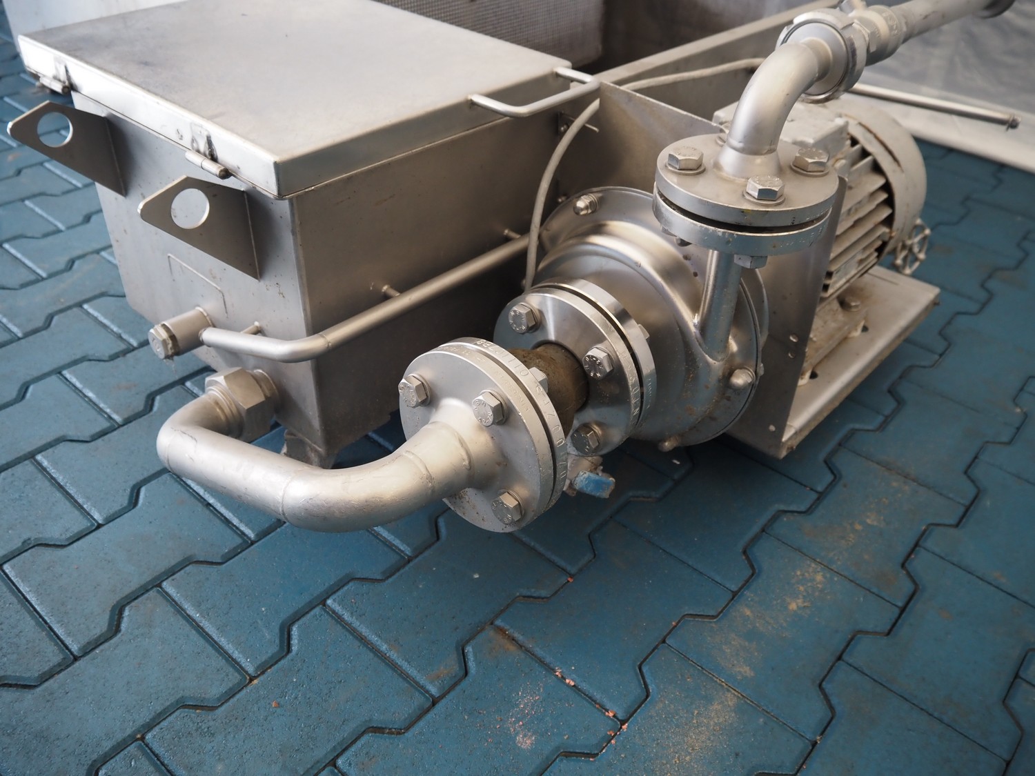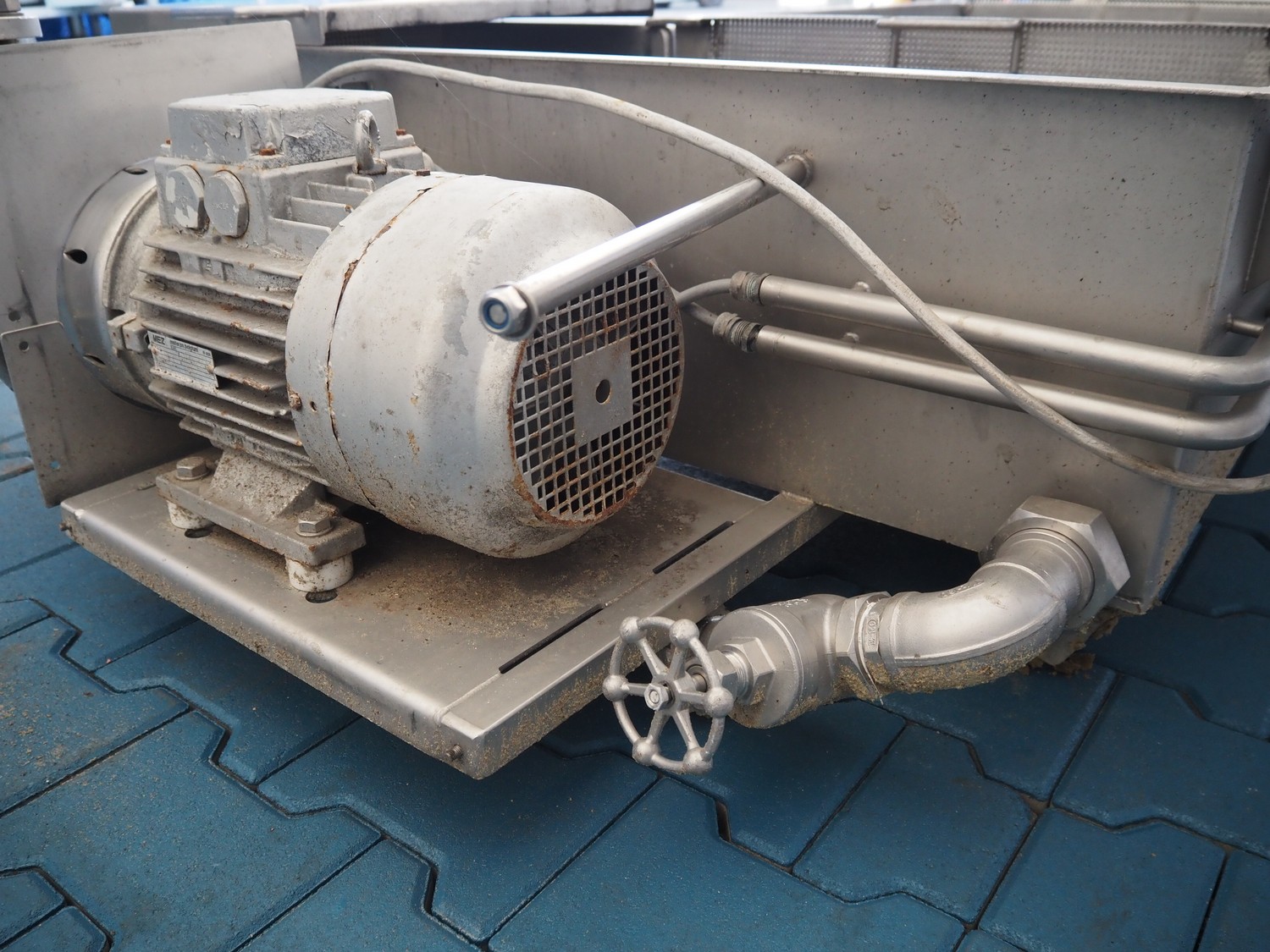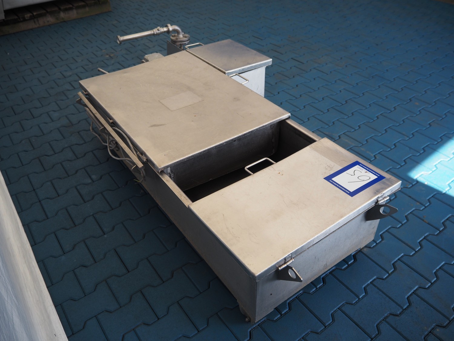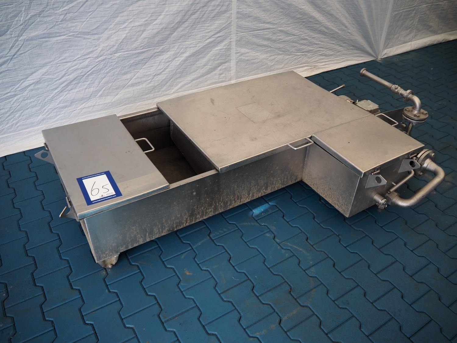 Mobile s/s filter tub for injector, dimensions: 2000 mm x 1200 mm x 520 mm.